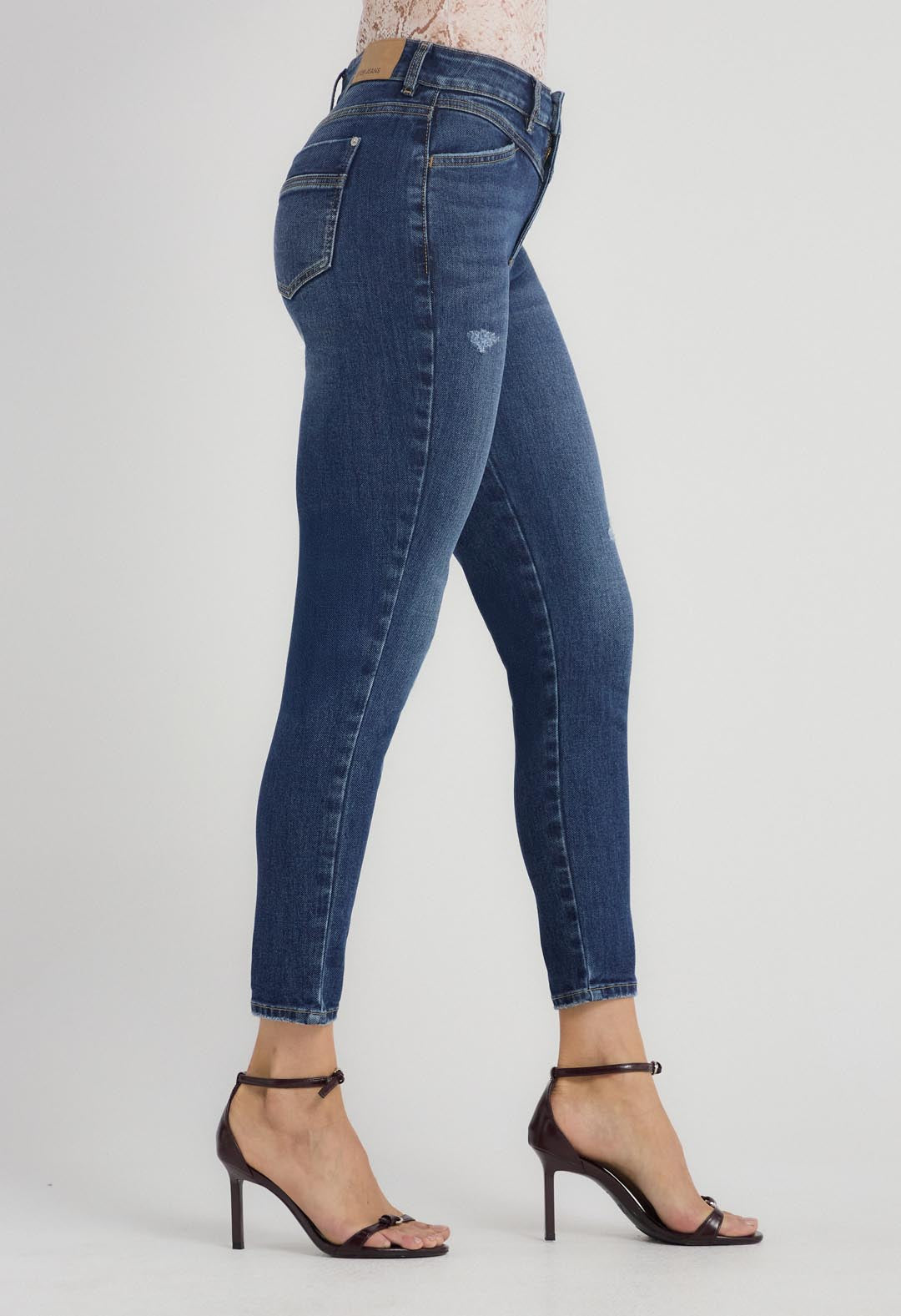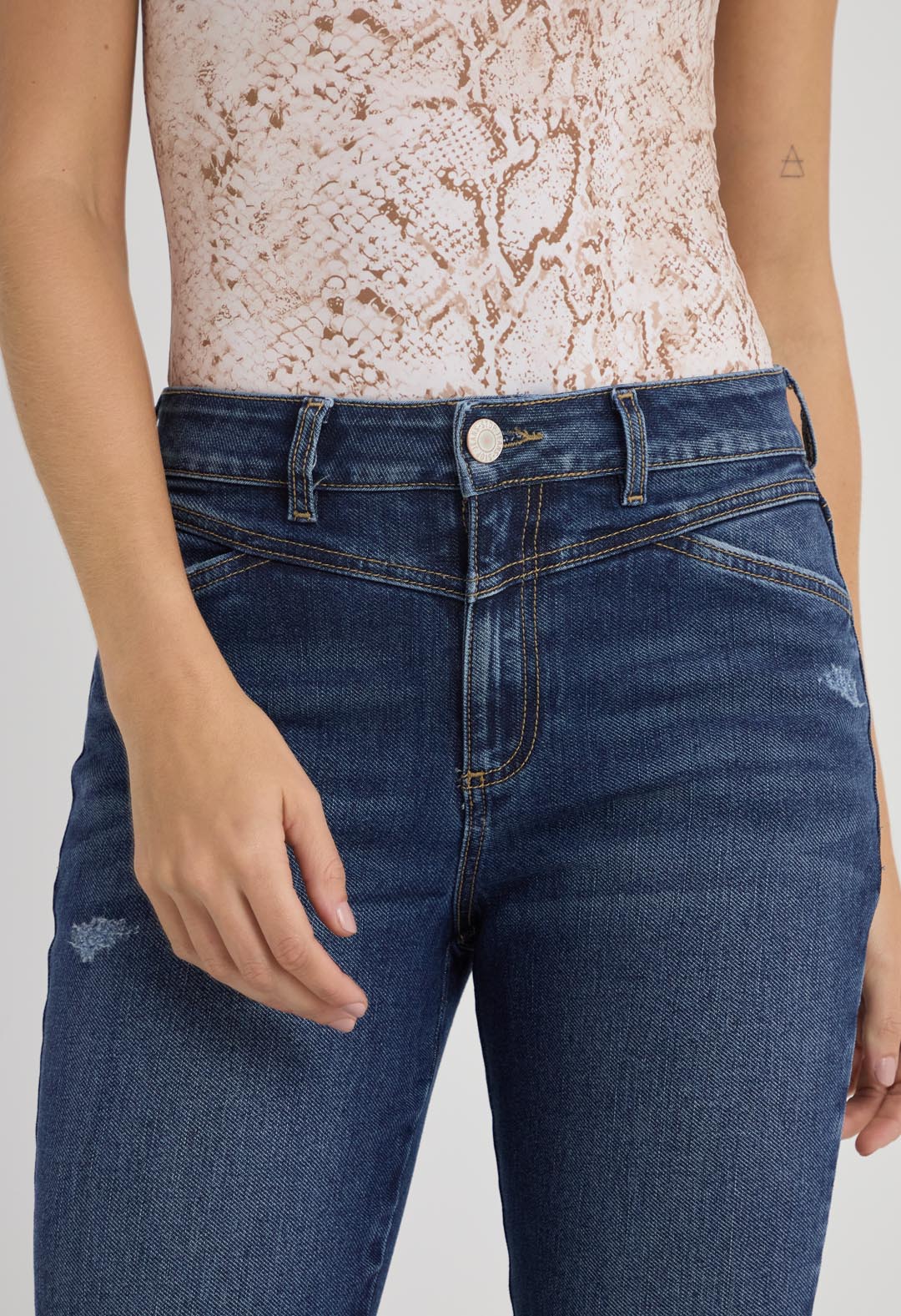 Jean vaquero medio oscuro con corte en delantero para mujer.