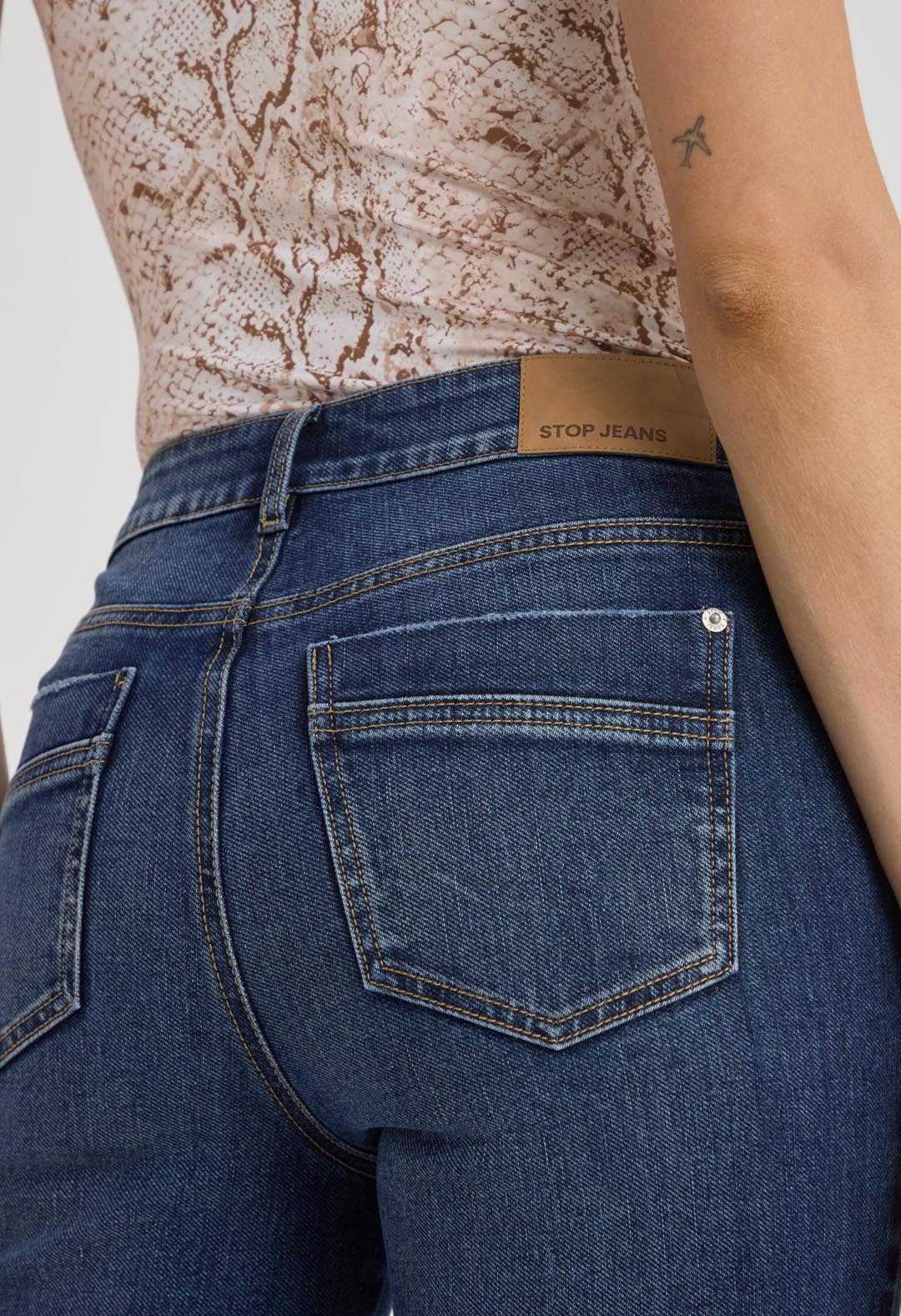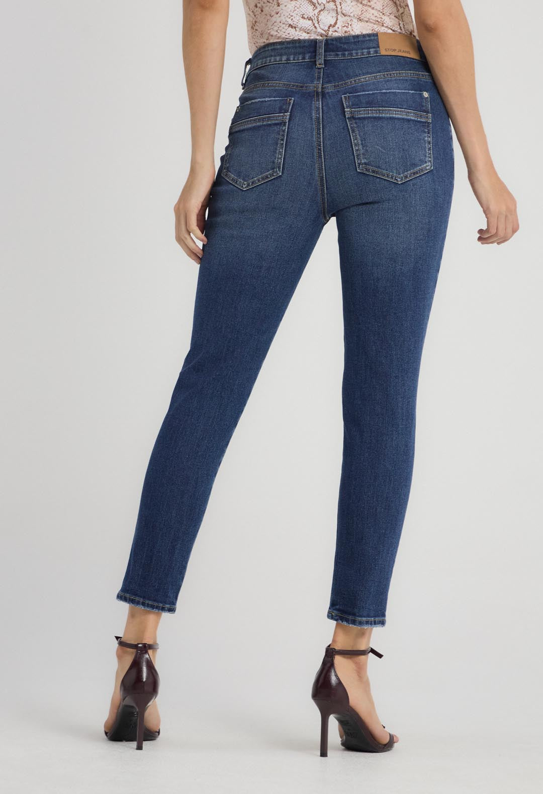 Jean vaquero, tiro alto, lavado medio oscuro, corte en delantero y fondo entero para mujer.