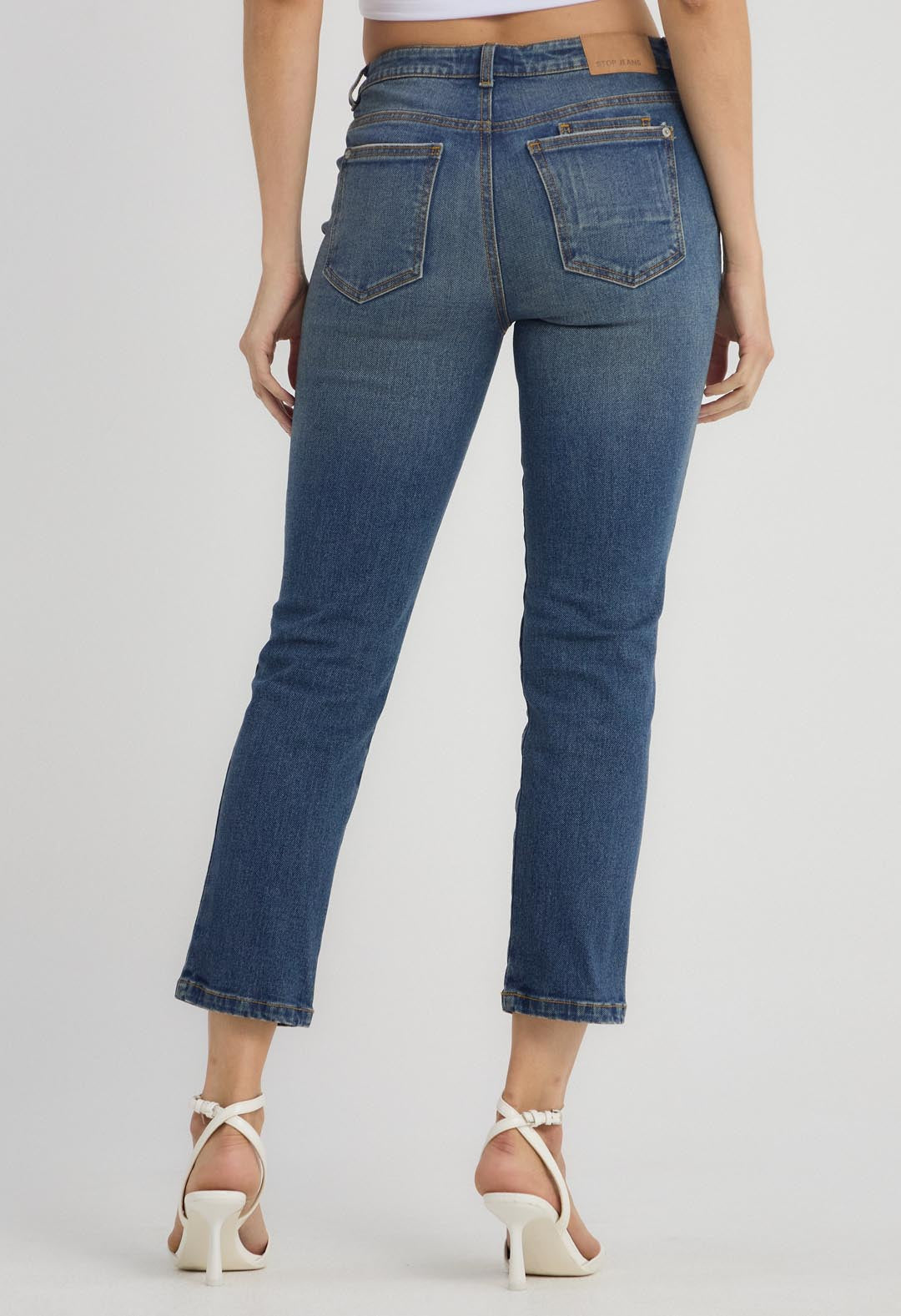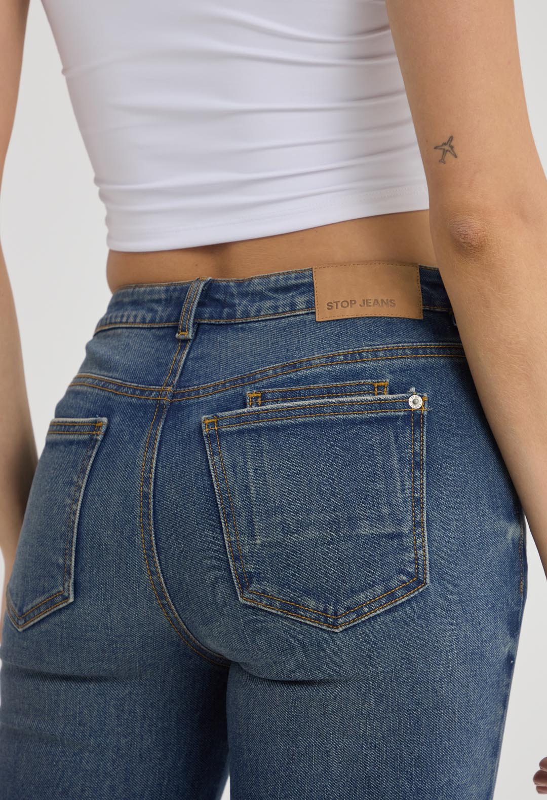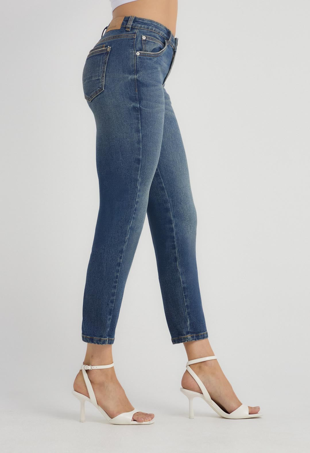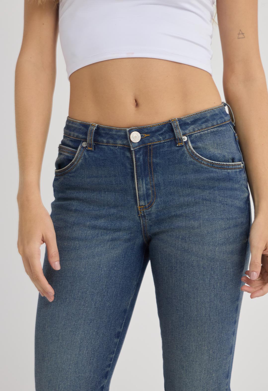 Jean vaquero, tiro medio, lavado medio oscuro, tobillero y fondo entero para mujeres.