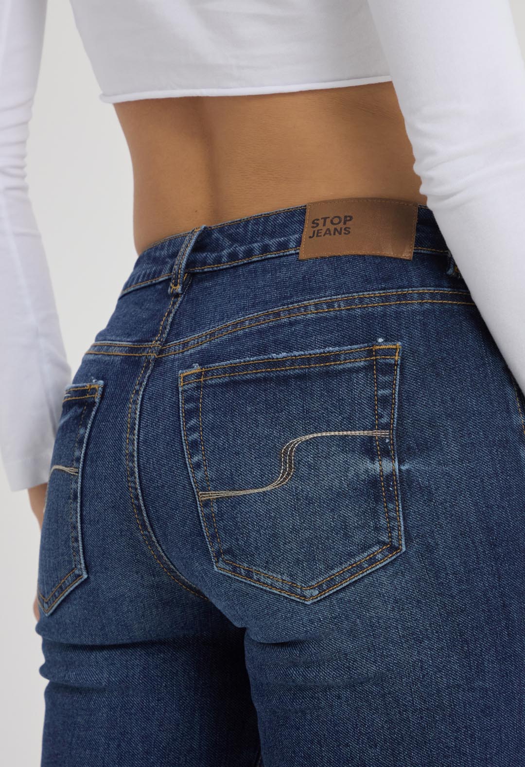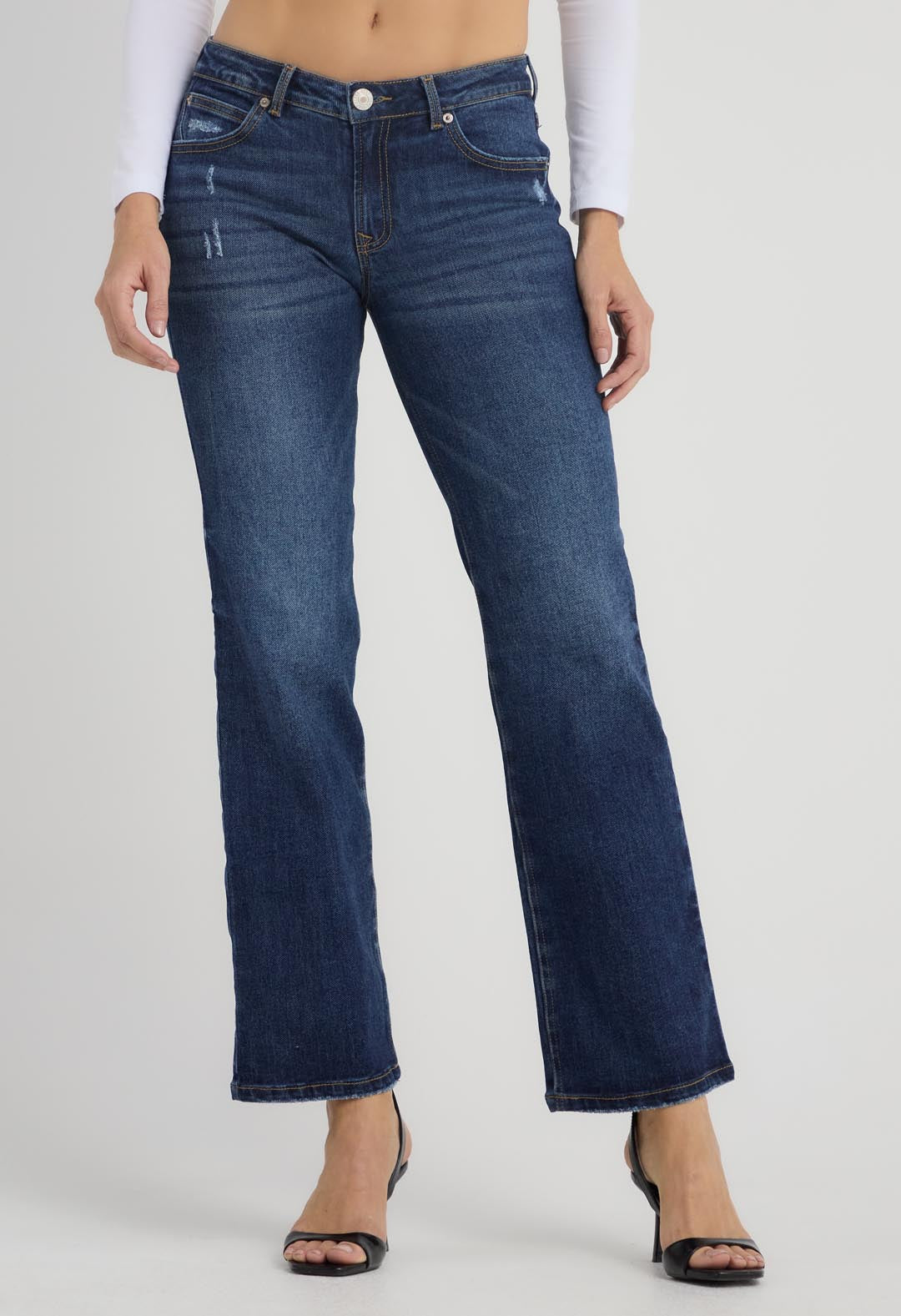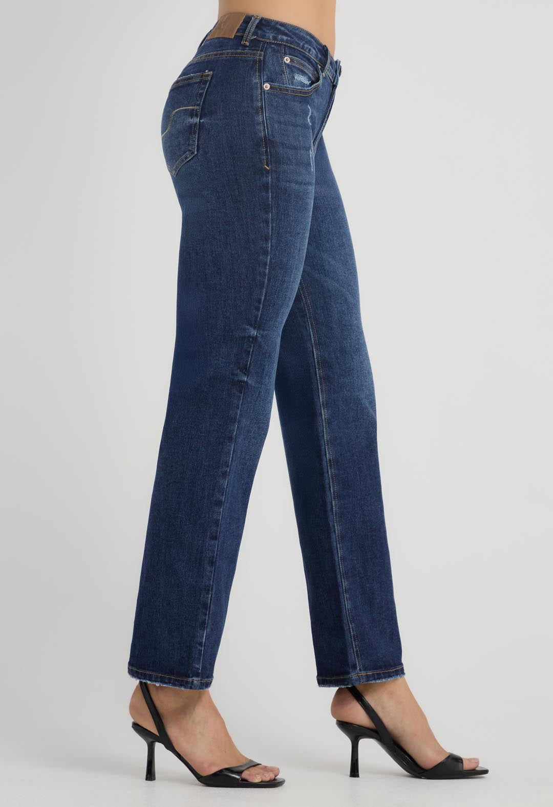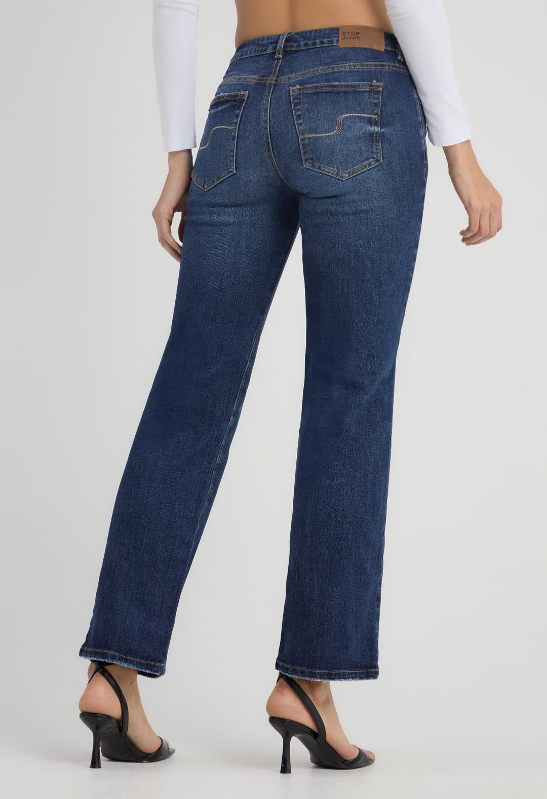 Jean vaquero, lavado oscuro, descaderado, bota recta, fondo entero, bolsillos delanteros y posteriores funcionales