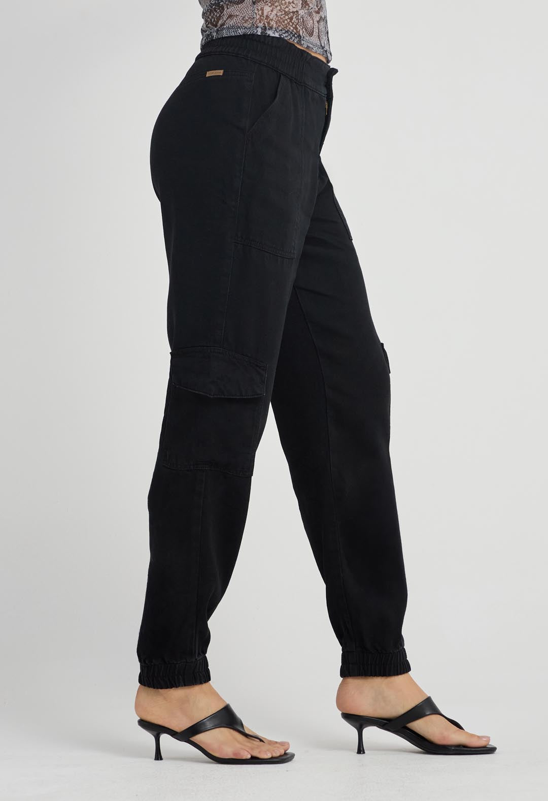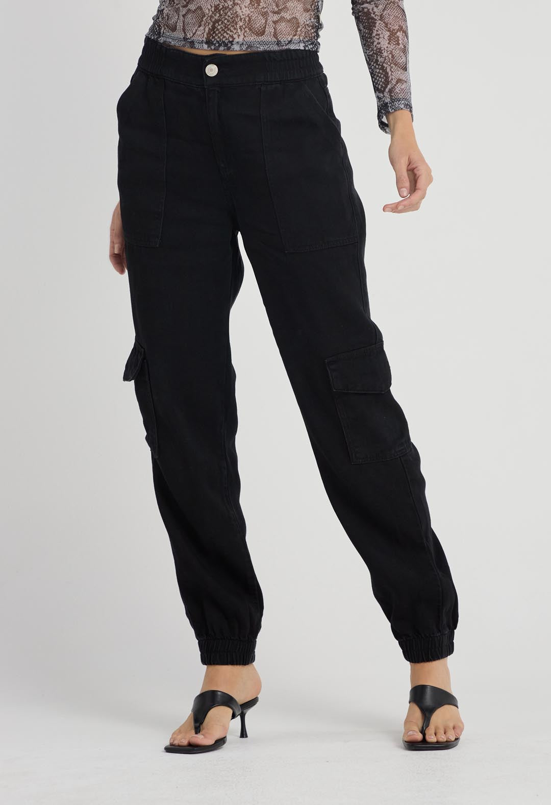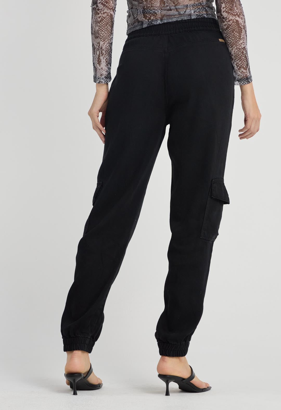 Jogger tiro alto, color negro, con elástico en bota y fondo entero para mujer.