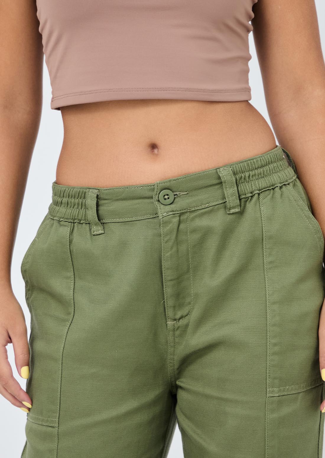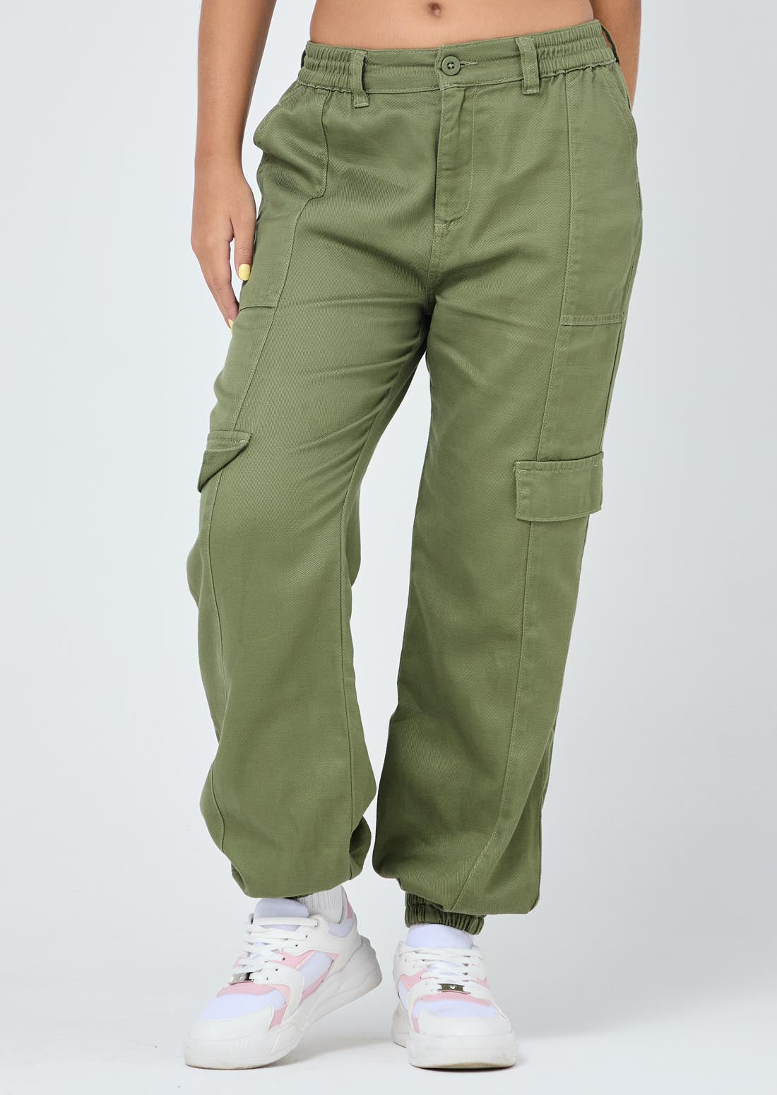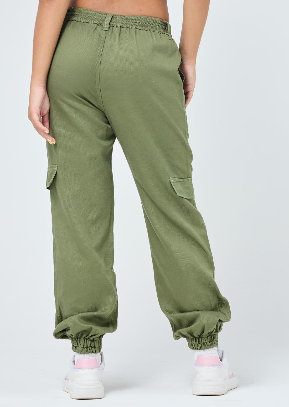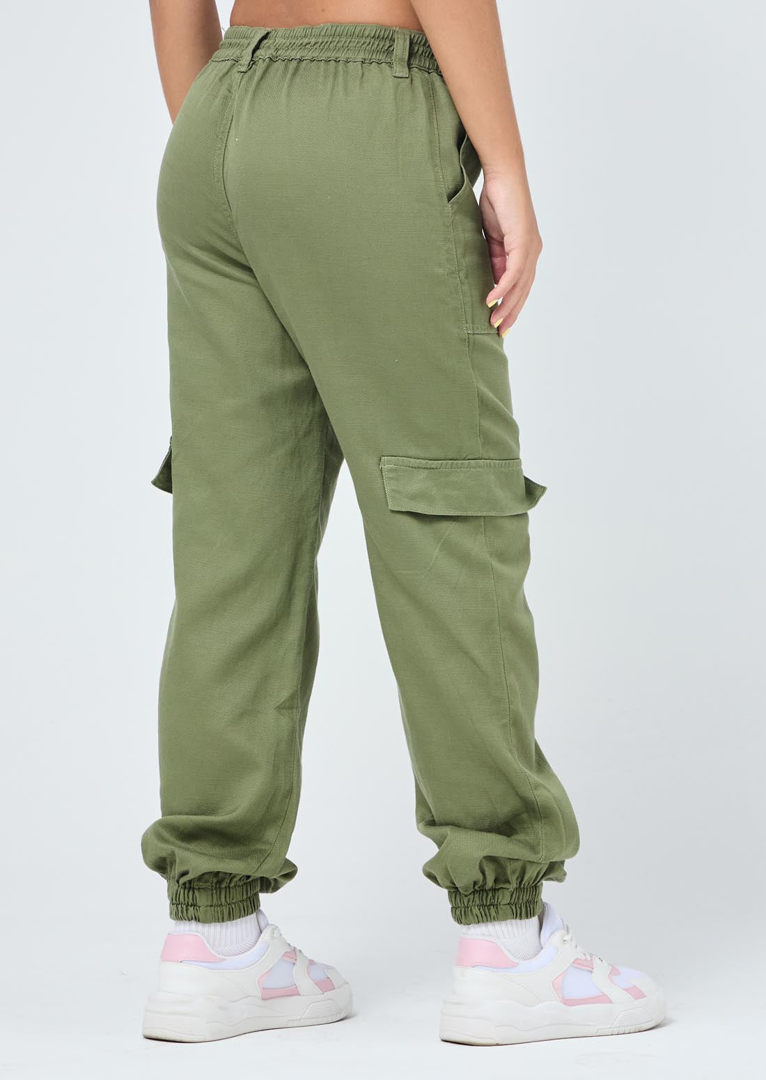 Jogger tiro alto, color verde militar, cortes en frente, bolsillo tipo parche y fondo entero para jóvenes.