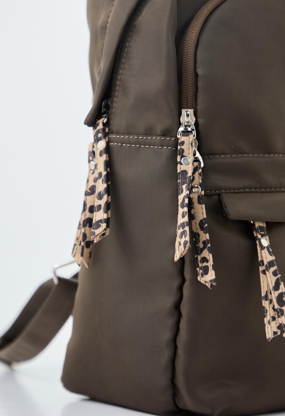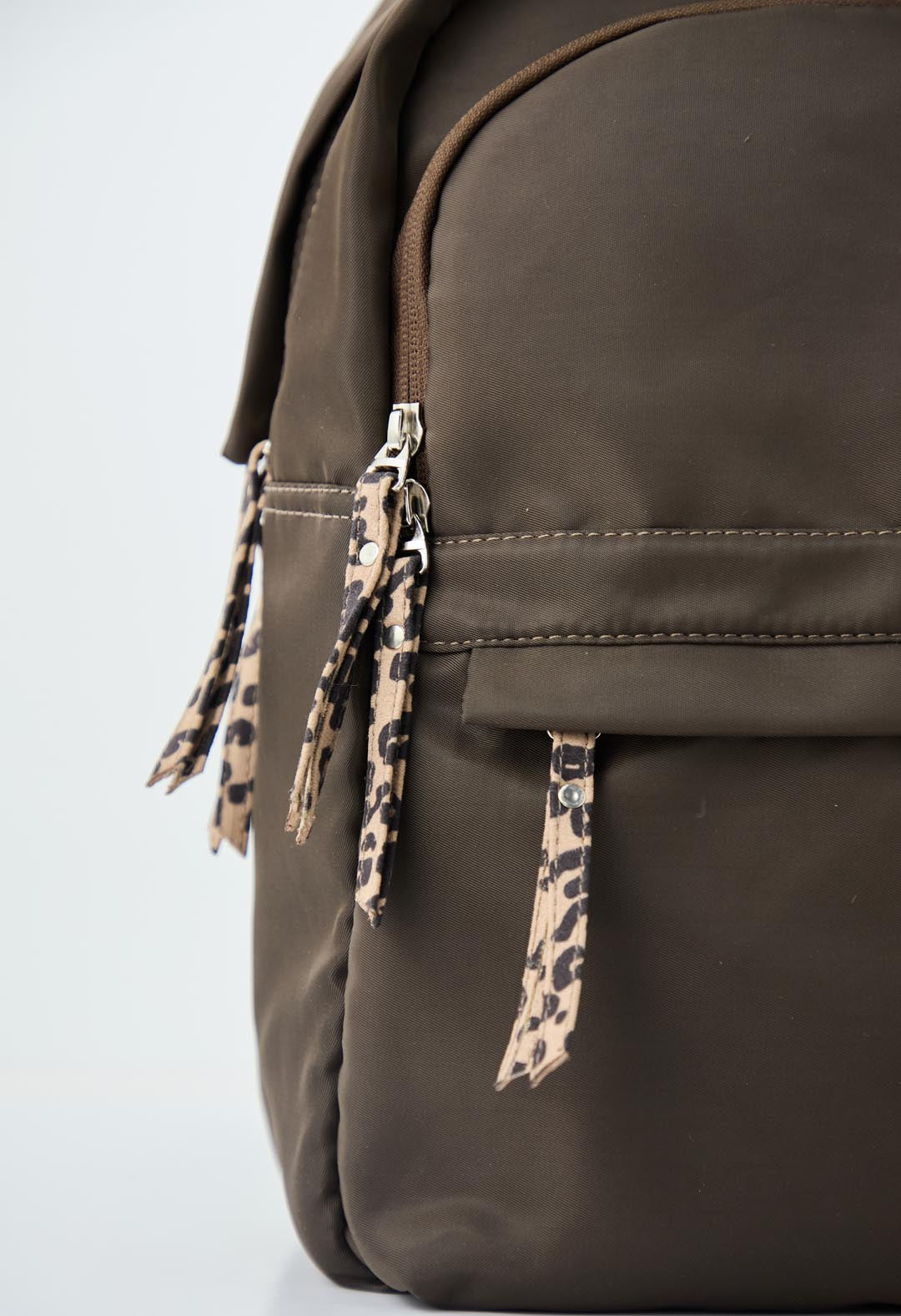 Exterior: Lona nylon, poliéster 100% tono café con sliders en sintético animal print.Interior: Forro poliéster 100%.