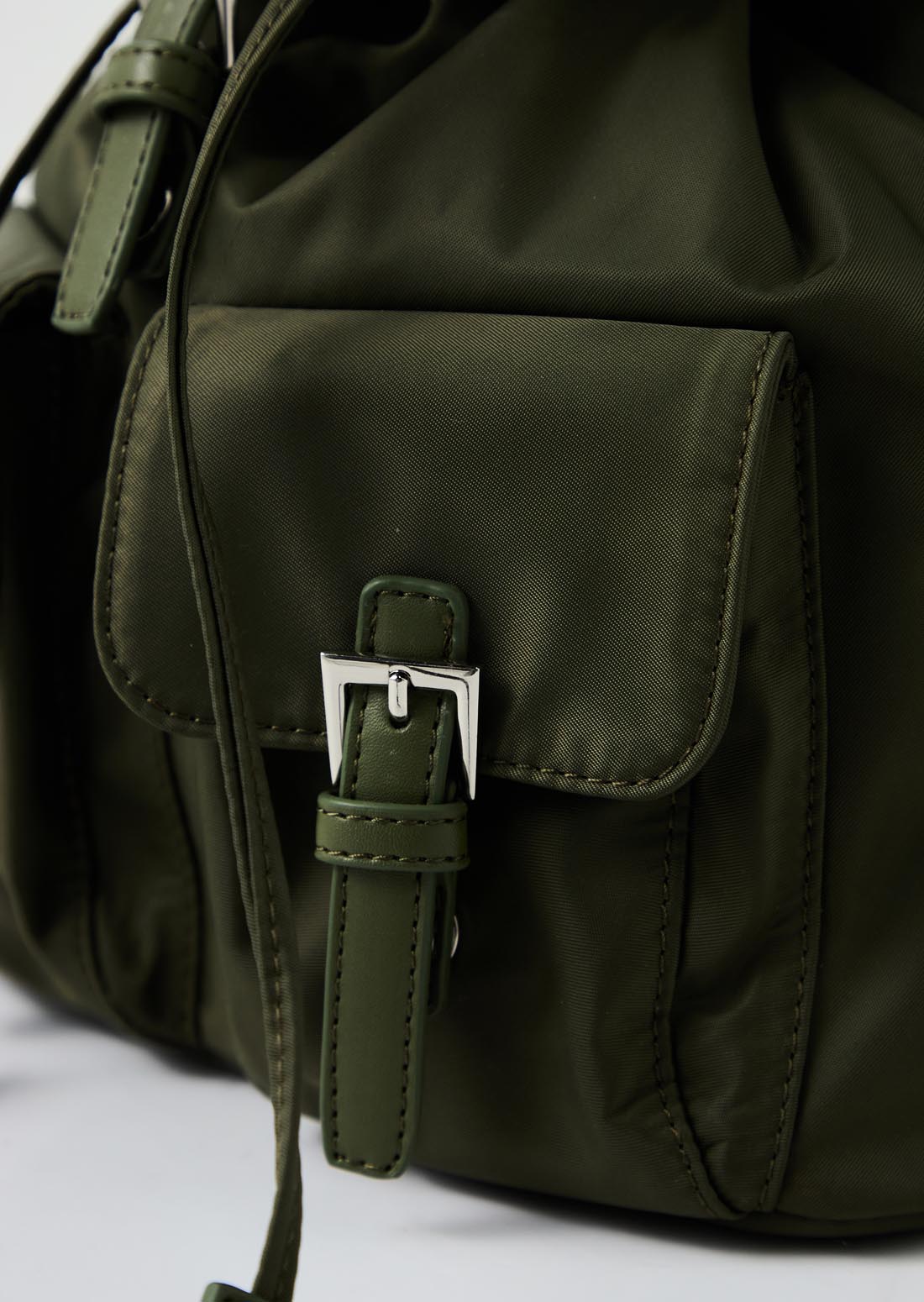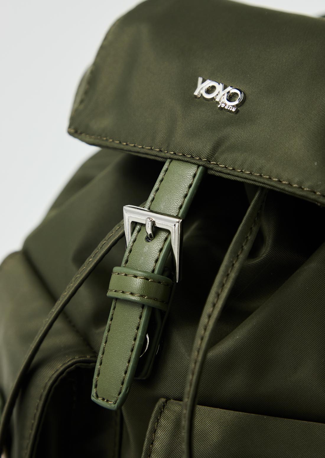 Morral color verde militar, con herrajes y con bolsillos expuestos.