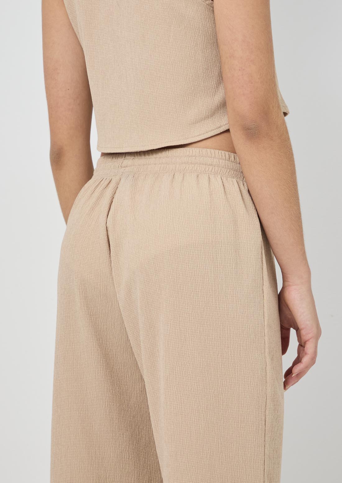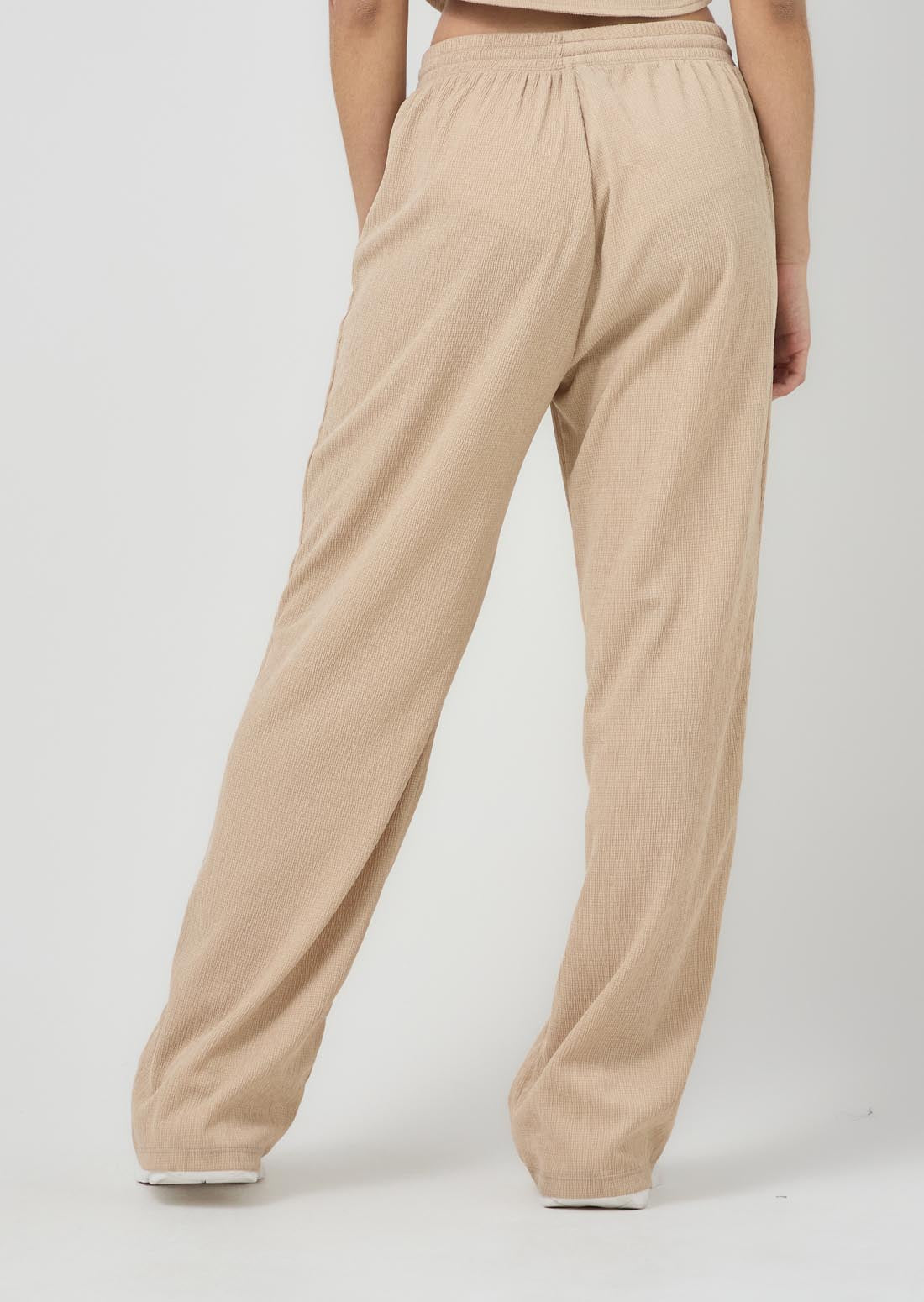 Pantalón tiro alto, color arena, con detalle en cordón y bota recta para jóvenes.