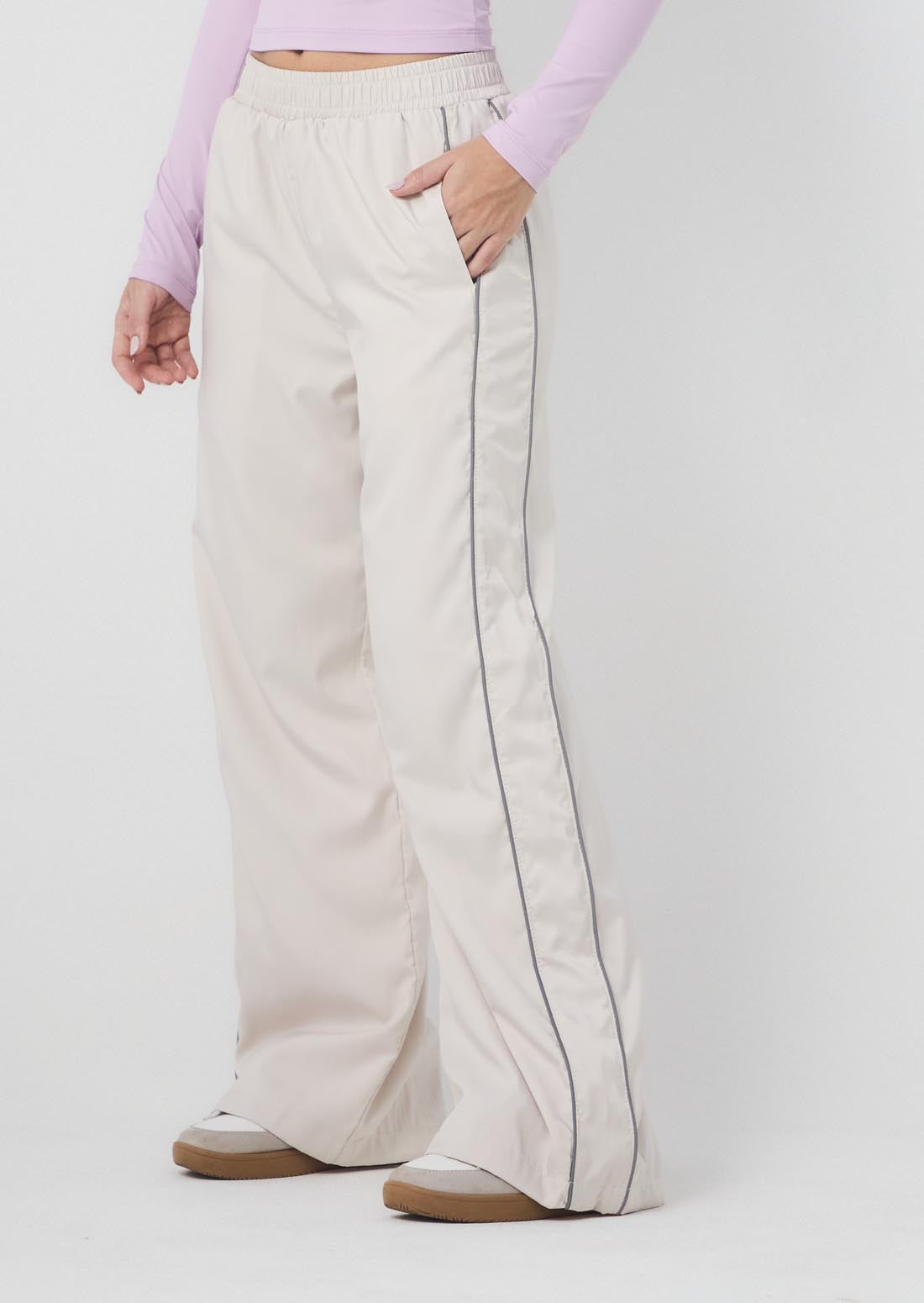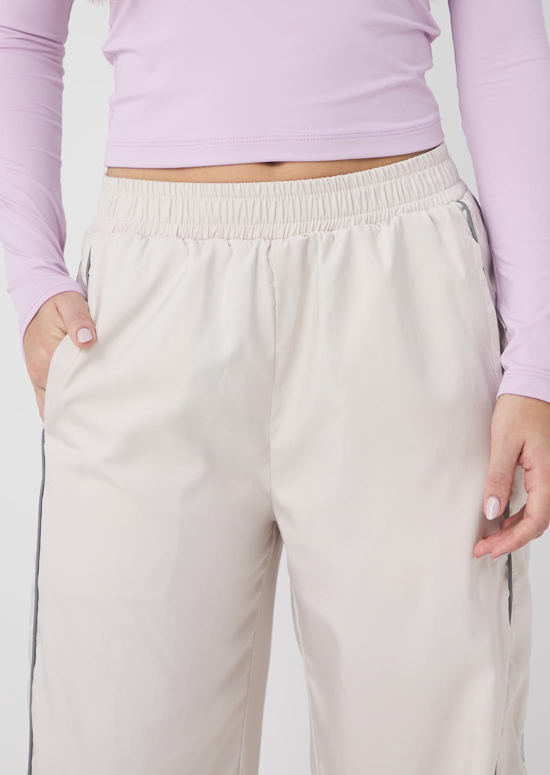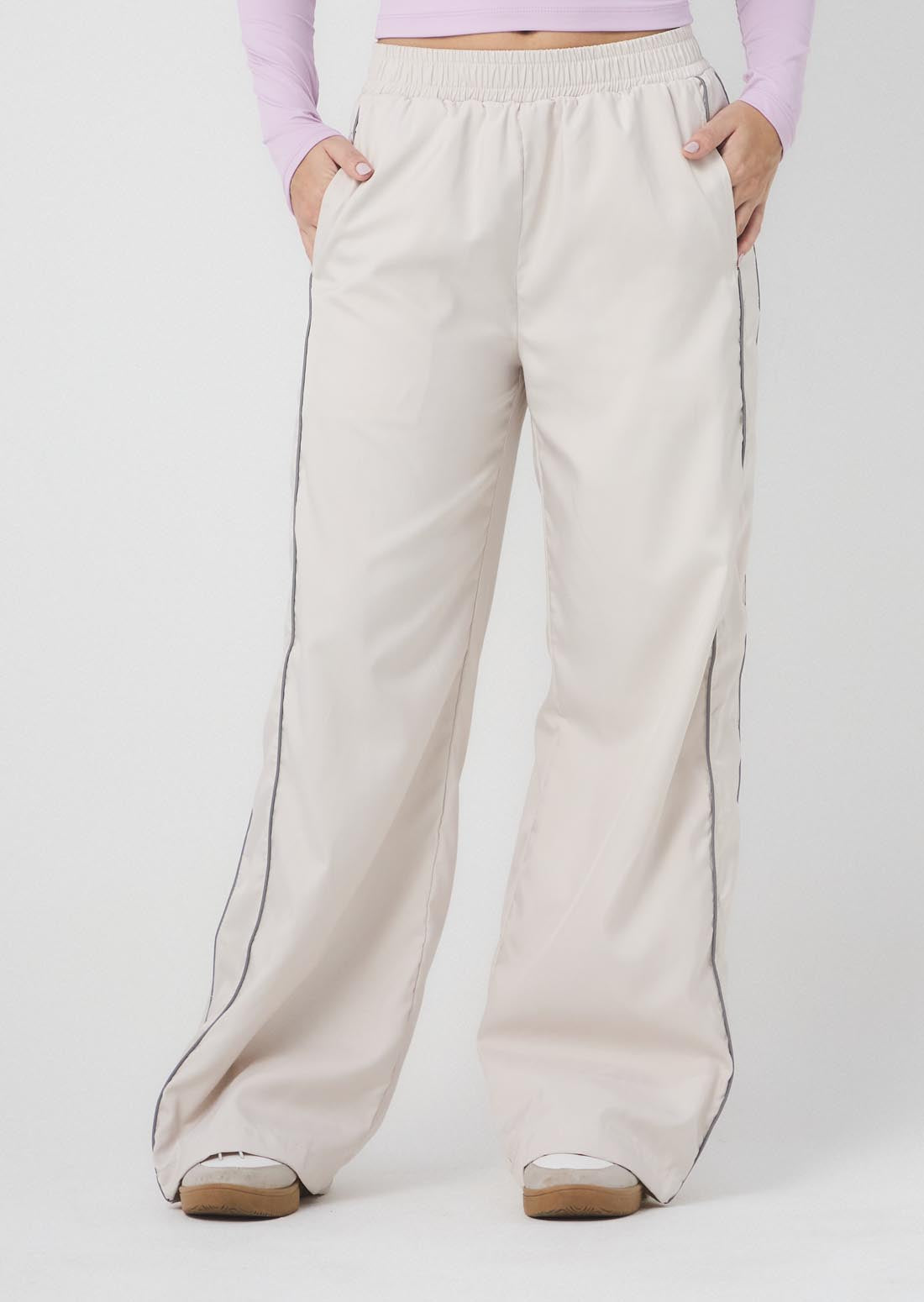 Pantalón tiro alto, color arena, con sesgos en costados y fondo entero para jóvenes.