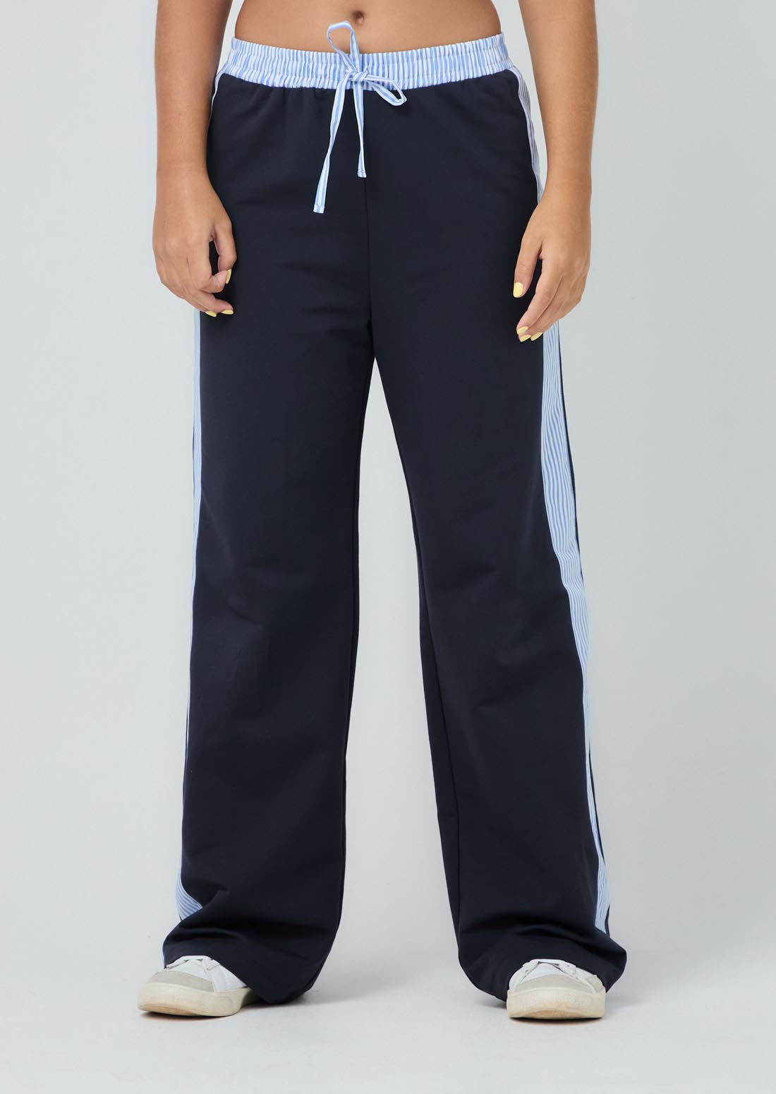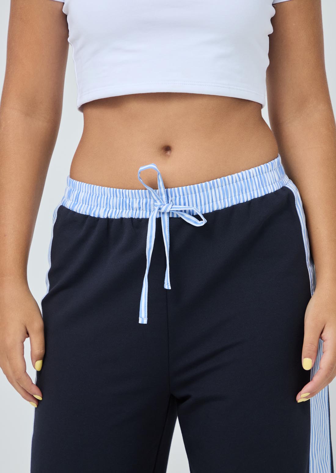 Pantalón tiro alto, color azul navy, piezas en contraste de color y cordón ajustable para jóvenes.