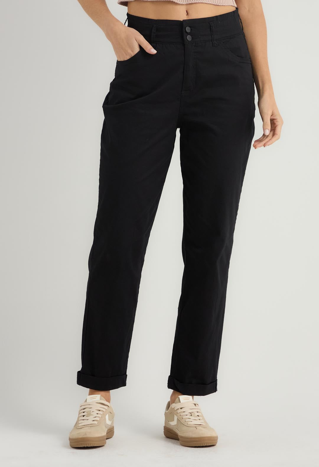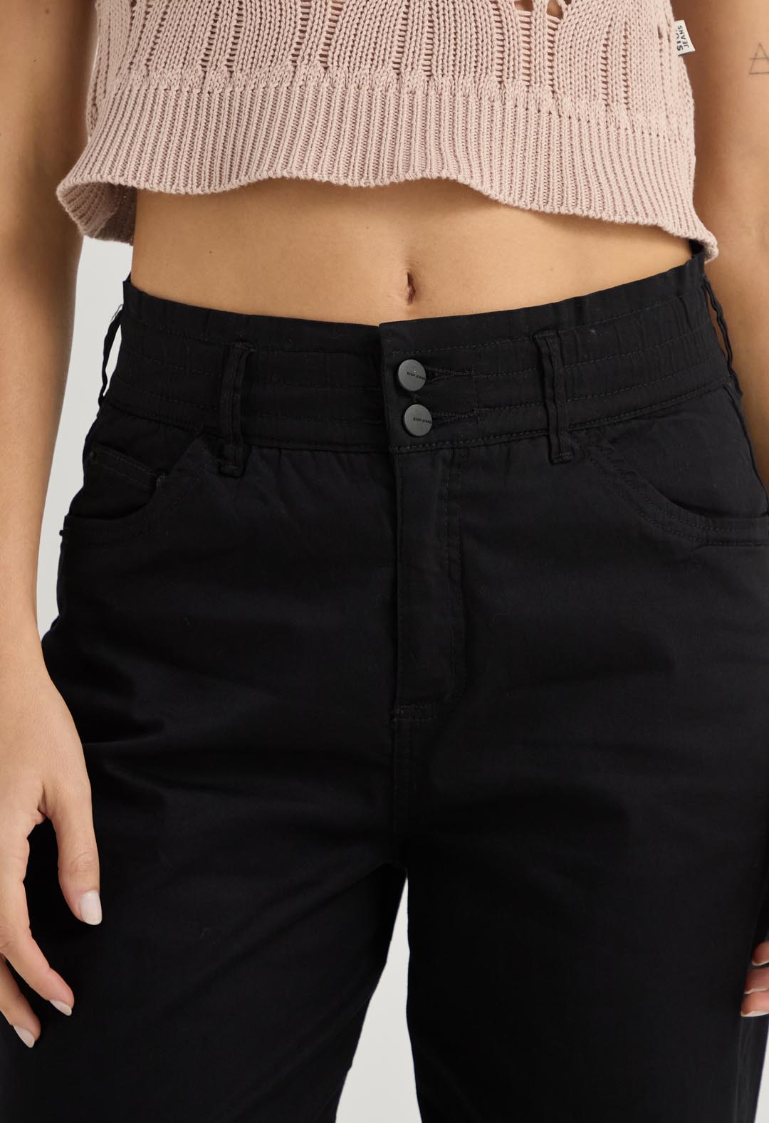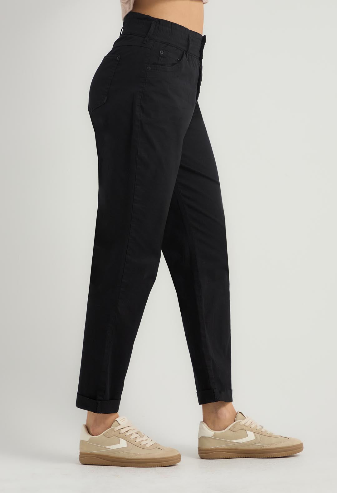 Pantalón baggy tiro alto, color negro, elástico en cintura, fondo entero y bota amplia para mujeres.