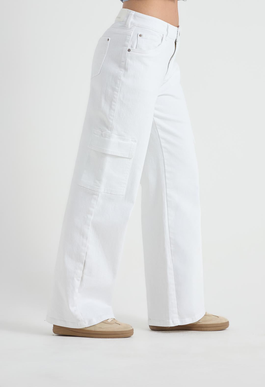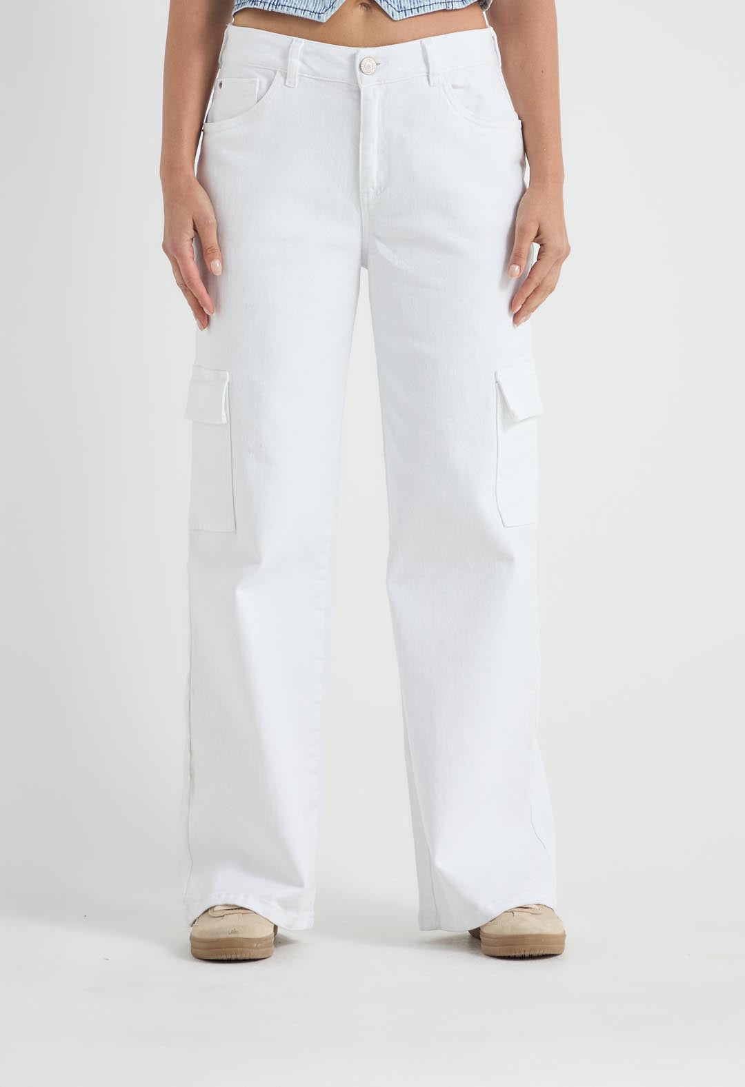 Jean cargo, color blanco, tiro alto, fondo entero y con bolsillos para mujer.