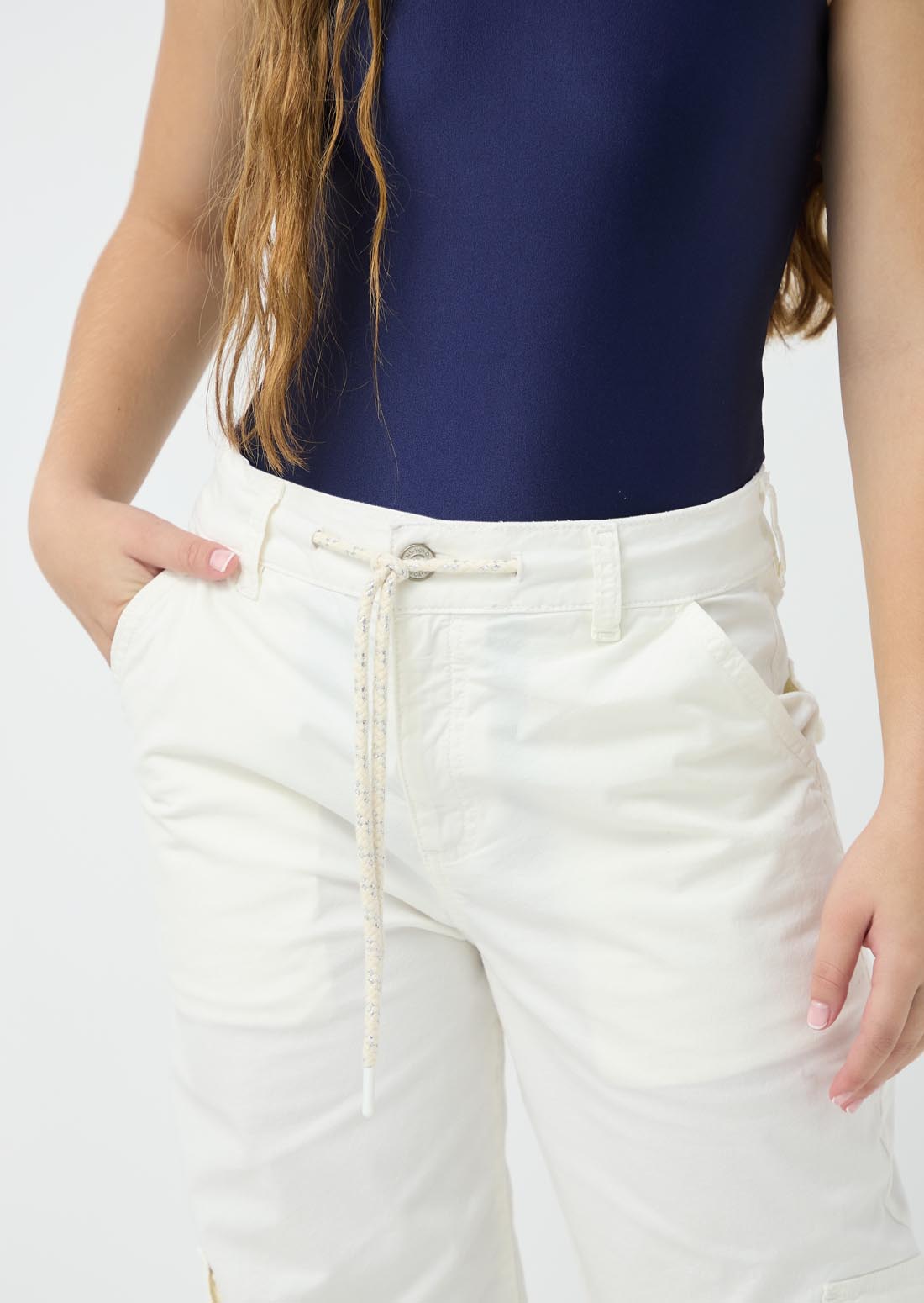 Jean cargo tiro alto, color marfil, cordon en la pretina, fondo entero y bolsillos delanteros tipo parche para jóvenes.