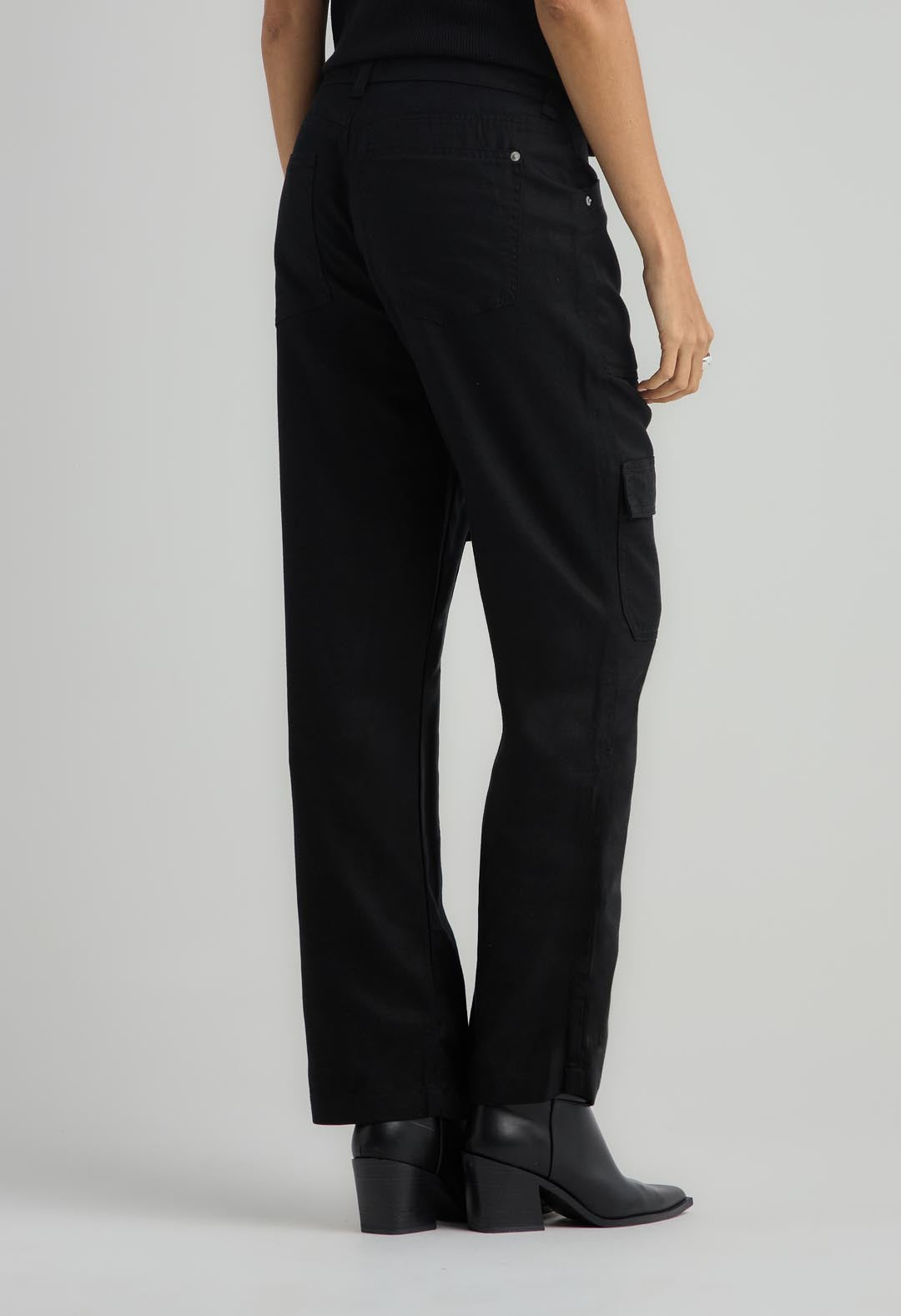 Jean cargo, tiro alto, color negro, bota recta, en denim y fondo entero para mujer.