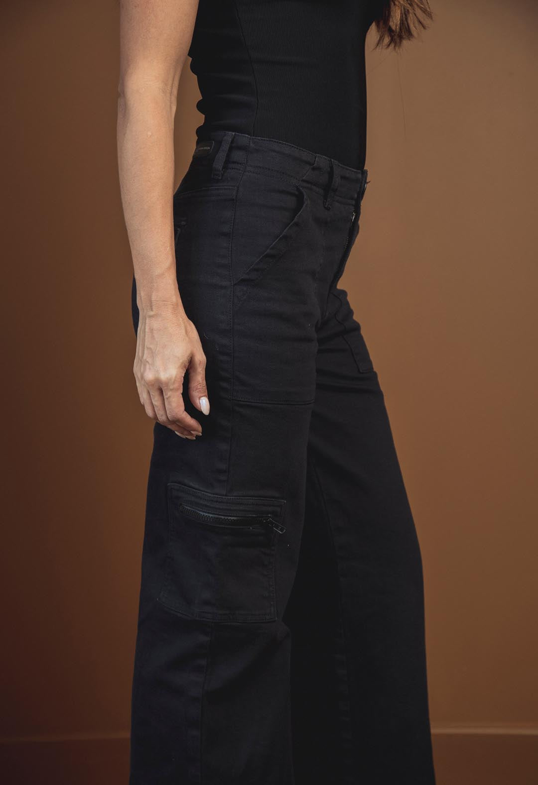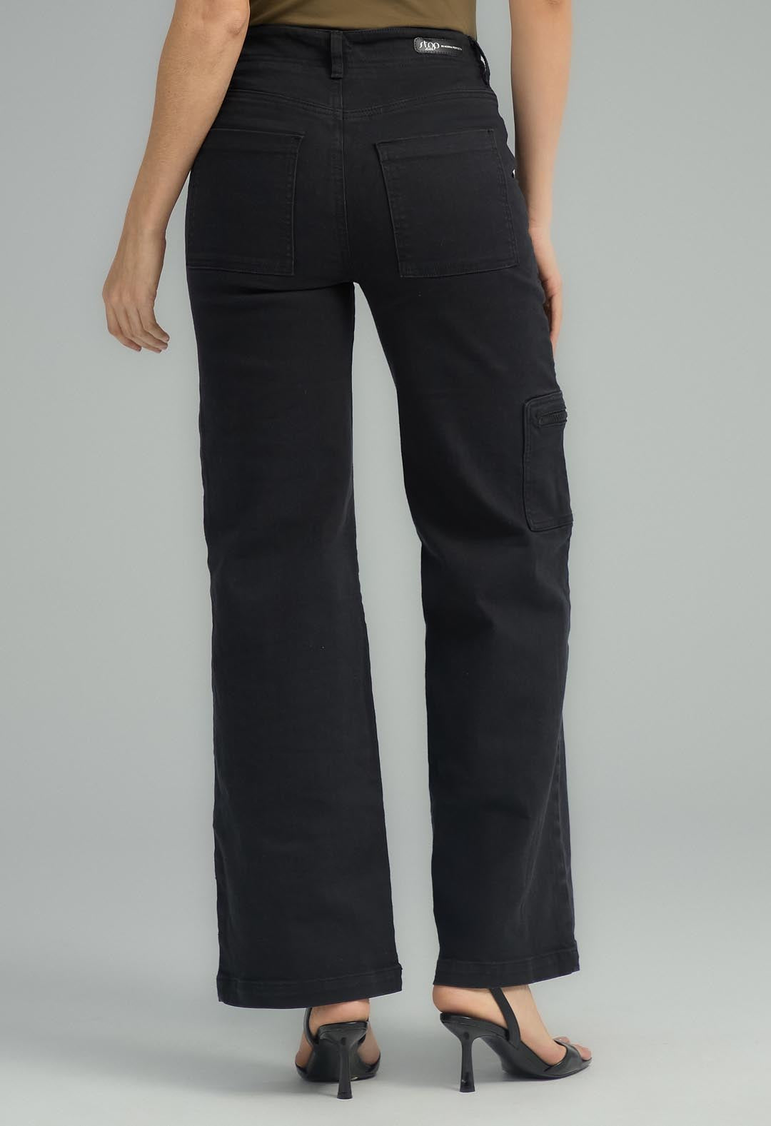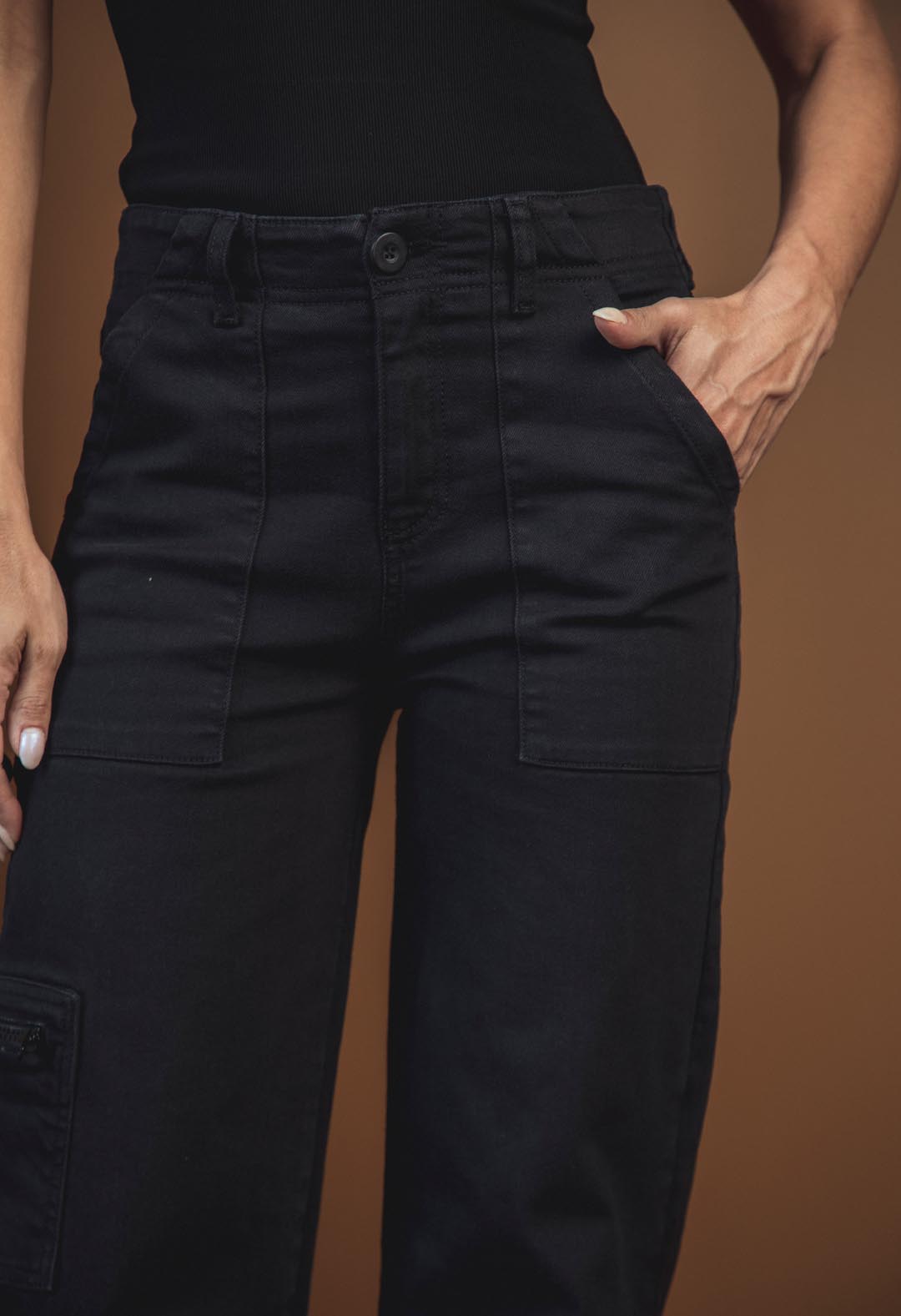 Pantalón cargo, tiro alto, color negro, teñido, bolsillo tipo parche, cierre en bolsillo y doblez en bota para mujeres.