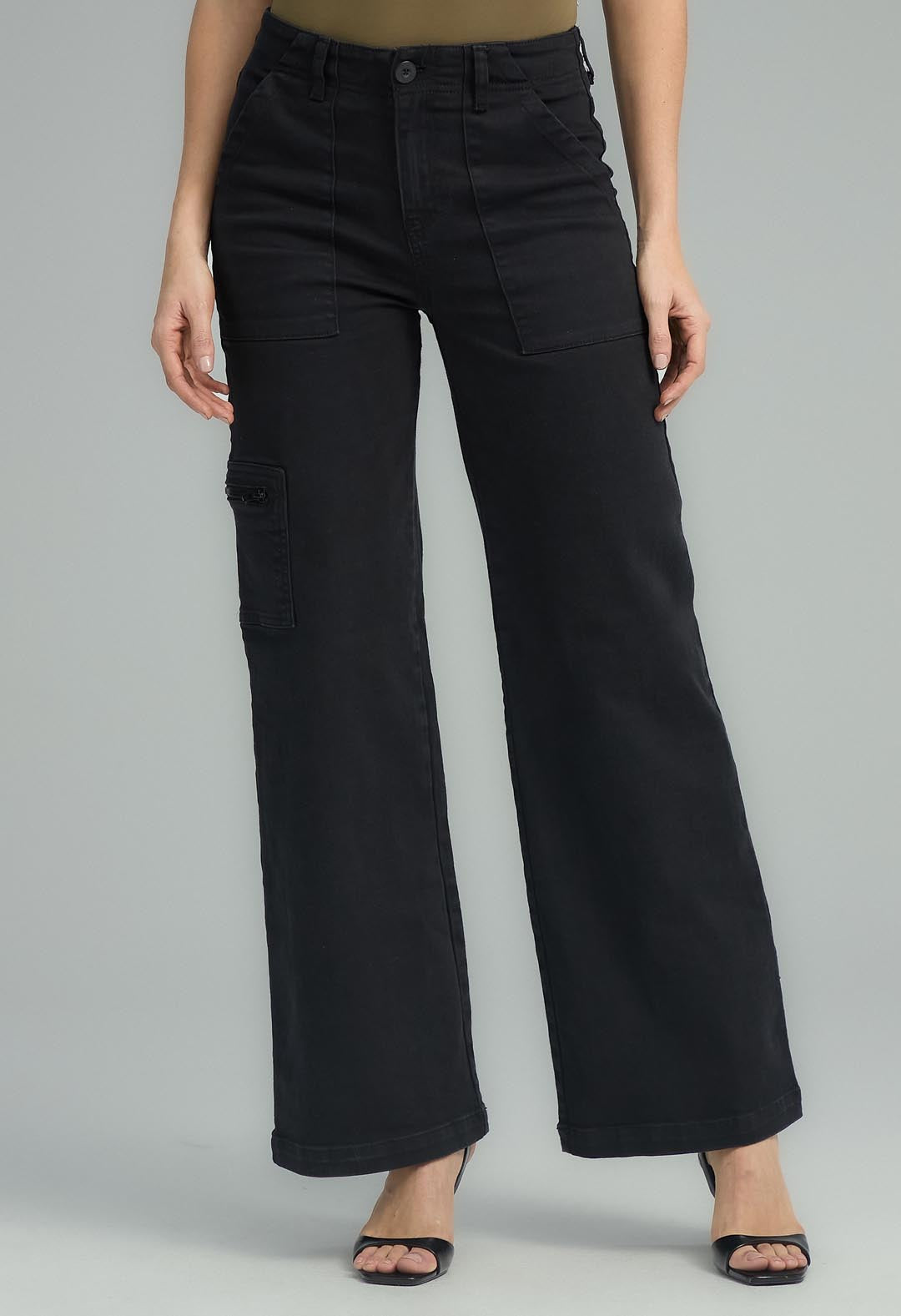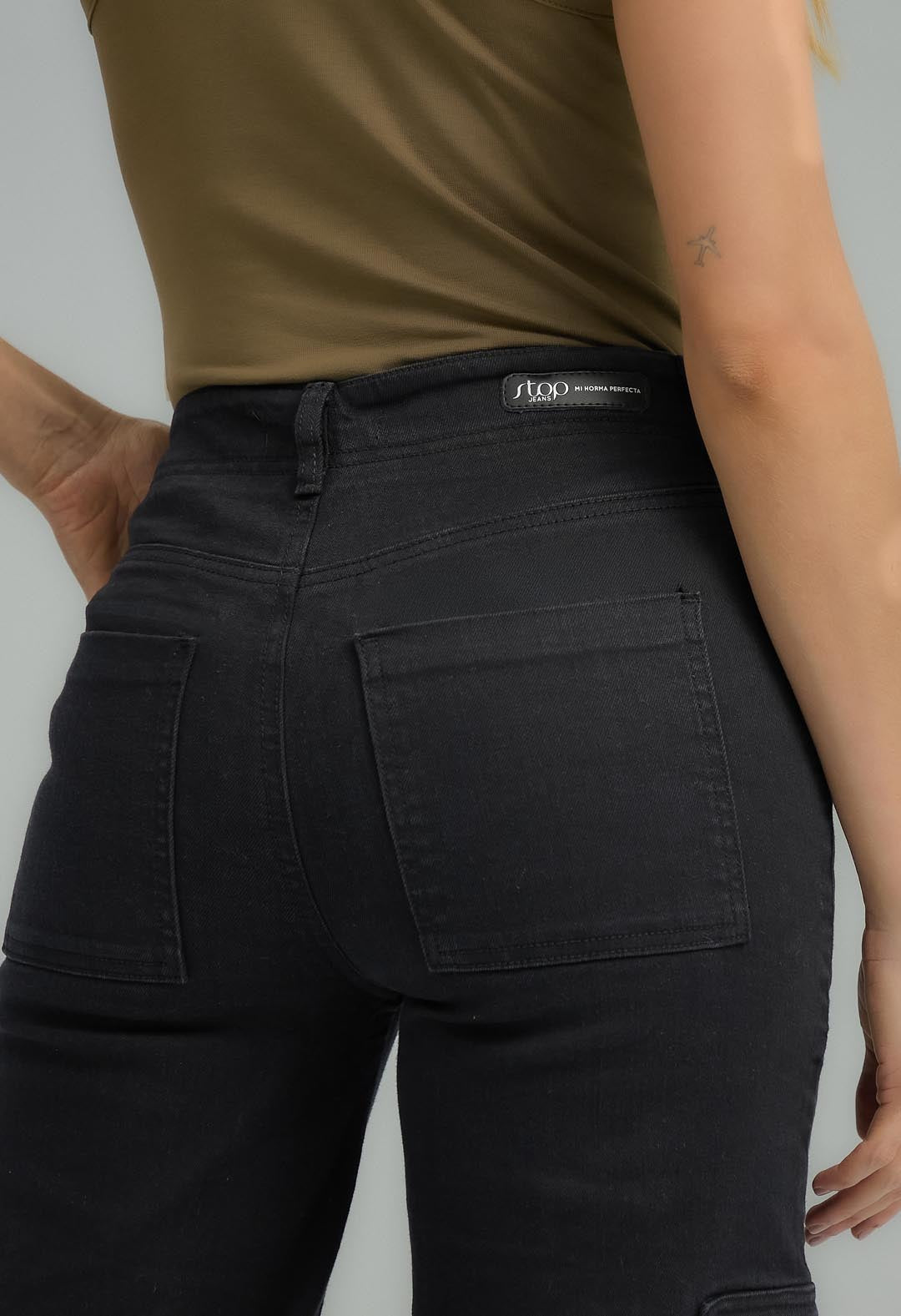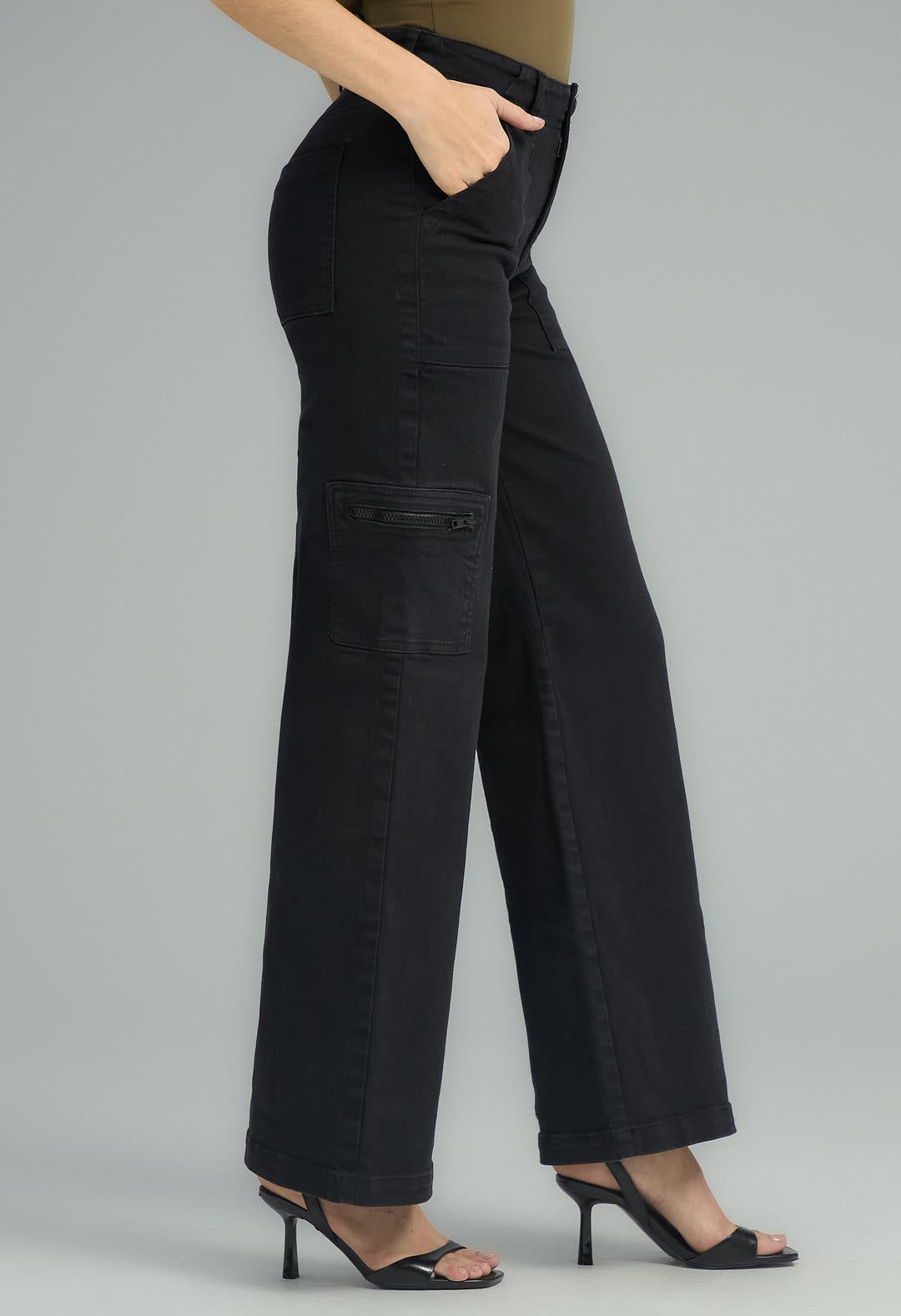 Pantalón cargo, tiro alto, color negro, teñido, bolsillo tipo parche, cierre en bolsillo y doblez en bota para mujeres.