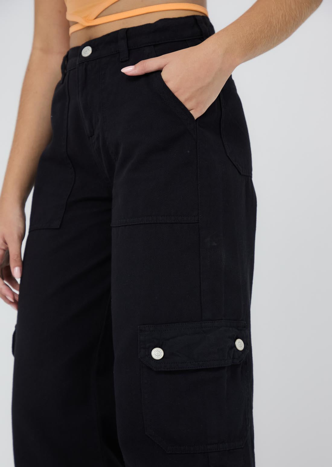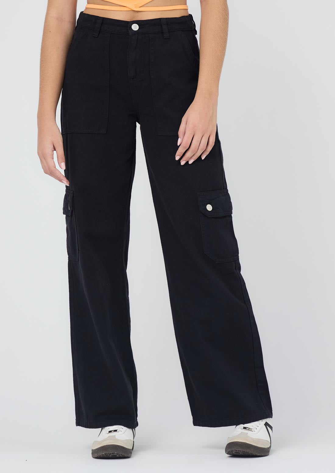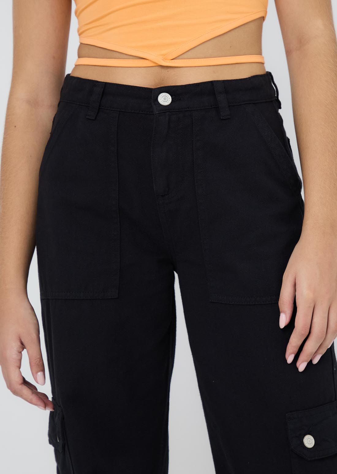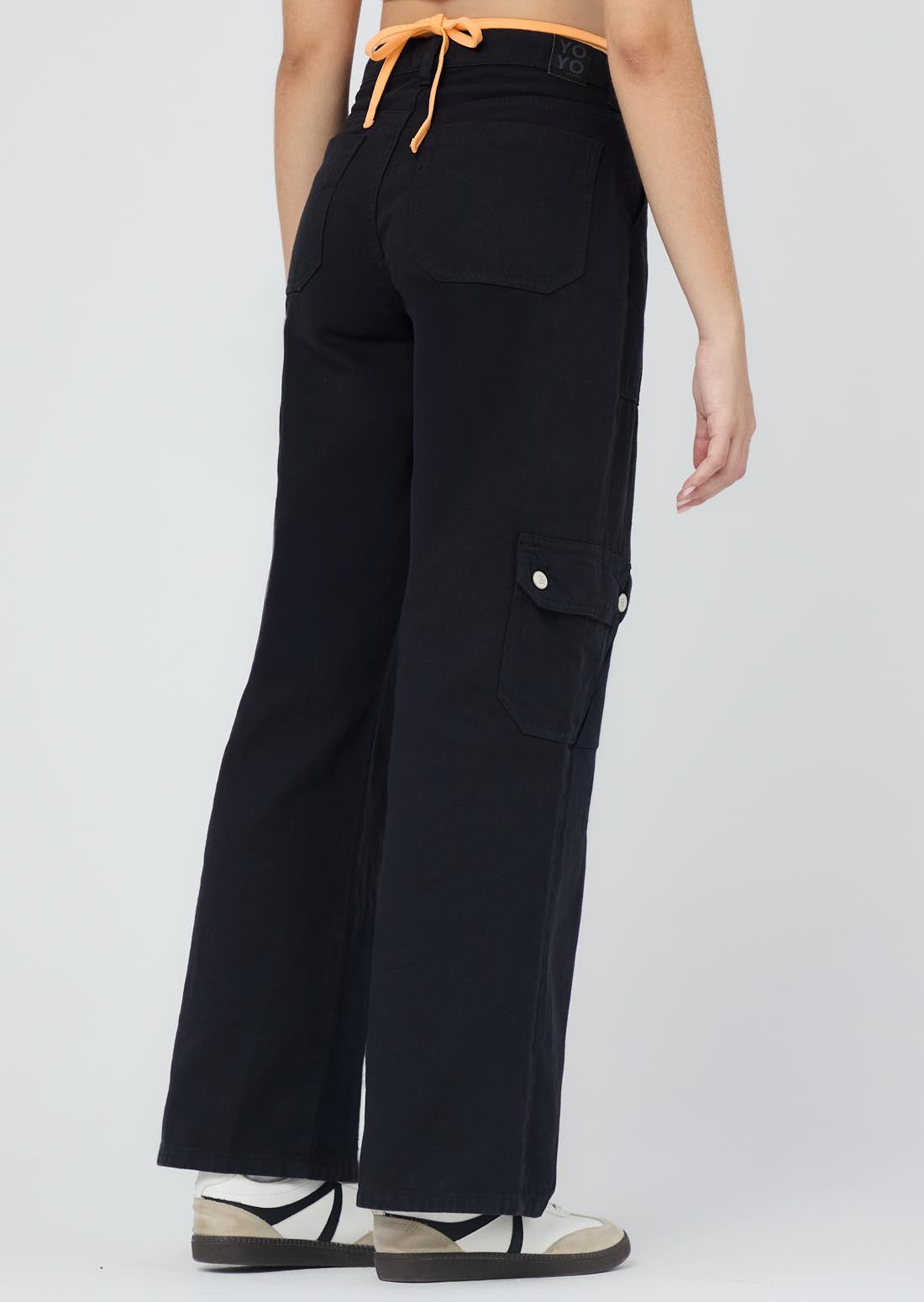Pantalón cargo tiro alto, color negro y fondo entero para jóvenes.