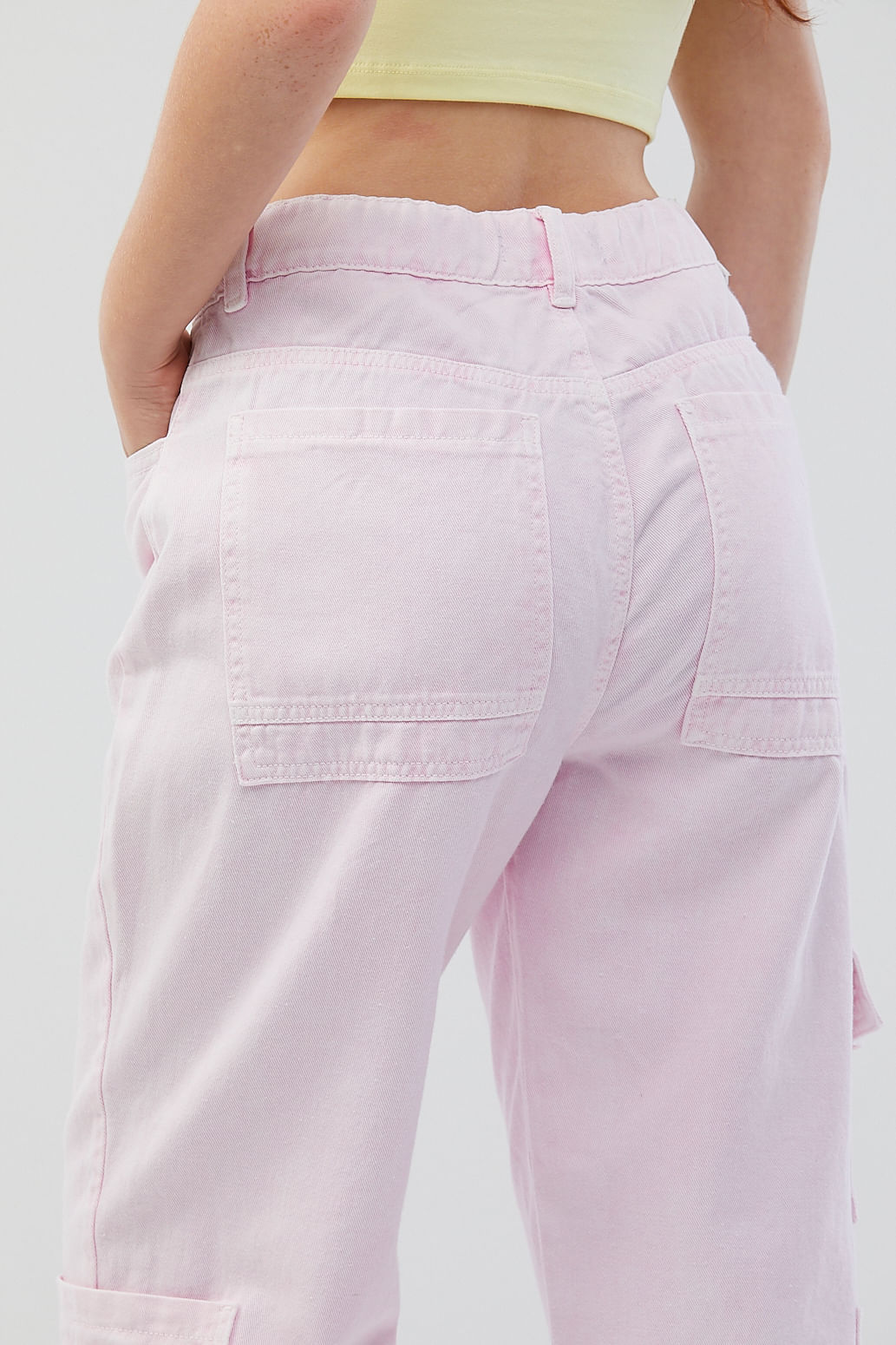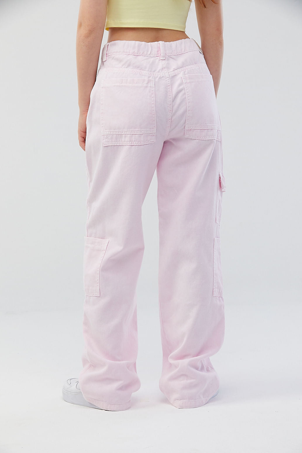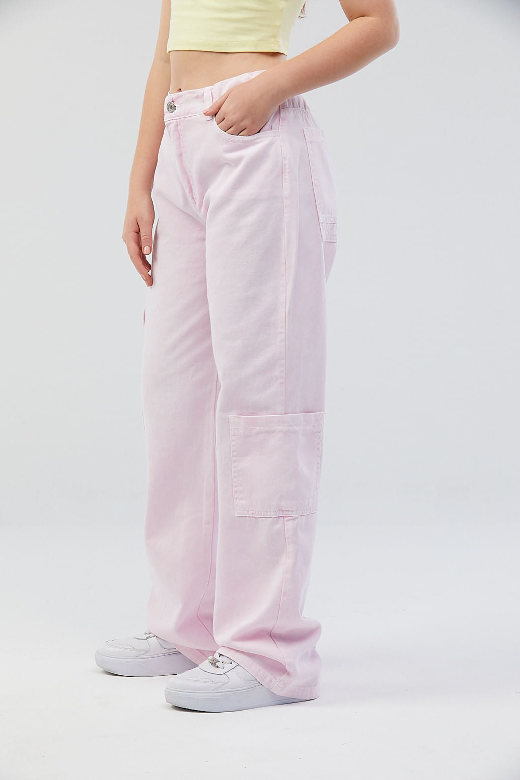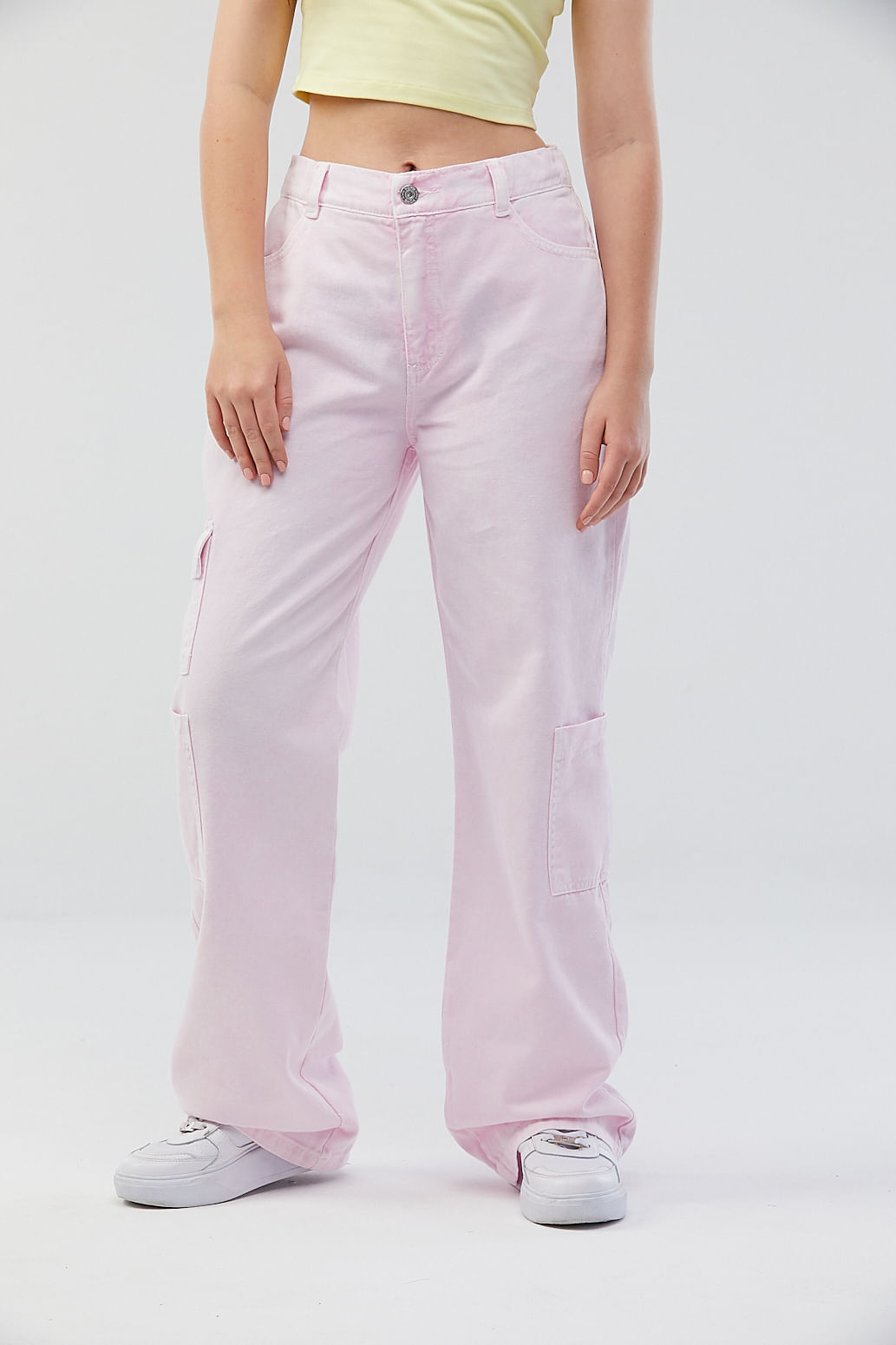 Pantalón cargo, tiro alto, color rosa pastel y fondo entero para adolescentes.