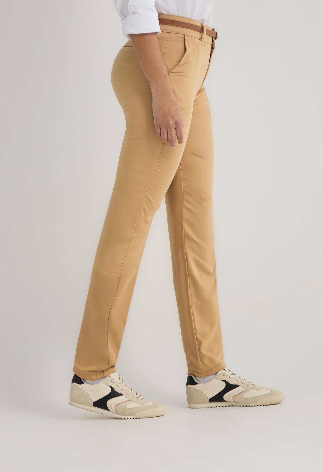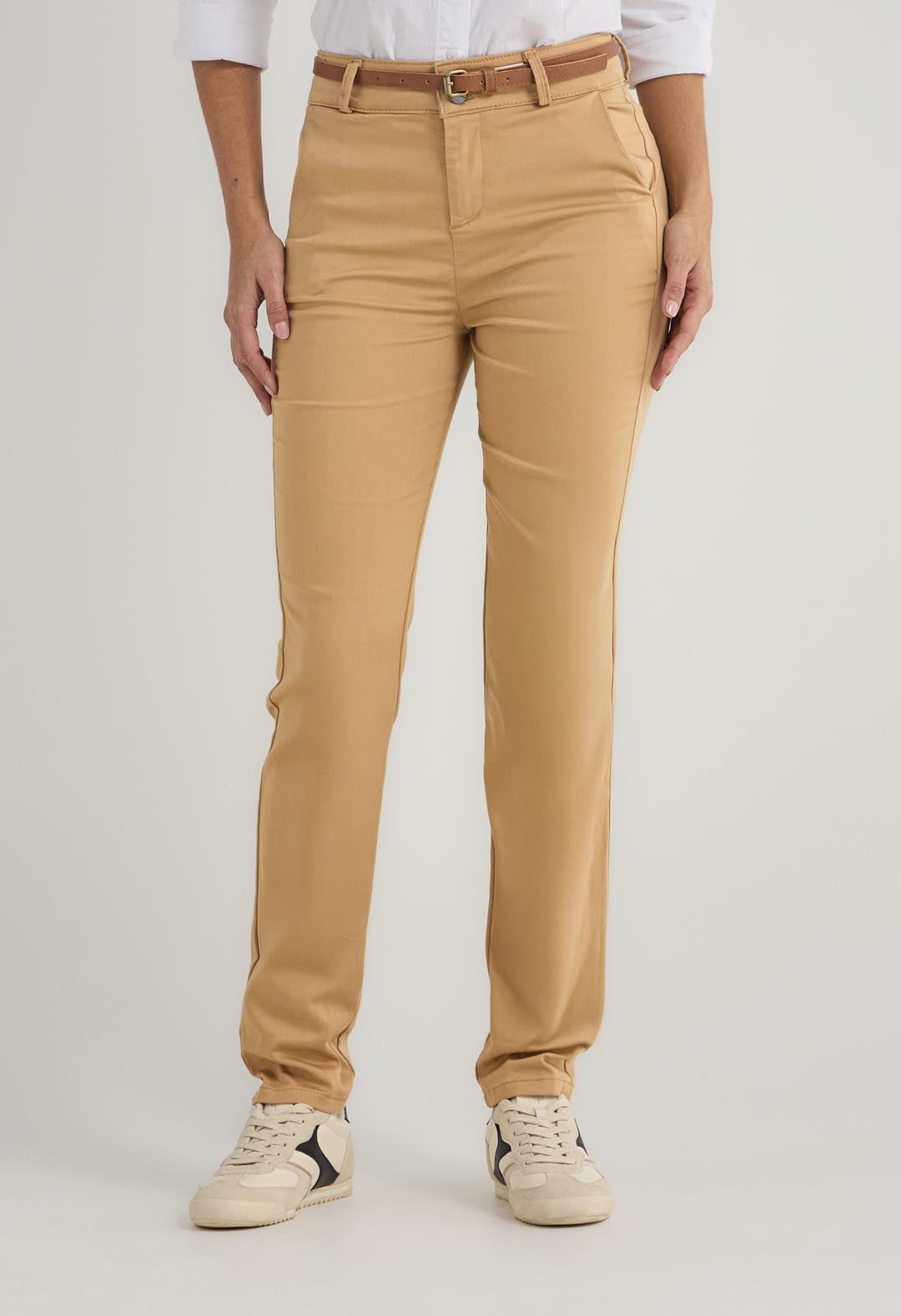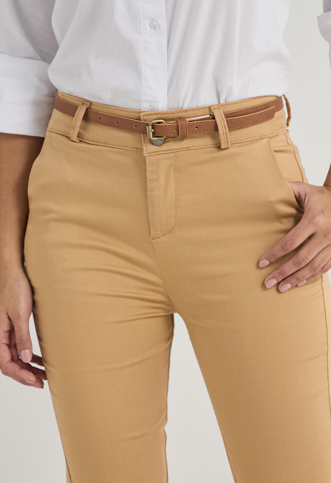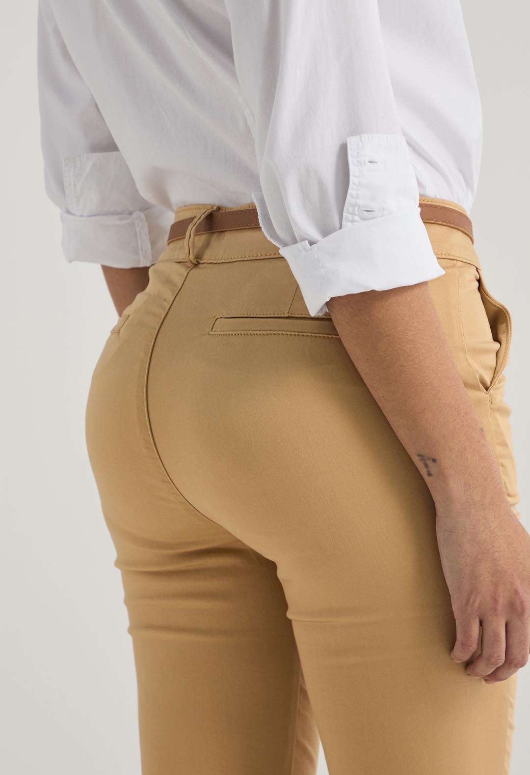 Pantalón ejecutivo, tiro alto, color arena, bolsillos funcionales, fondo entero y bota tubo para mujeres.