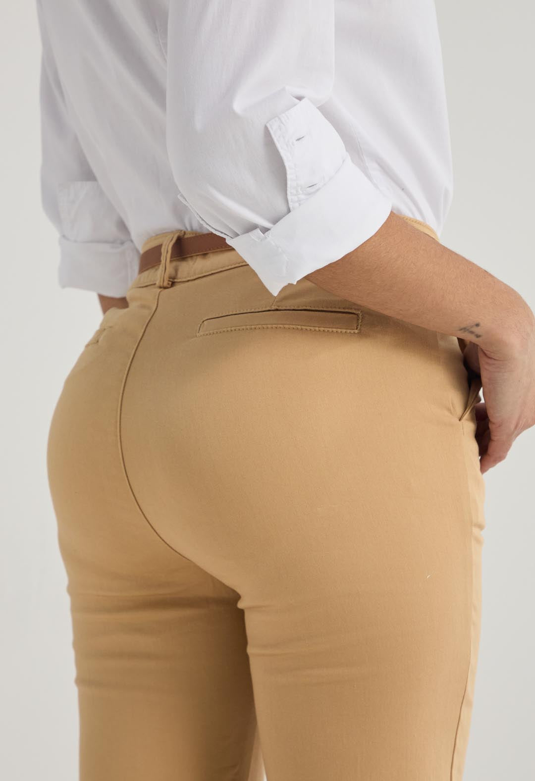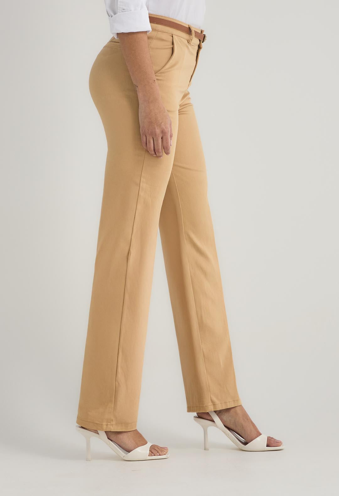 Pantalón ejecutivo, tiro alto, color arena, bota recta y fondo entero para mujer.