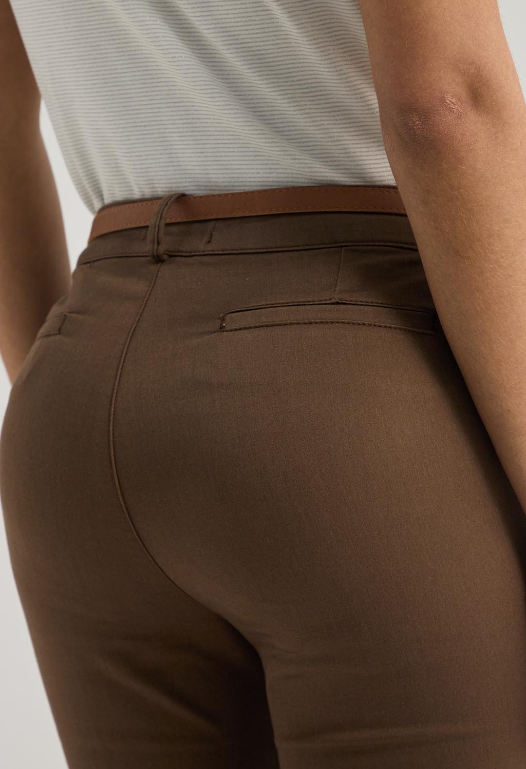 Pantalón ejecutivo, tiro alto, color chocolate, bolsillos funcionales, fondo entero y bota tubo para mujeres.