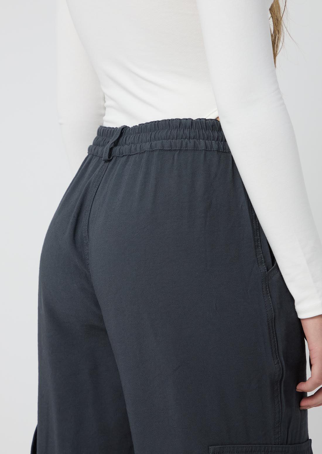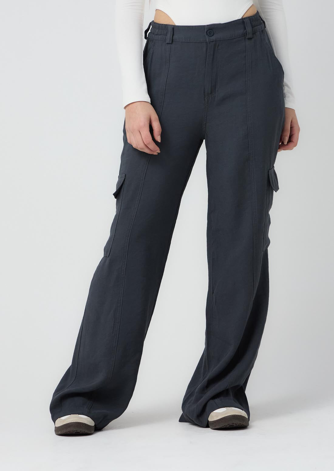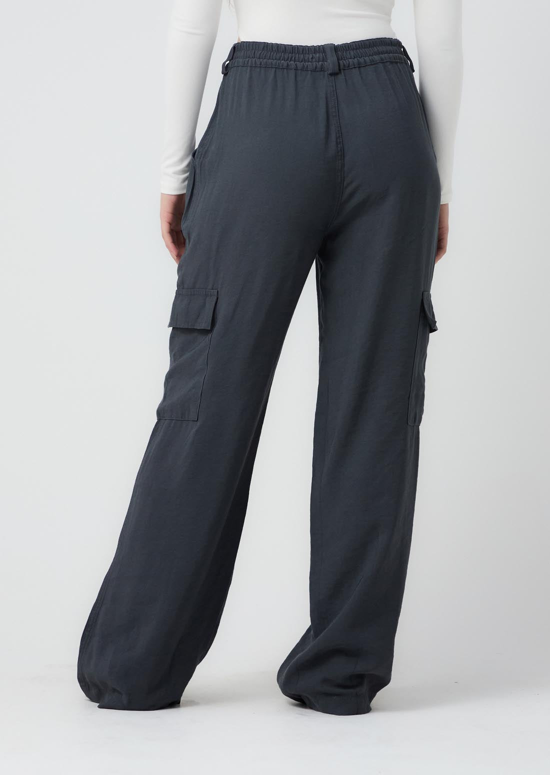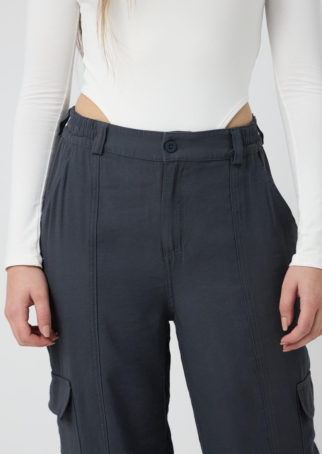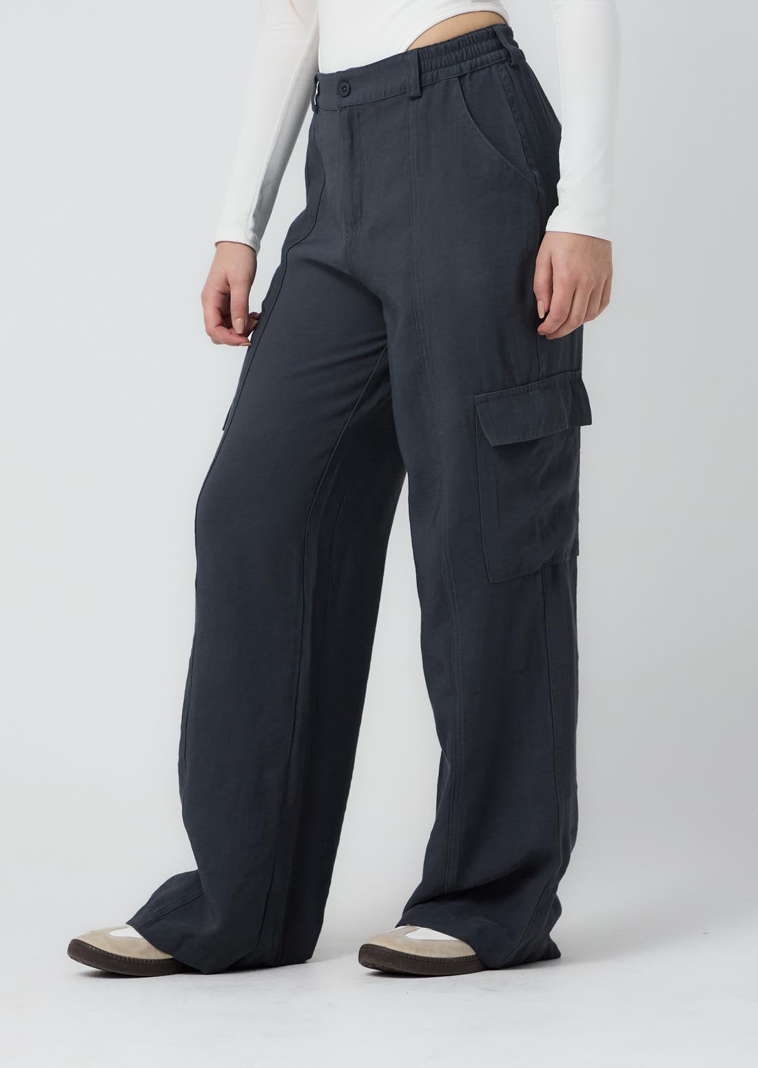 Pantalón tiro alto, color gris oscuro, fondo entero, recogido en cintura, bolsillos laterales y en costados para jóvenes.