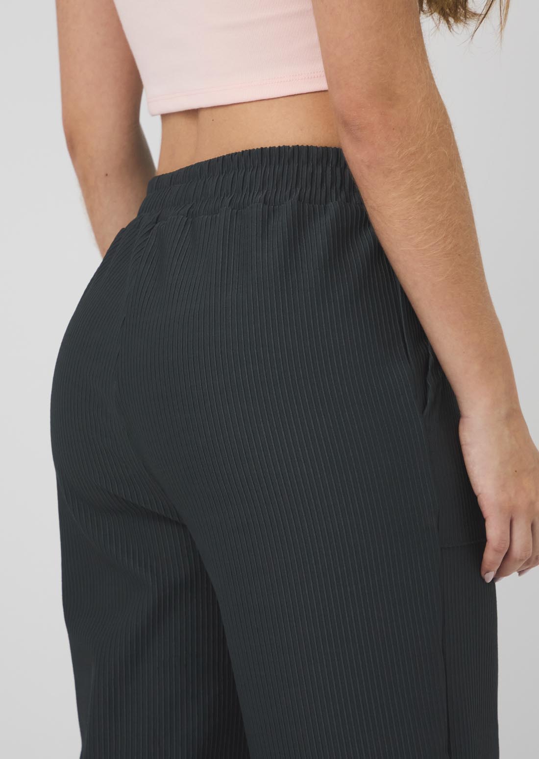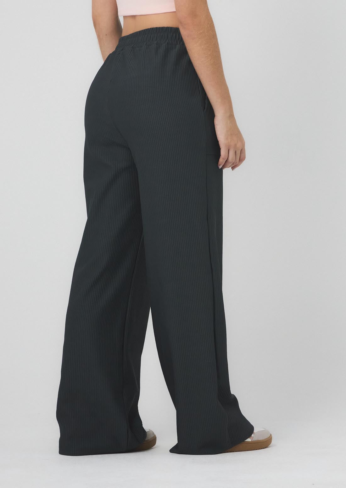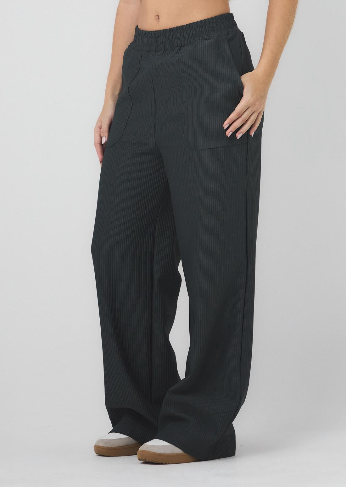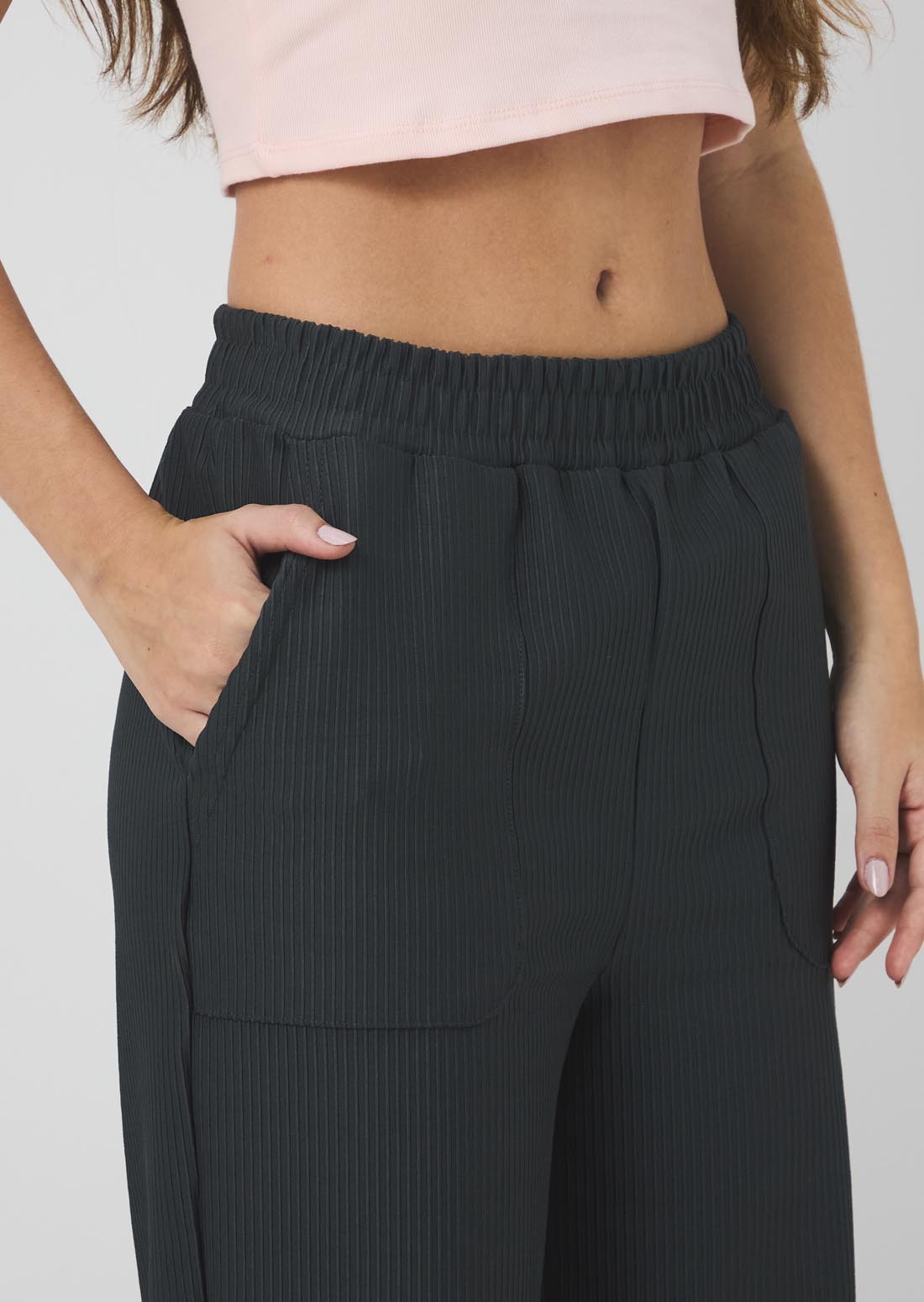 Pantalón tiro alto, color gris oscuro, bolsillos en frente y fondo entero para jóvenes.