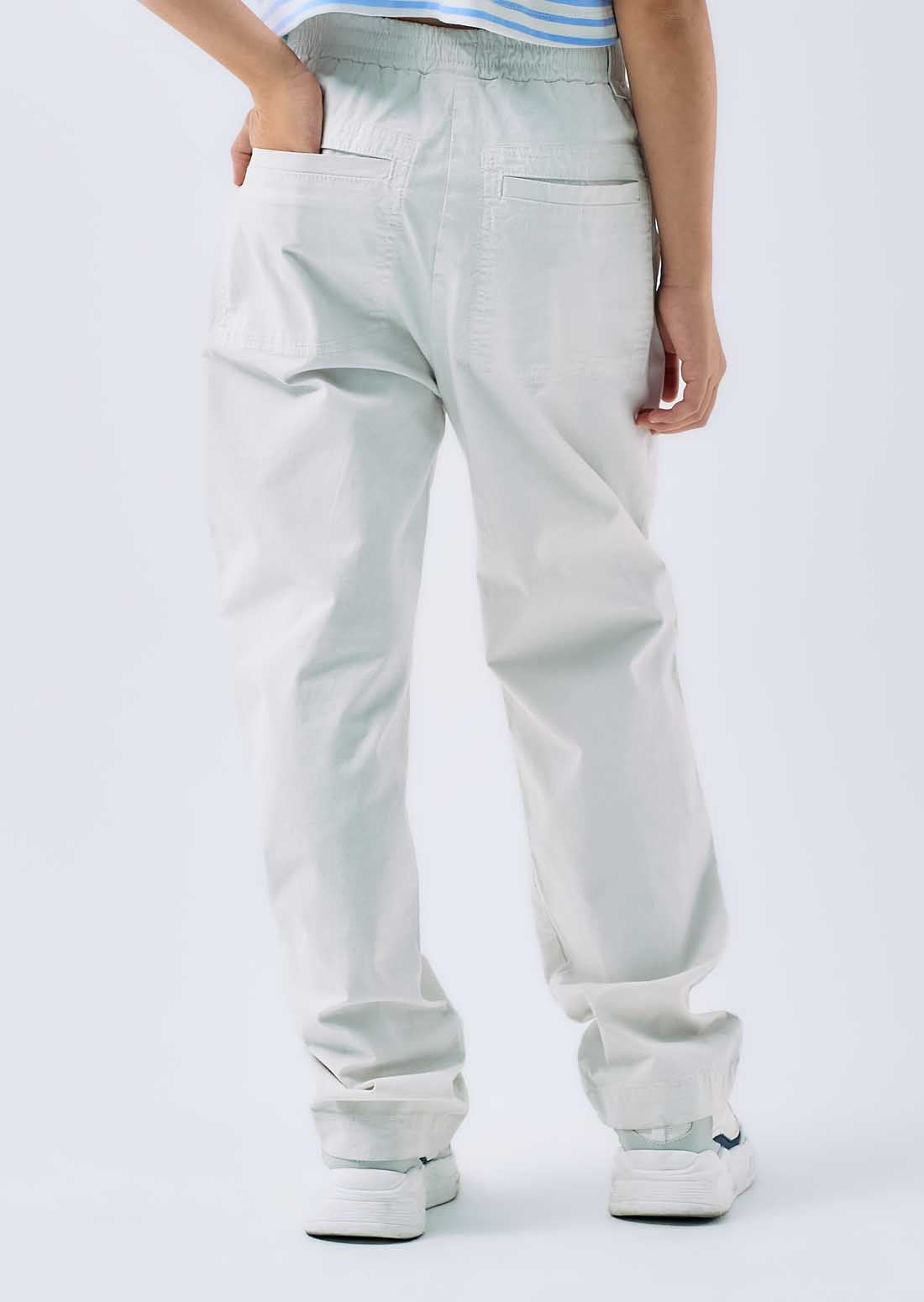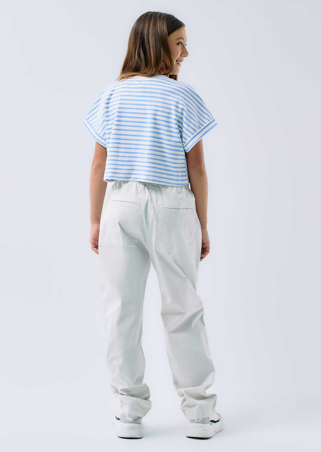 Pantalón tiro alto, color marfil, bolsillos tipo parche y imitación bolsillo ribete en posterior para niñas.
