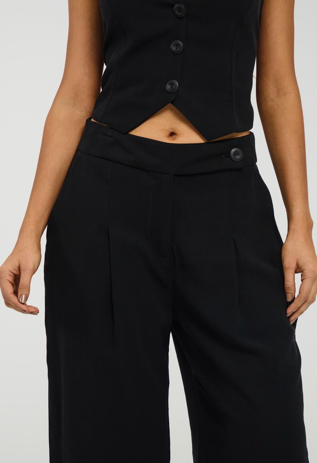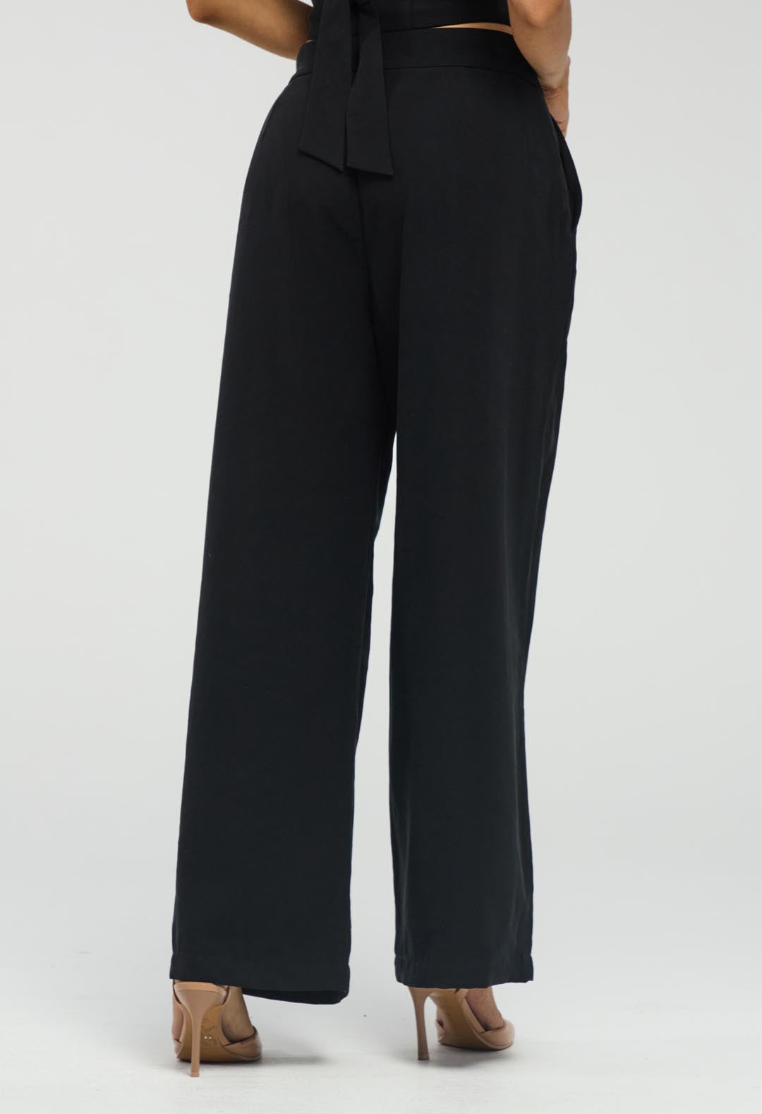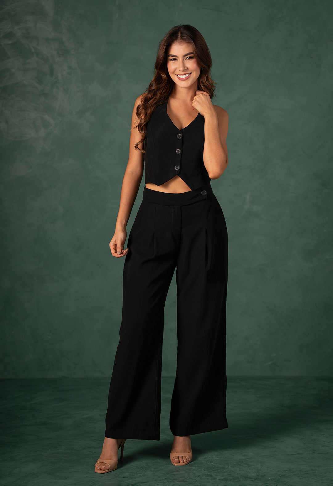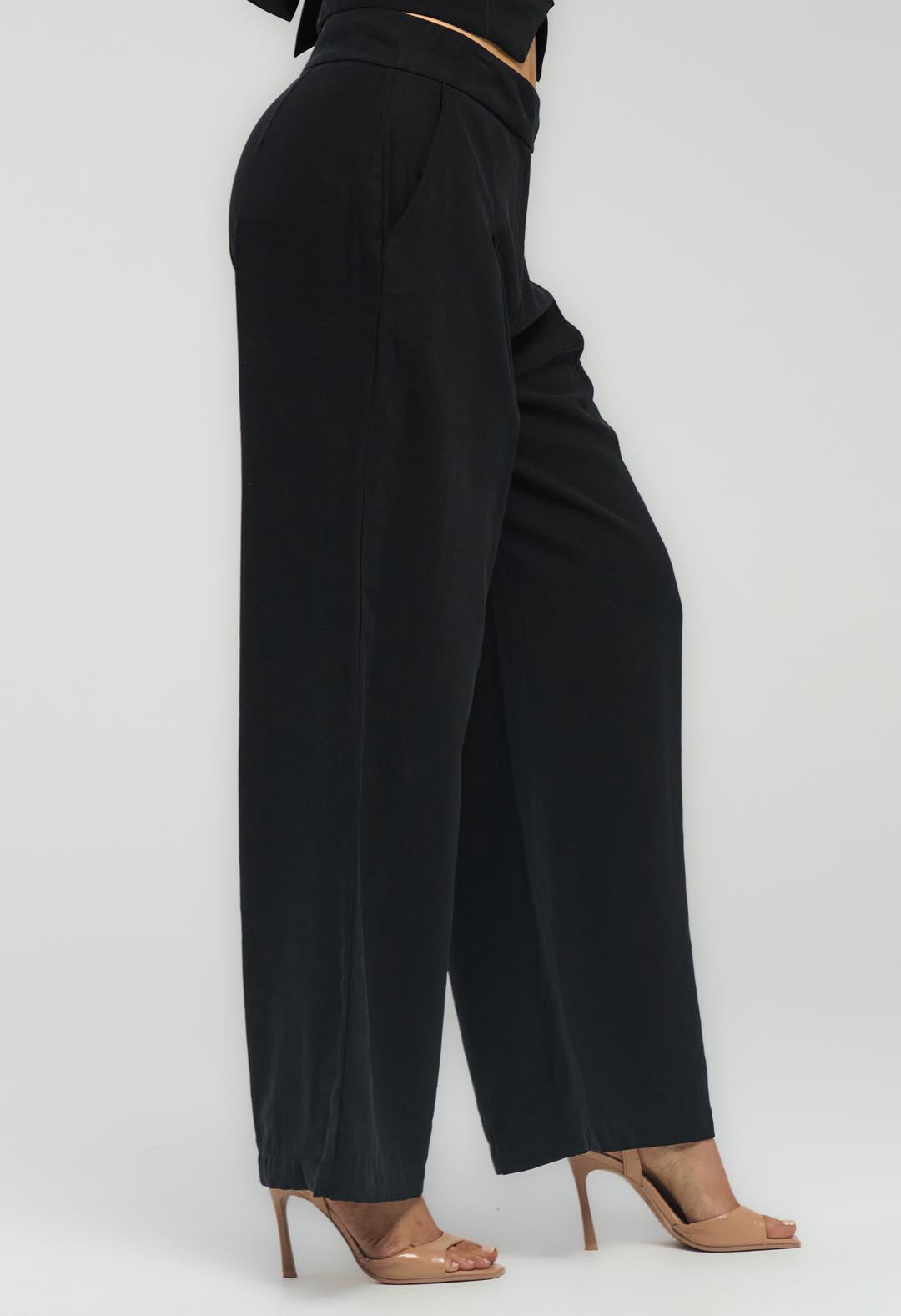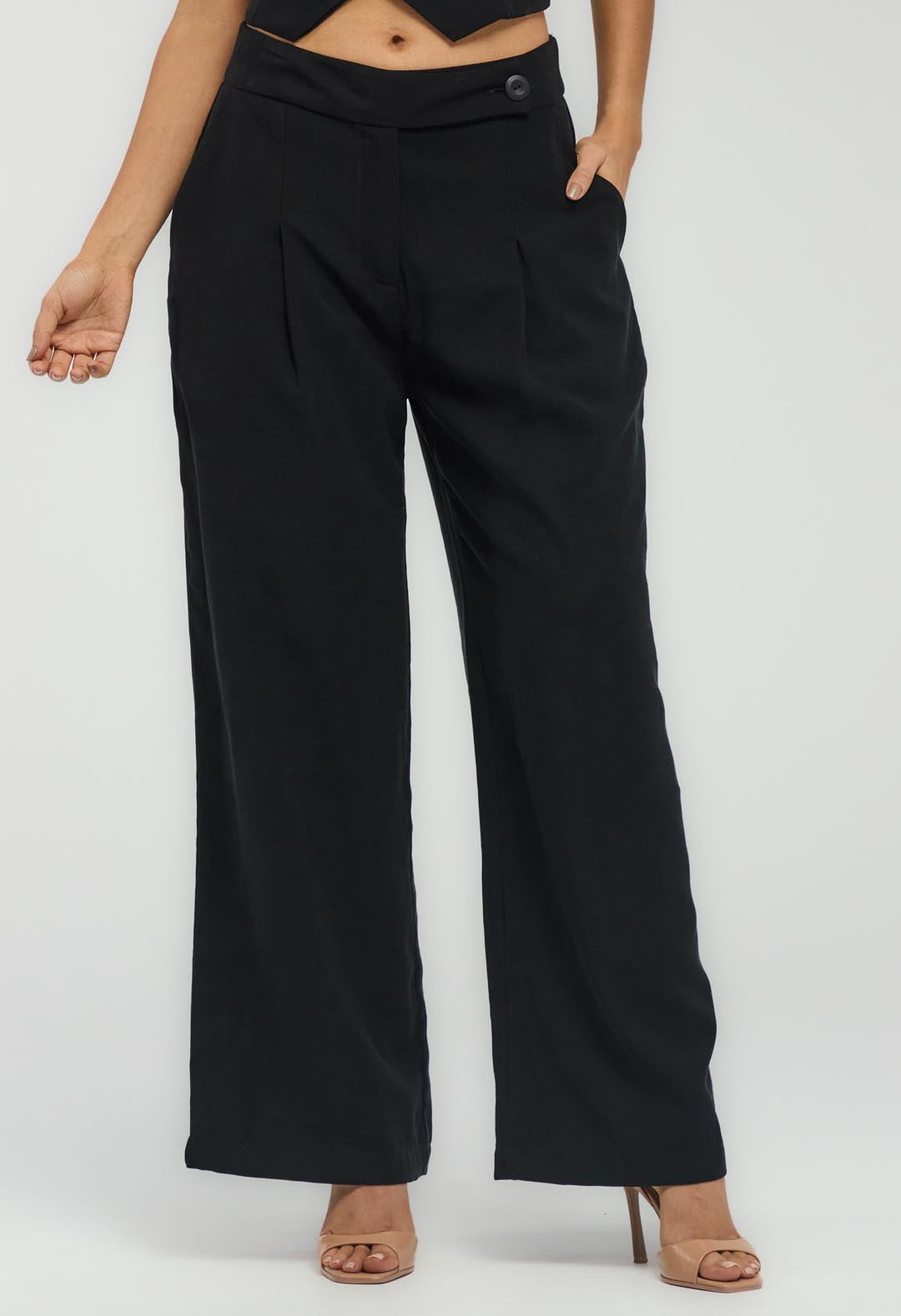 Pantalón tiro alto, color negro, bota ancha, bolsillos y fondo entero para mujeres.