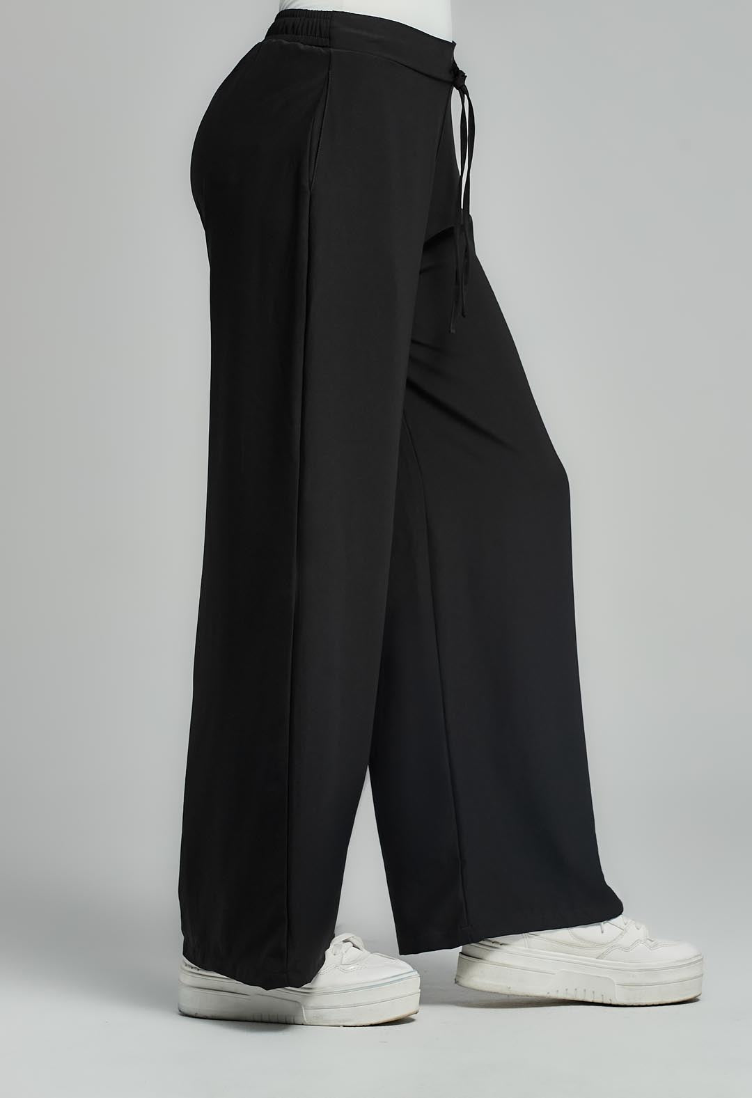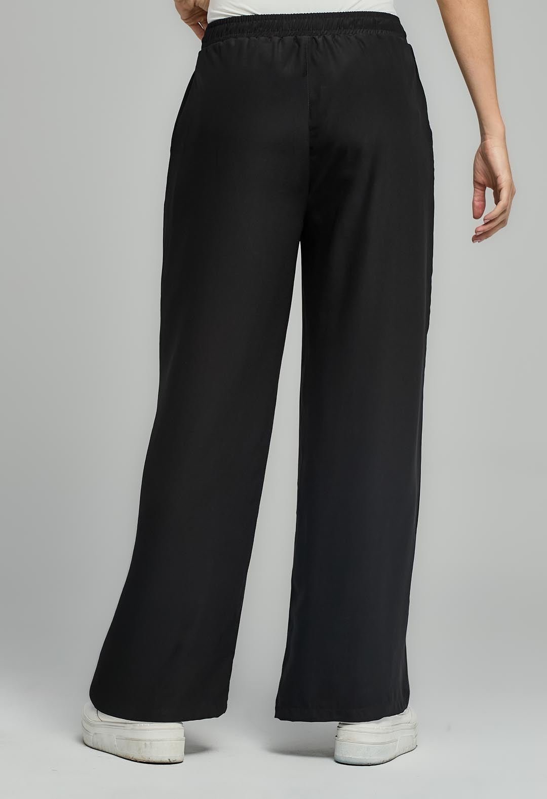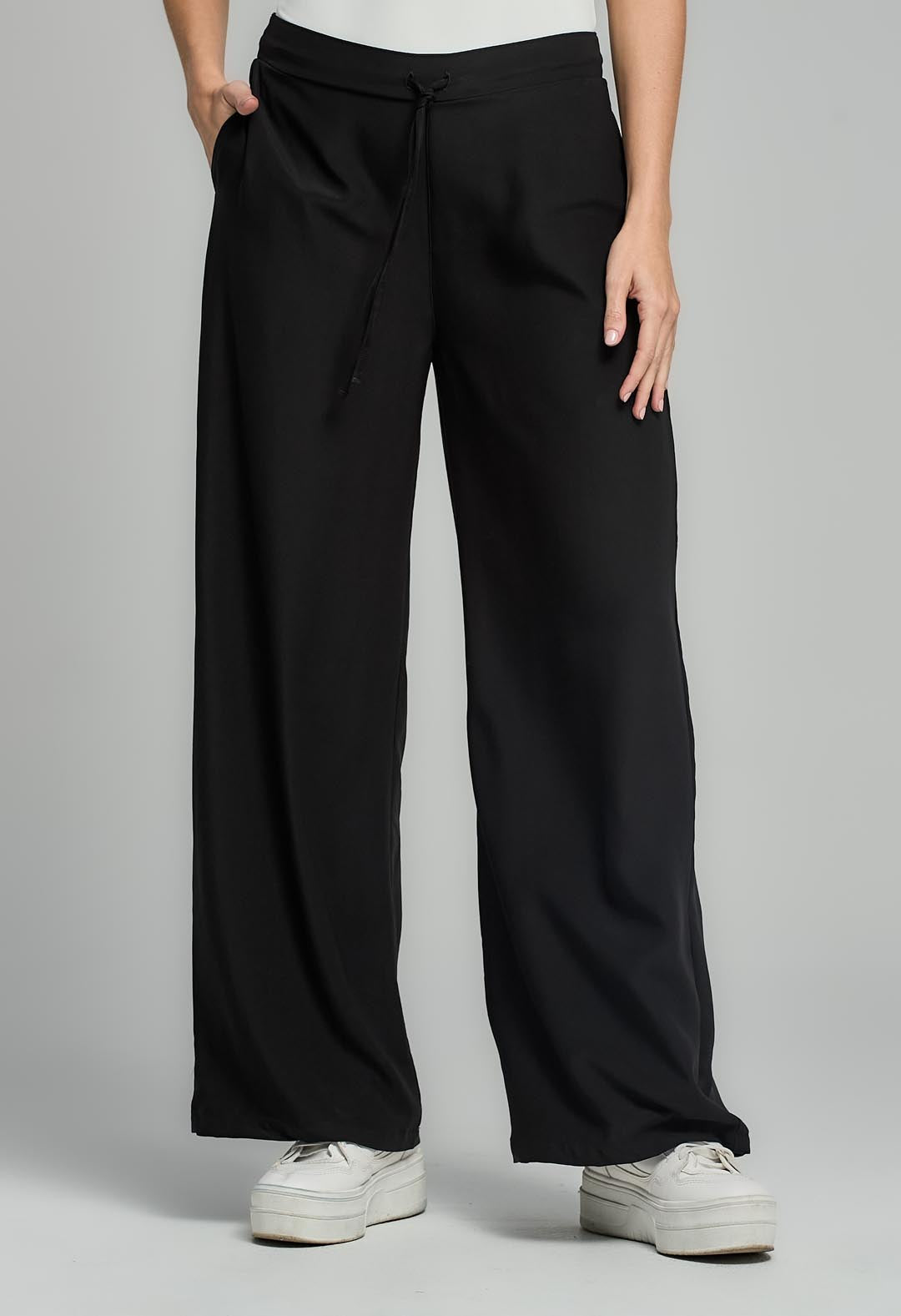 Pantalón tiro alto, color negro, elástico en cintura, bota ancha y fondo entero para mujeres.