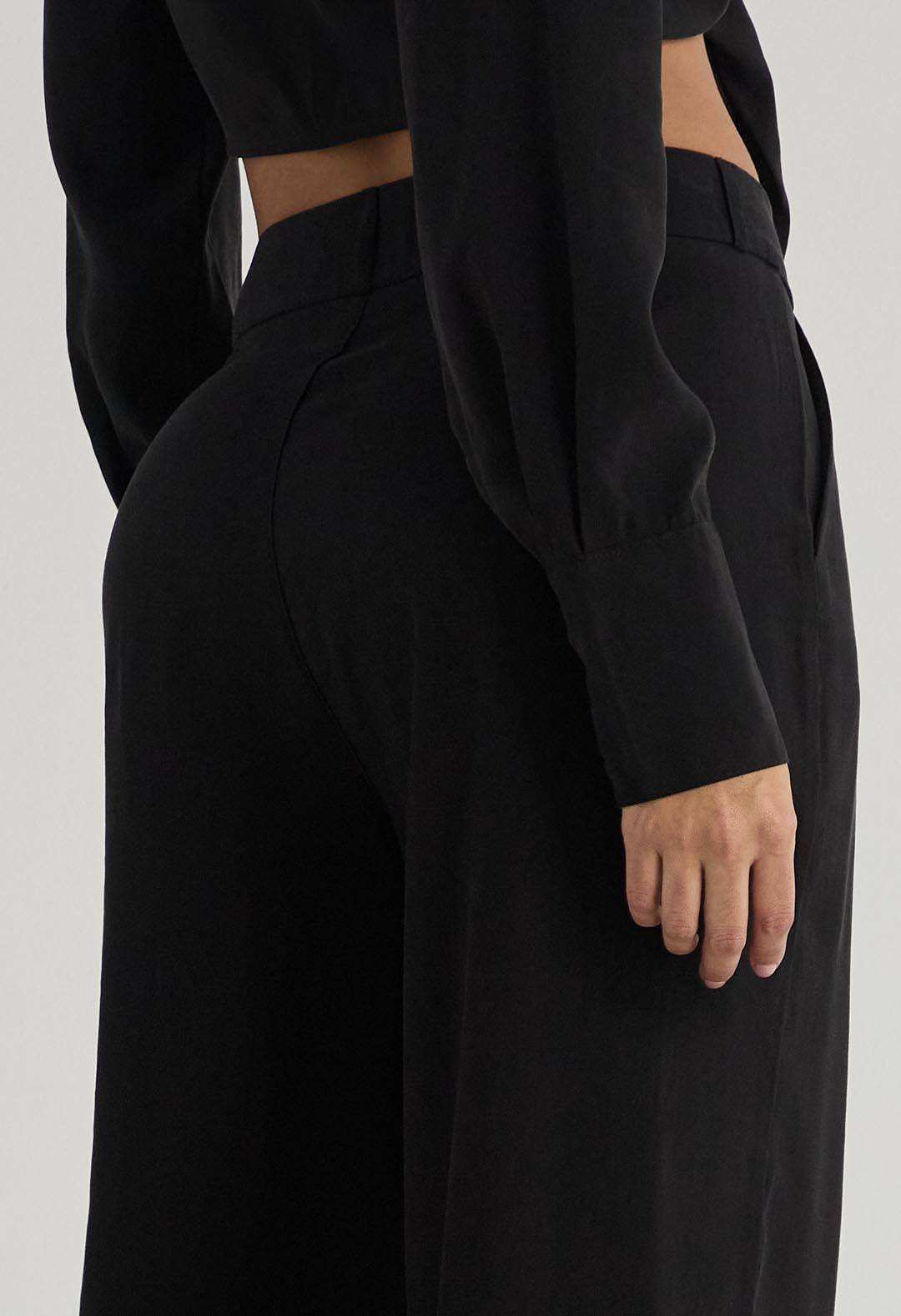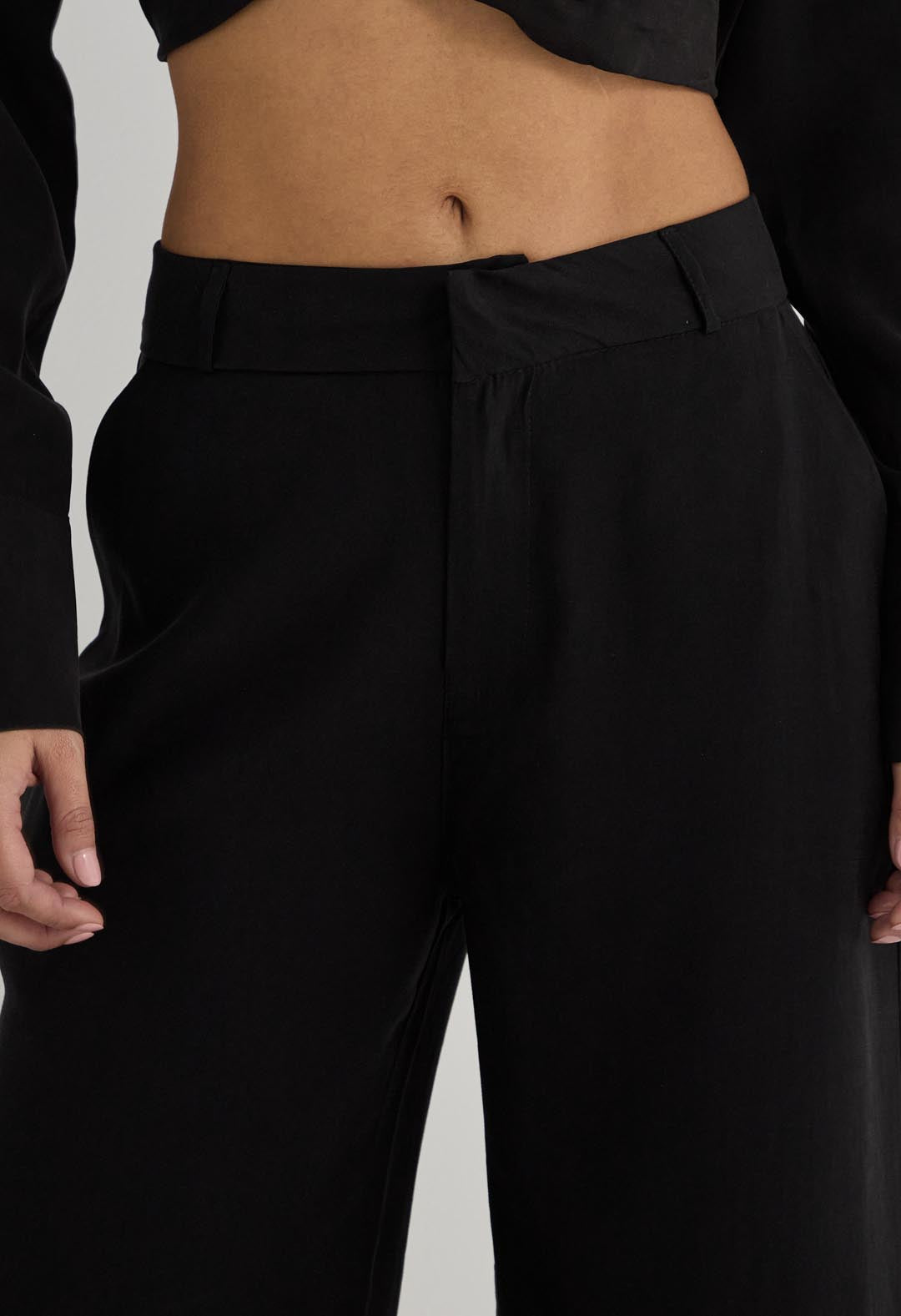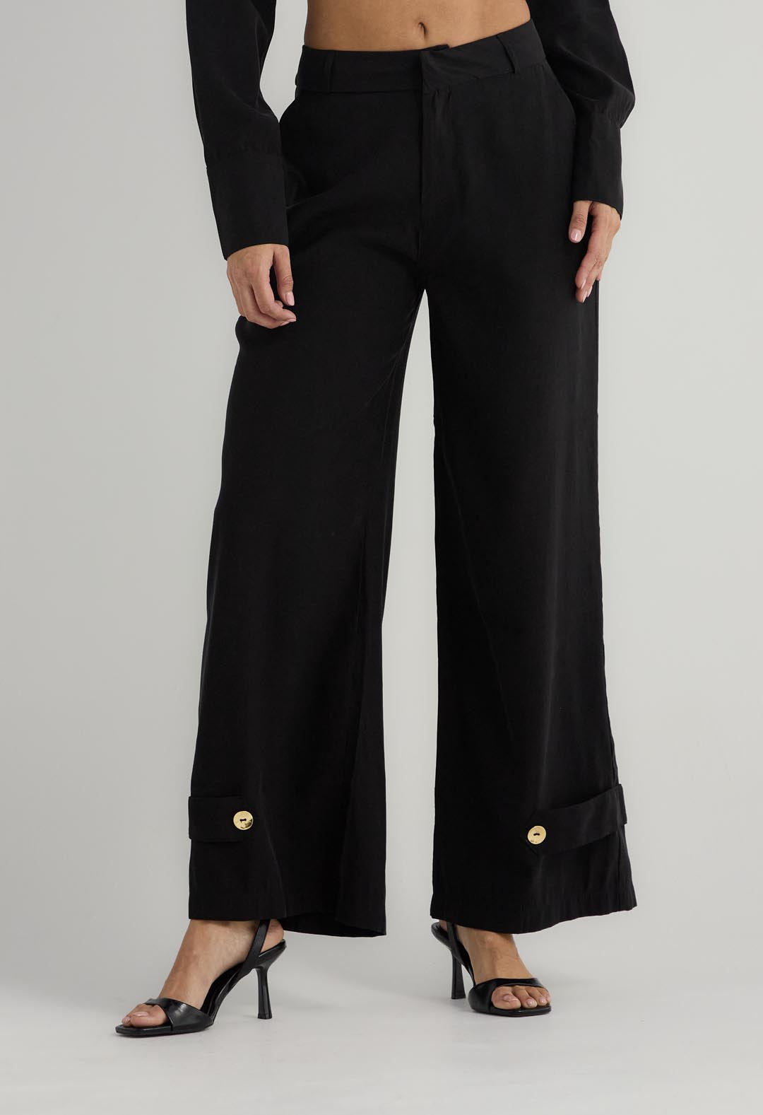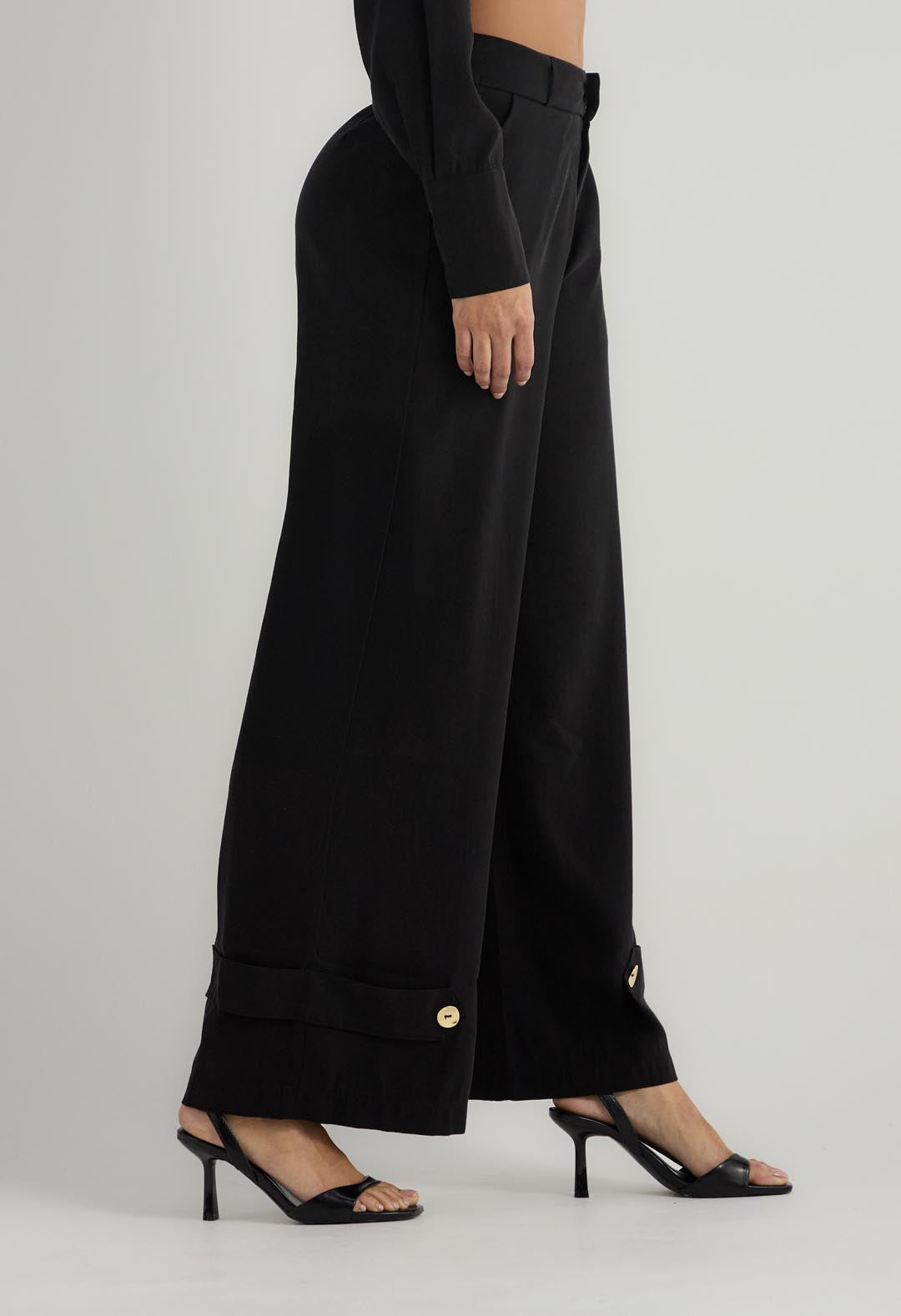 Pantalón tiro alto, color negro, con charretera en bota y bota recta para mujer.