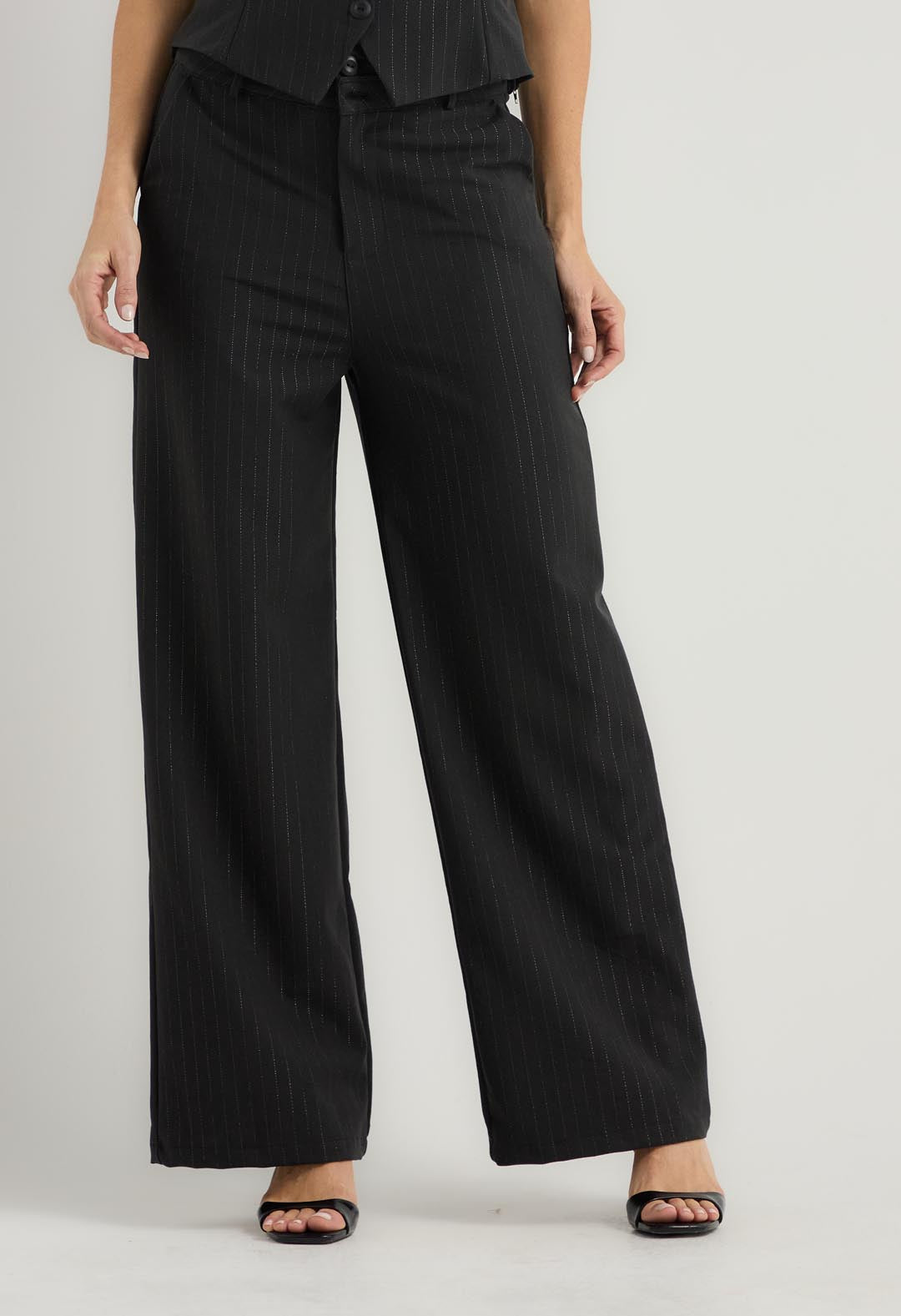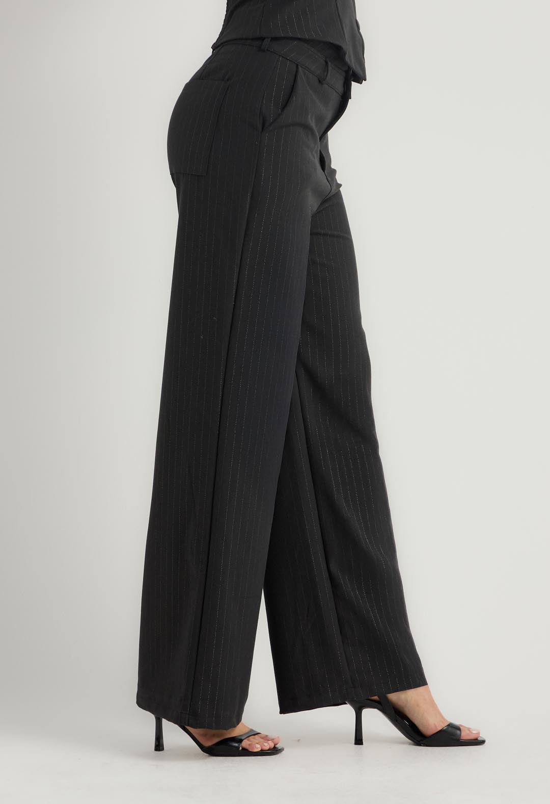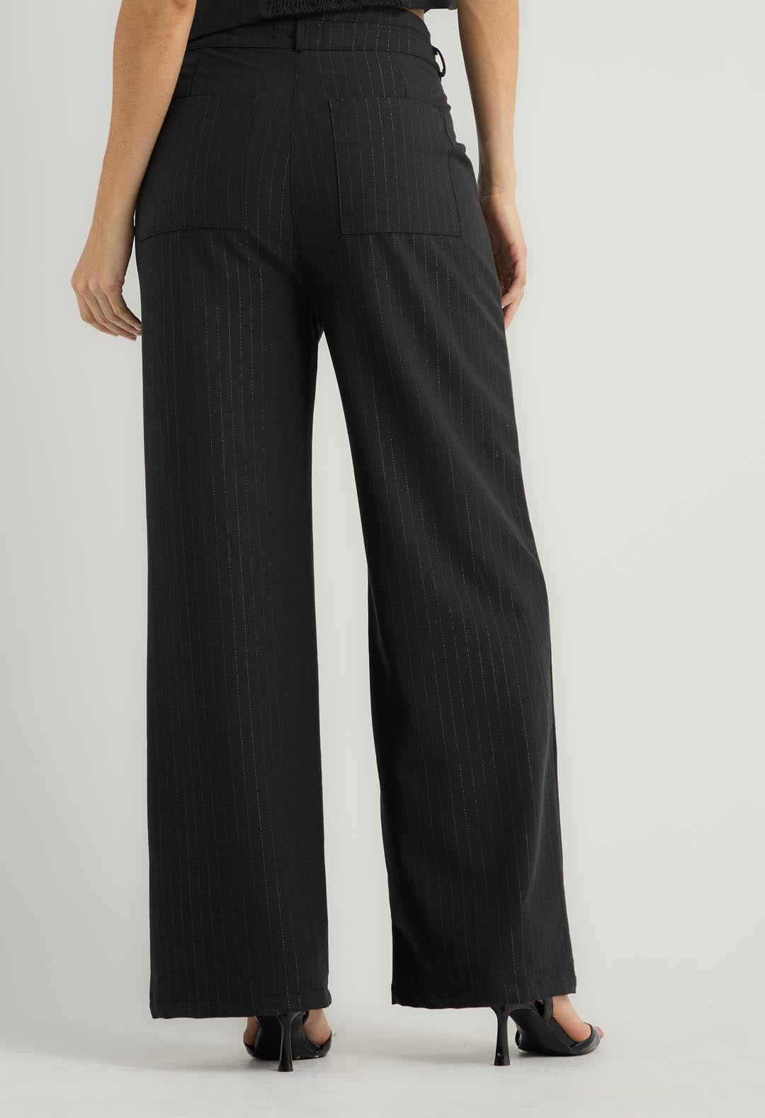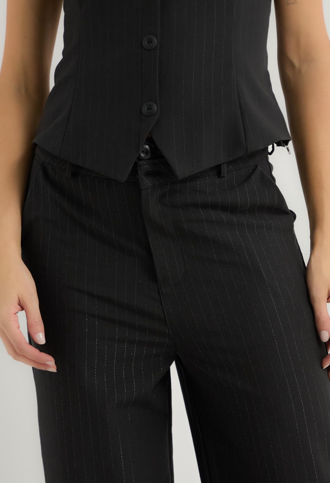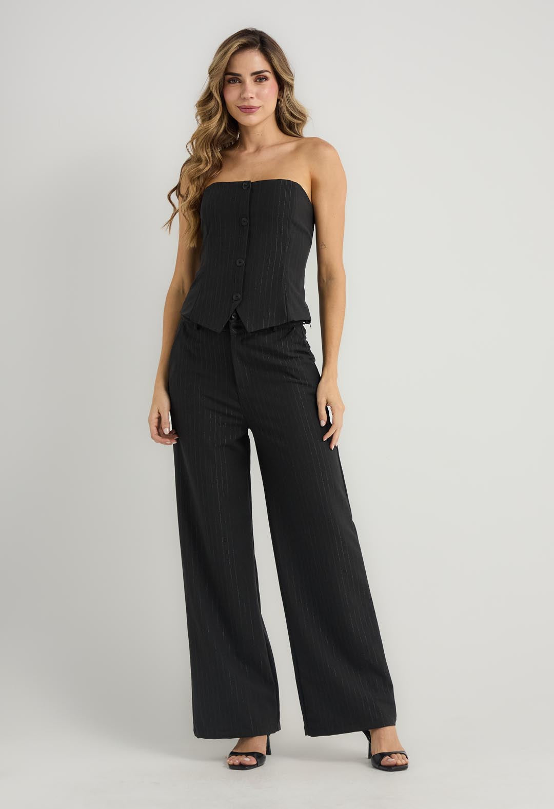 Pantalón tiro alto, color negro, doble pretina, bota recta y fondo entero para mujer.