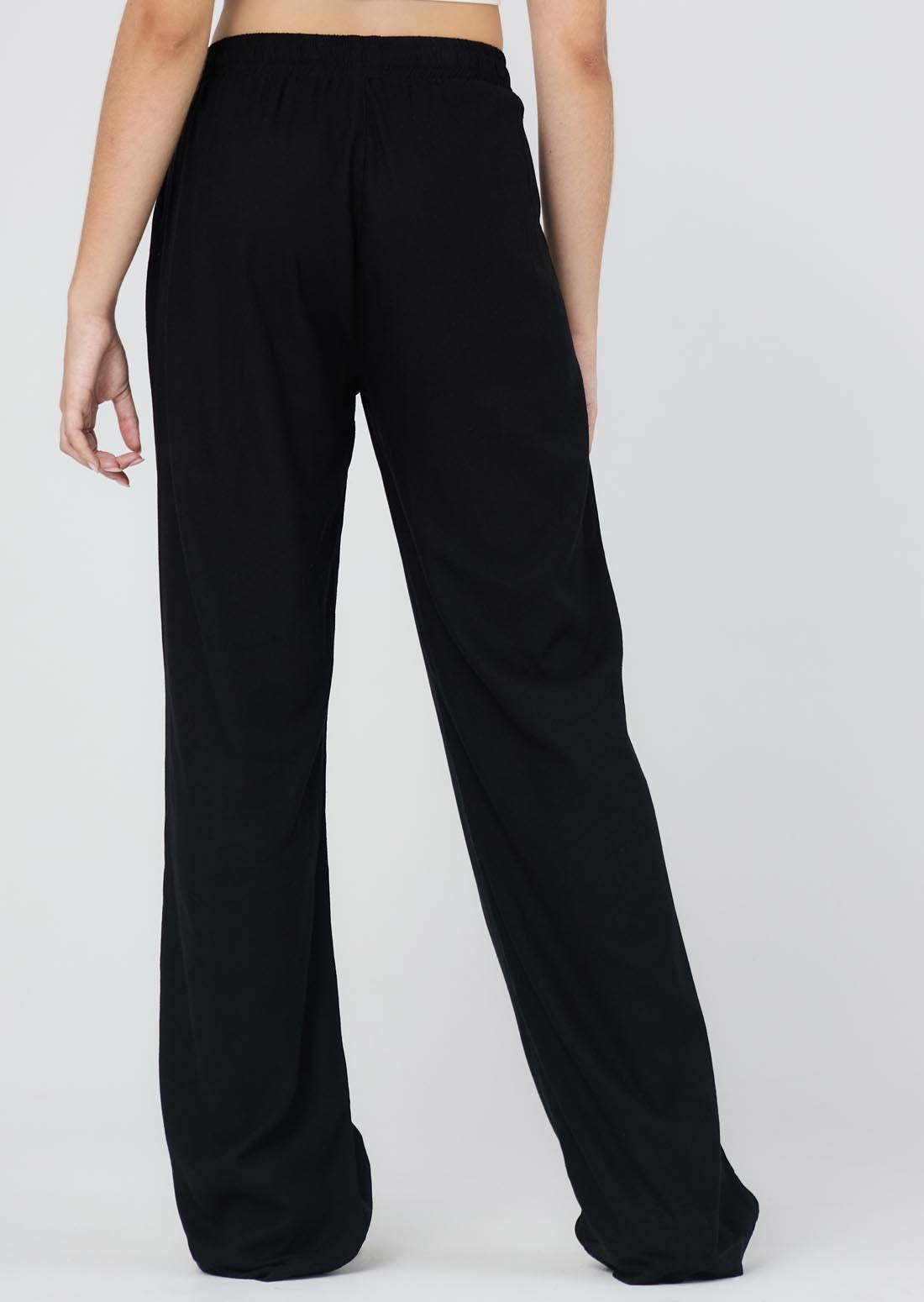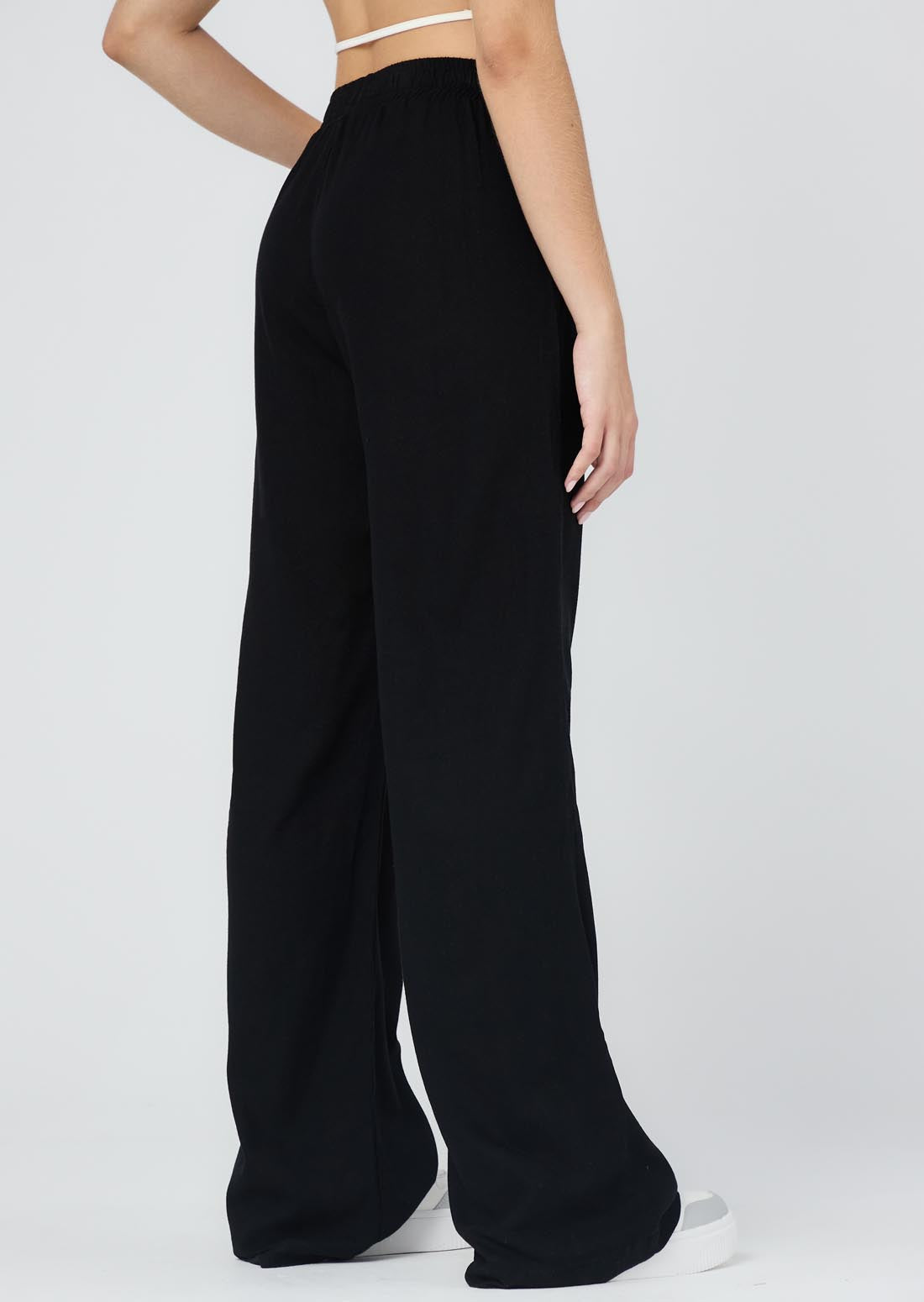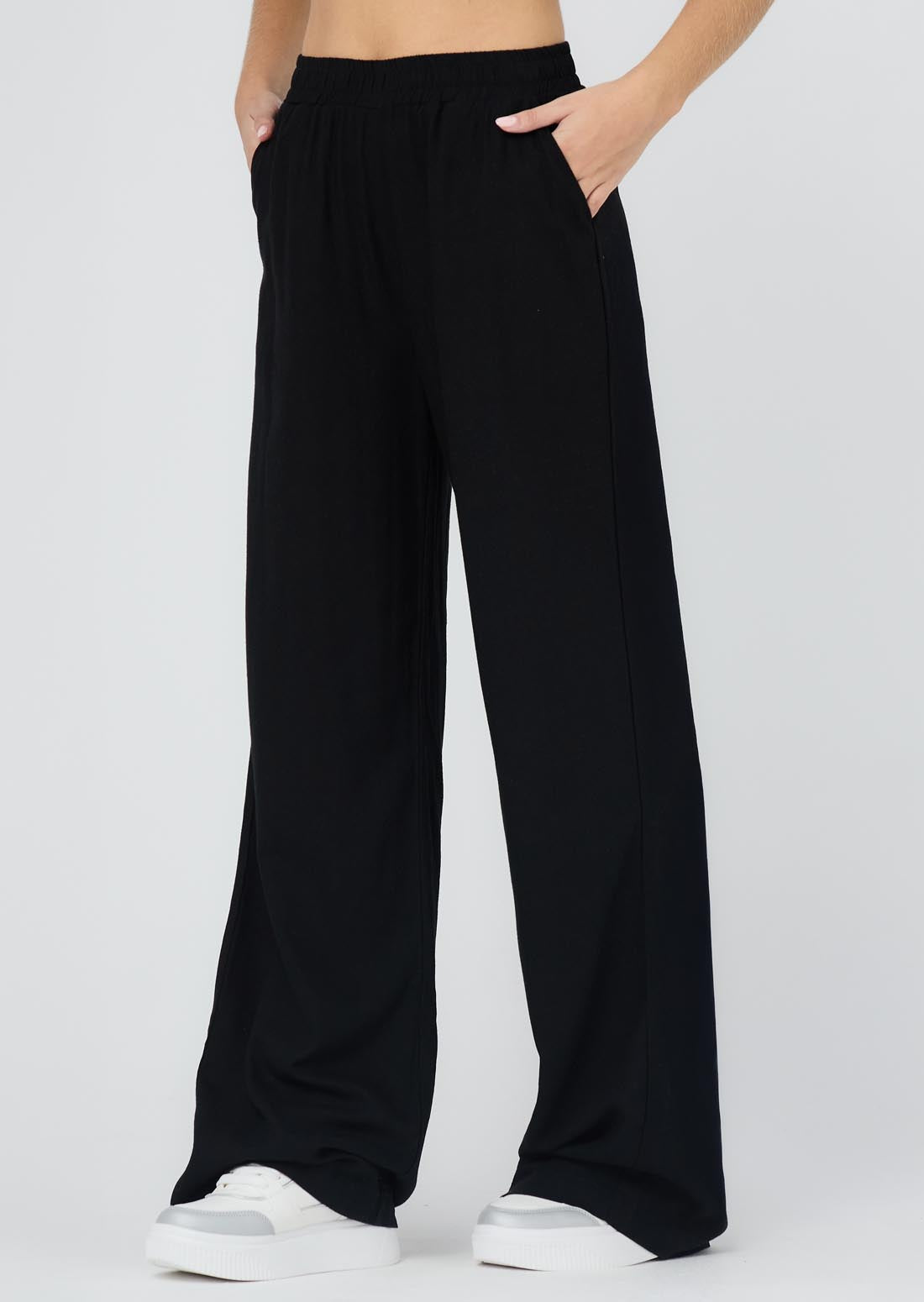 Pantalón tiro alto, color negro, pretina recogida, elástico en pretina y fondo entero para niñas.