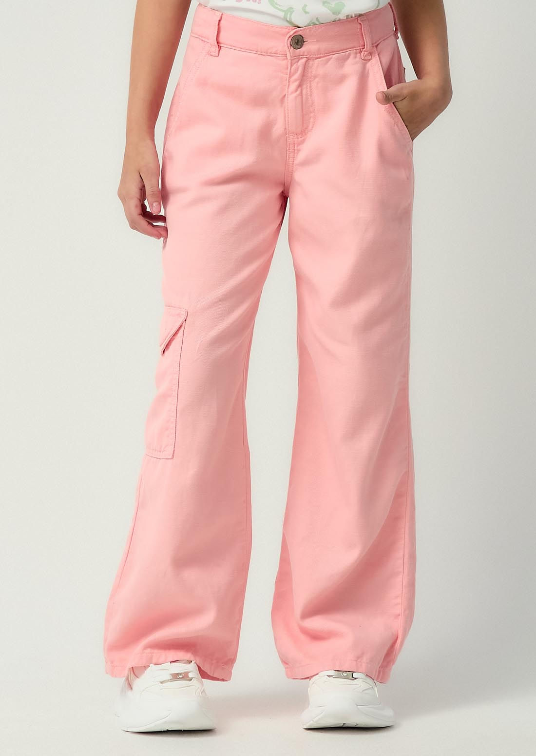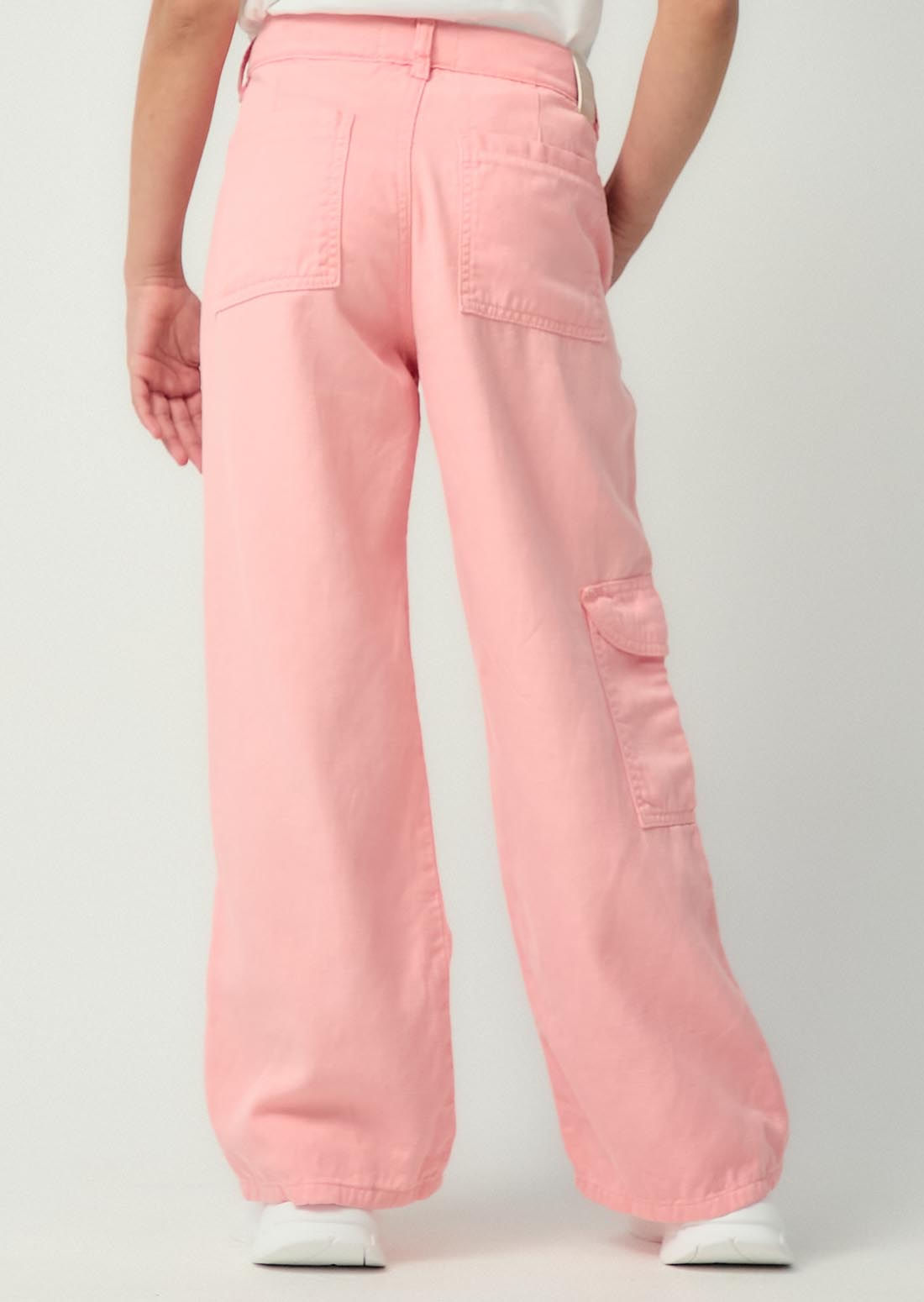 Pantalón tiro alto, color rosa pastel, bolsillos funcionales, elástico en cintura y fondo entero para niñas.