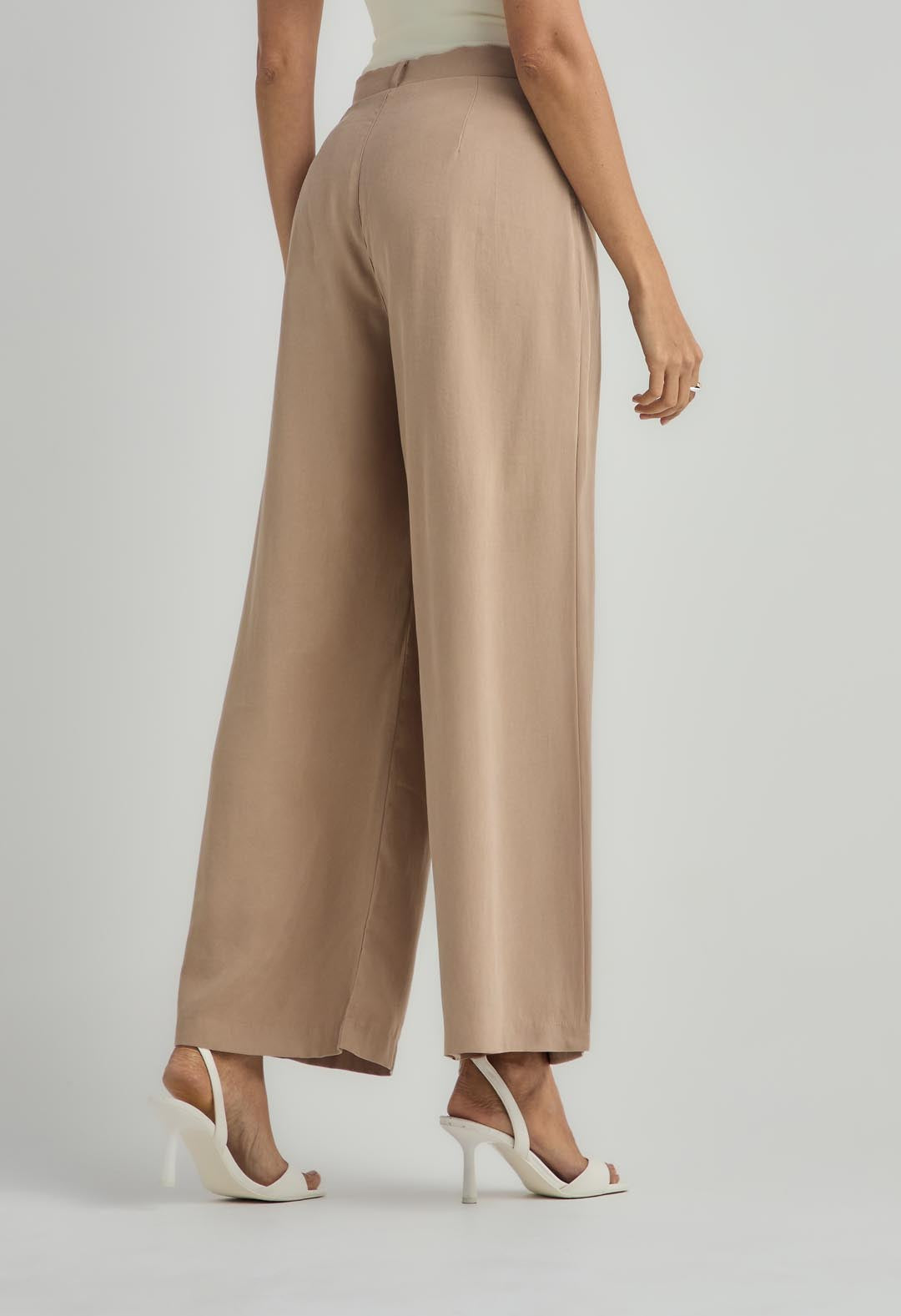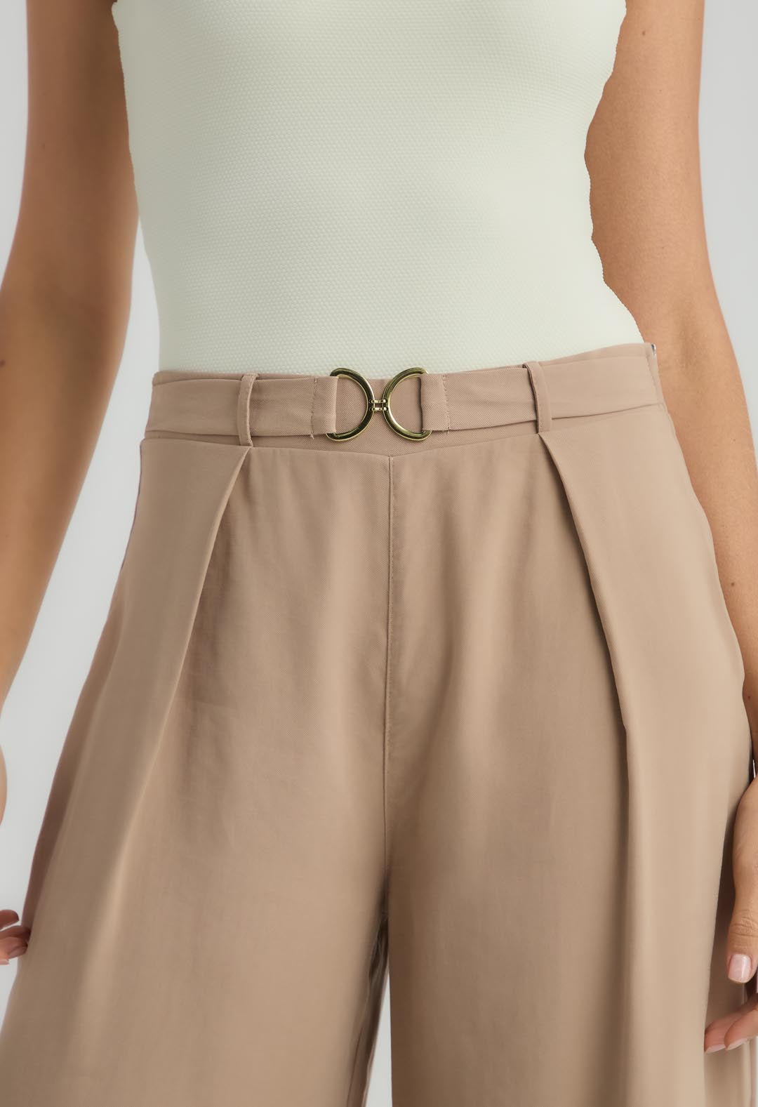 Pantalón tiro alto, color taupe y con herraje en frente para mujer.