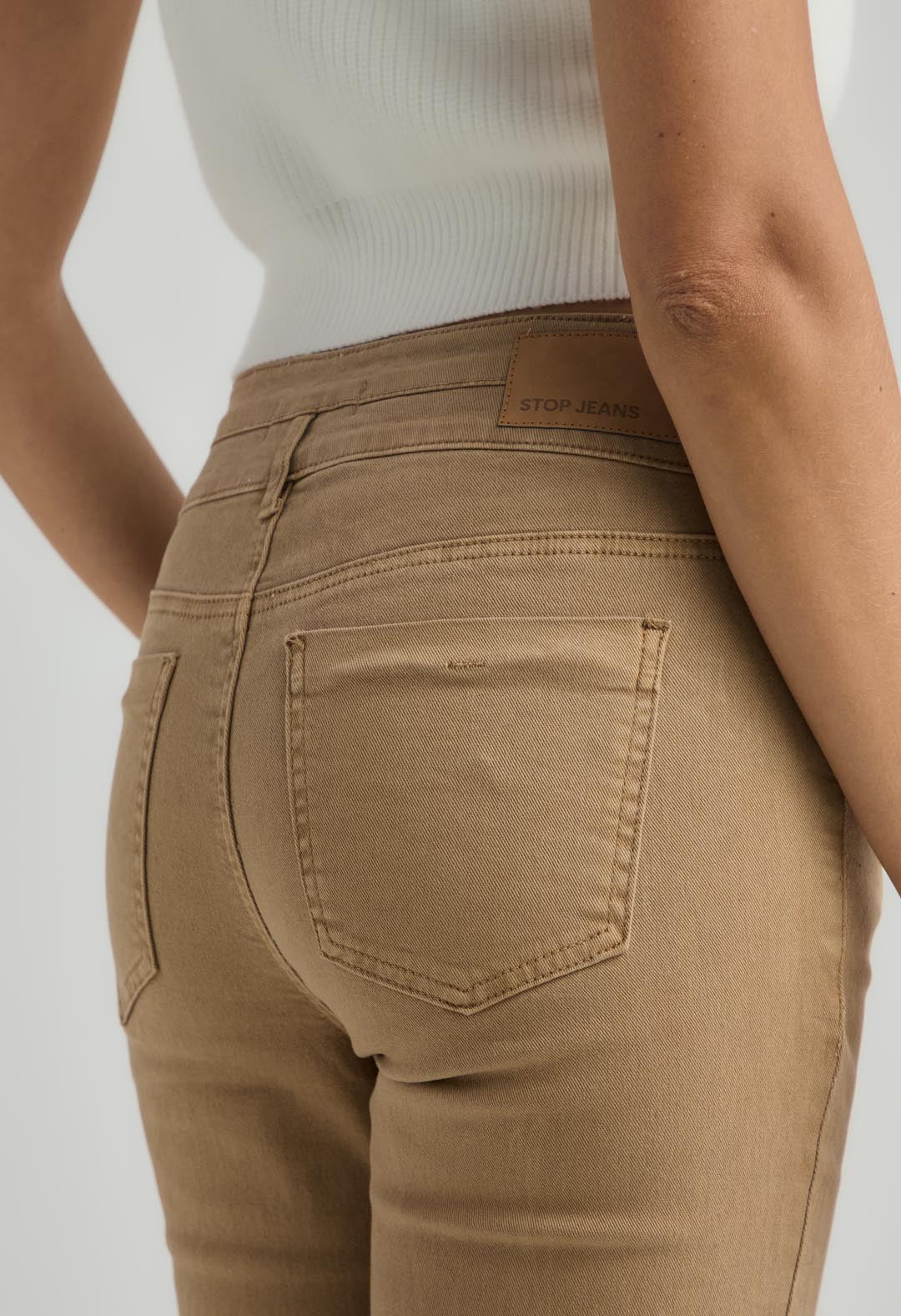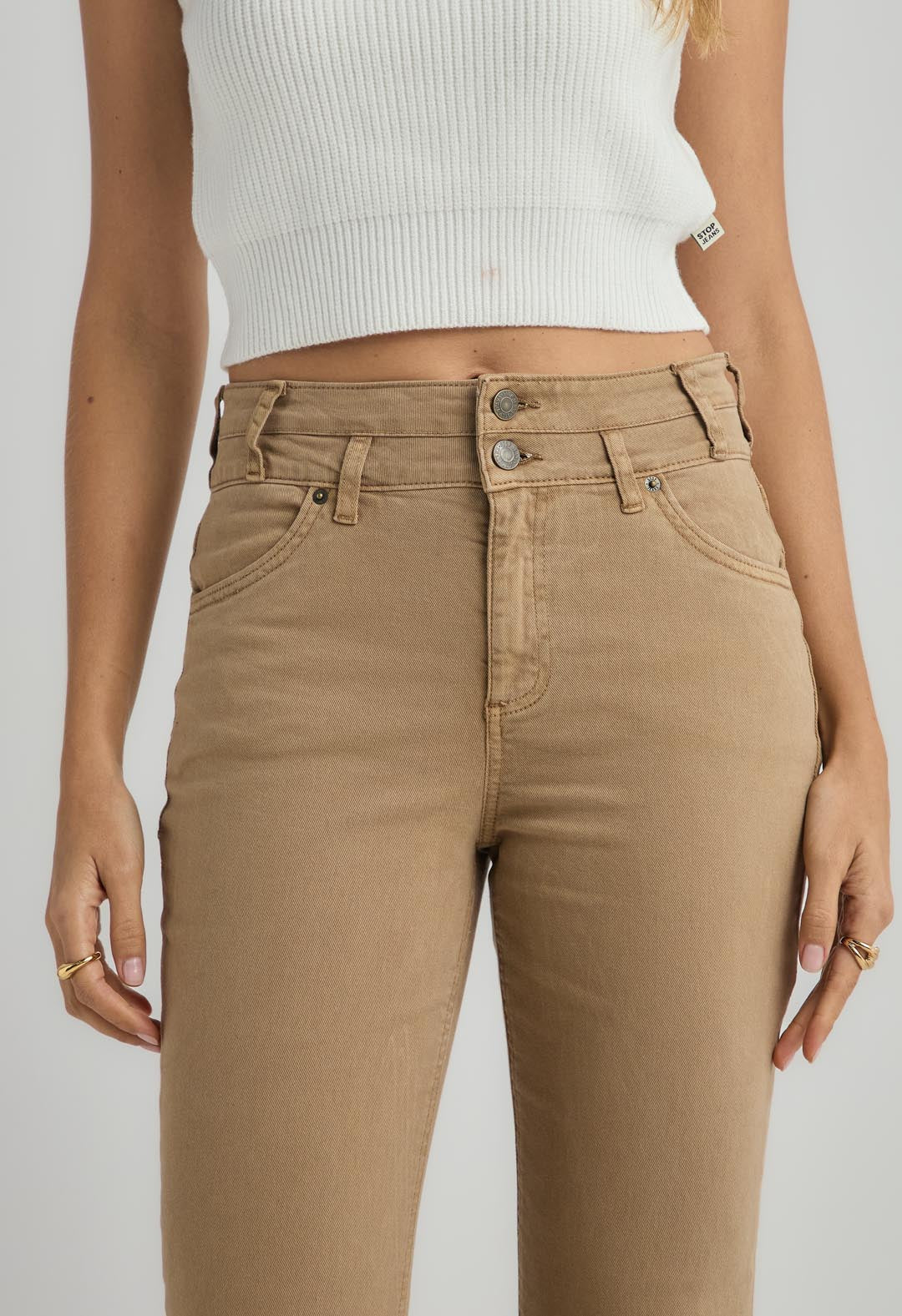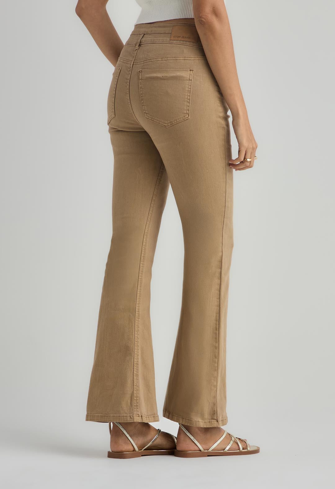 Pantalón tejano tiro alto, color arena, doble pretina, bota campana y fondo entero para mujer.
