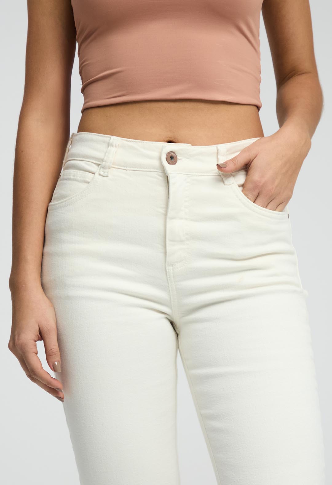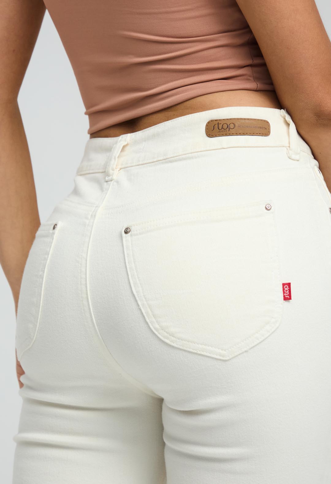 Jean tejano, tiro alto, color marfil, bolsillos funcionales, bota amplia y fondo entero para mujeres.