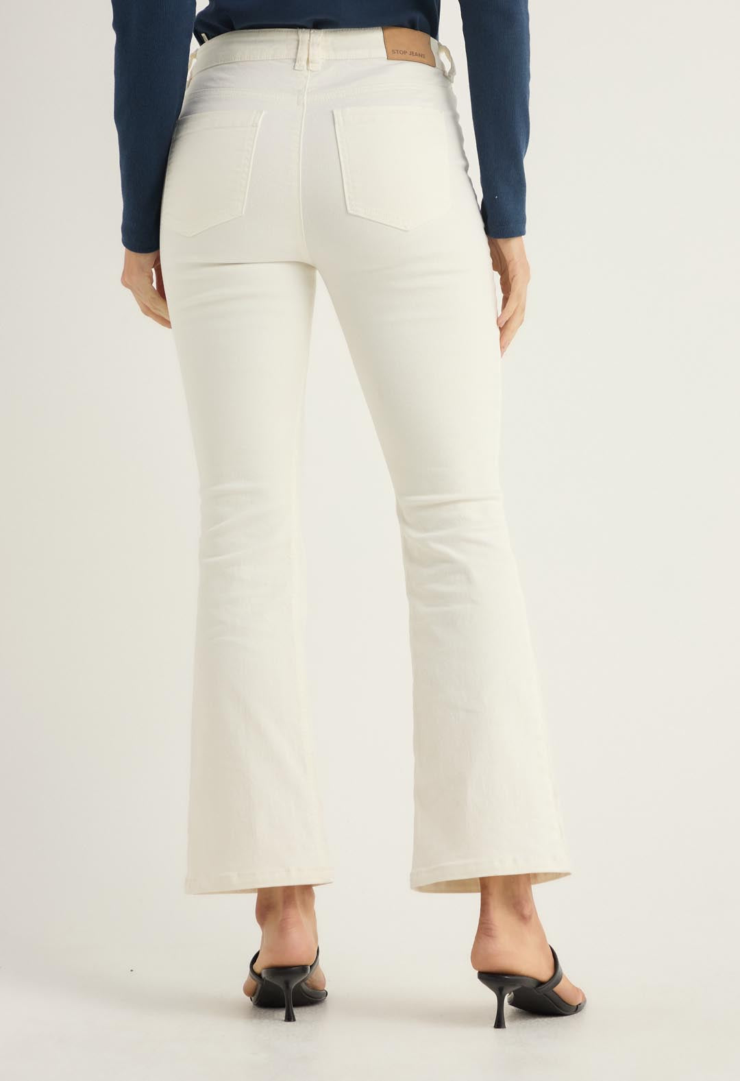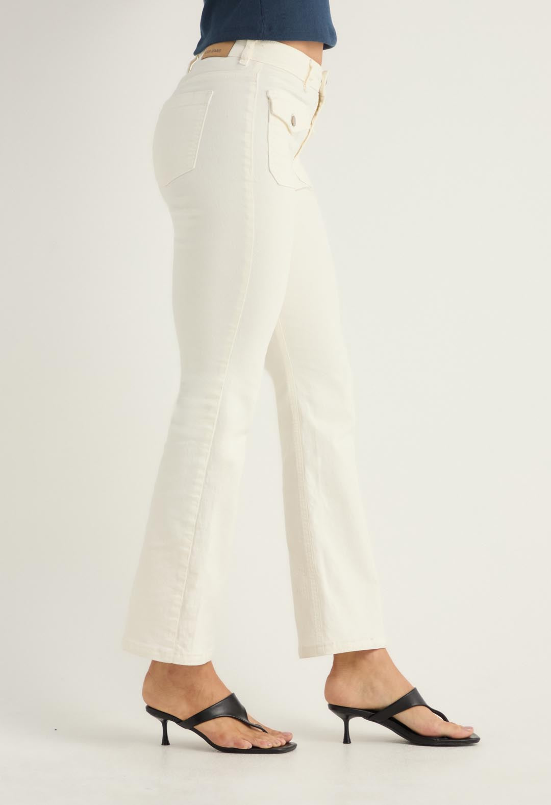 Jean tejano tiro alto, color marfil, con bolsillos y tapas para mujer.