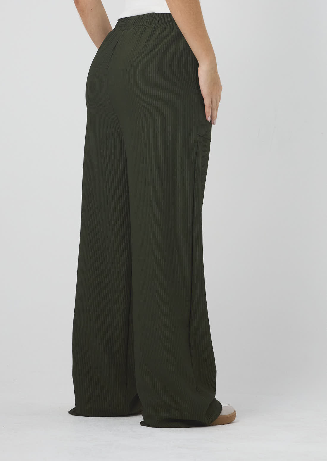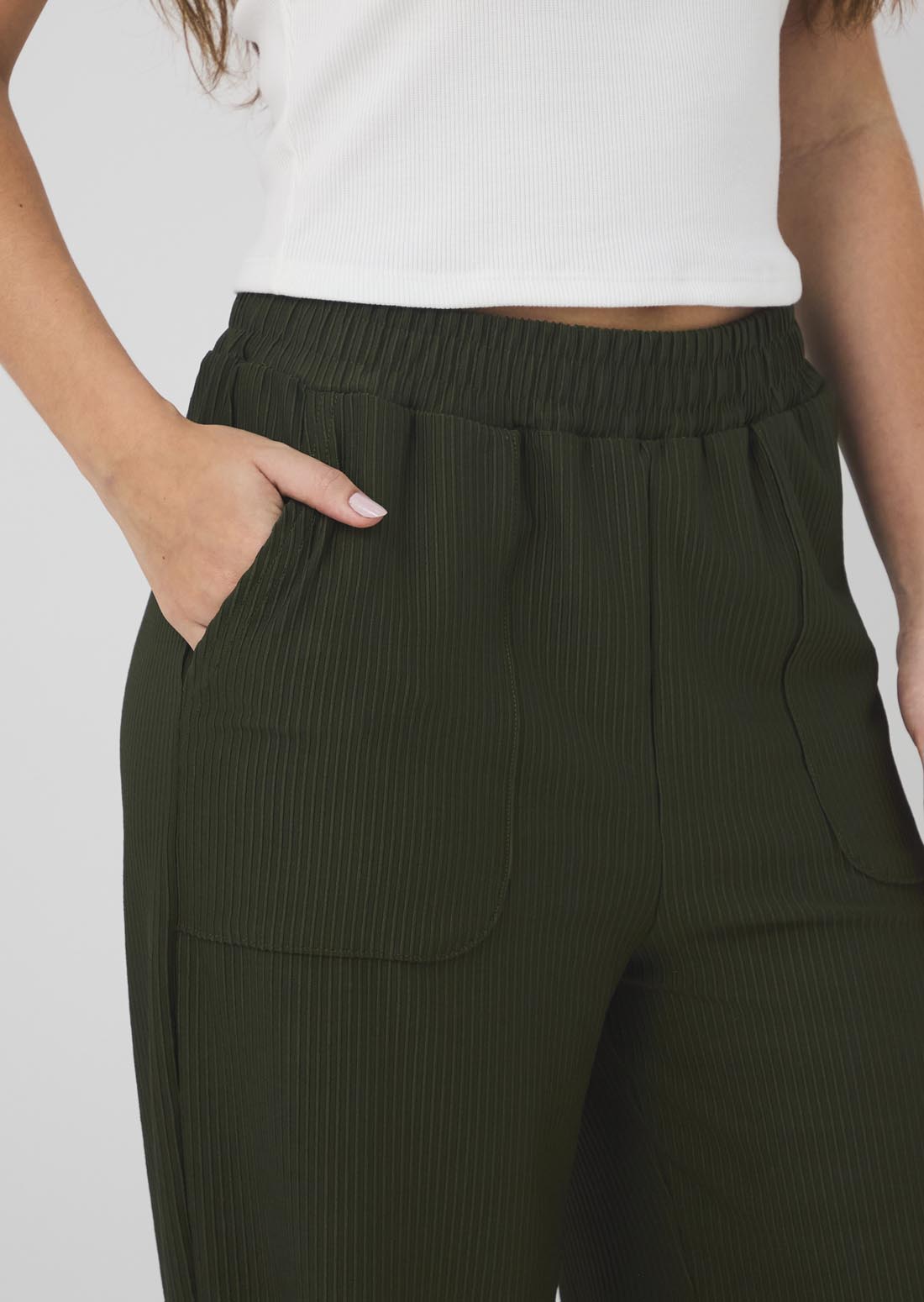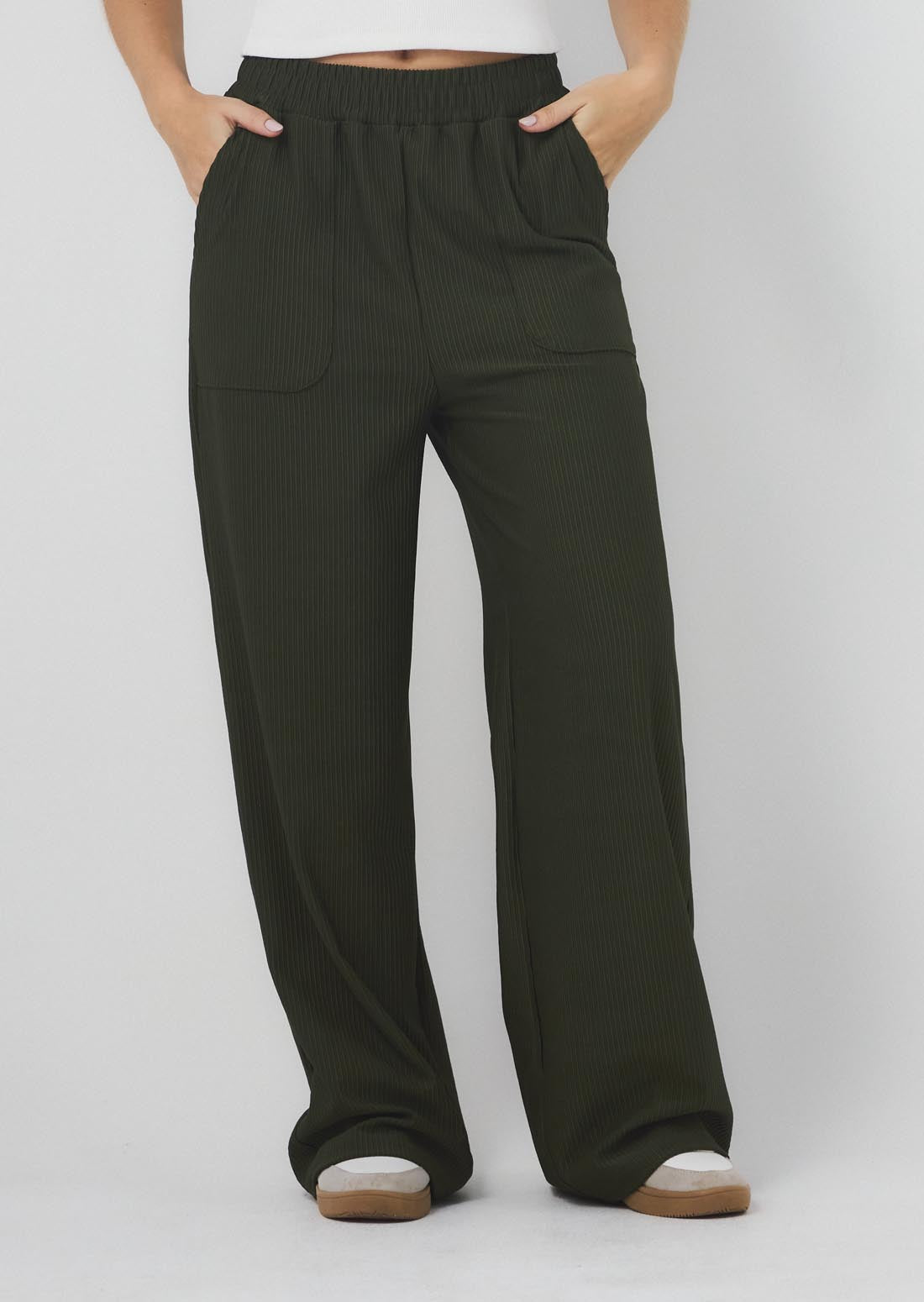 Pantalón tiro alto, color verde militar, bolsillos en frente y fondo entero para jóvenes.