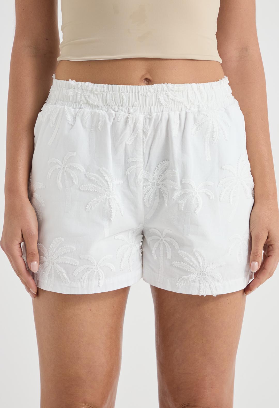Short tiro alto, color blanco, tela con efecto y fondo entero para mujer.