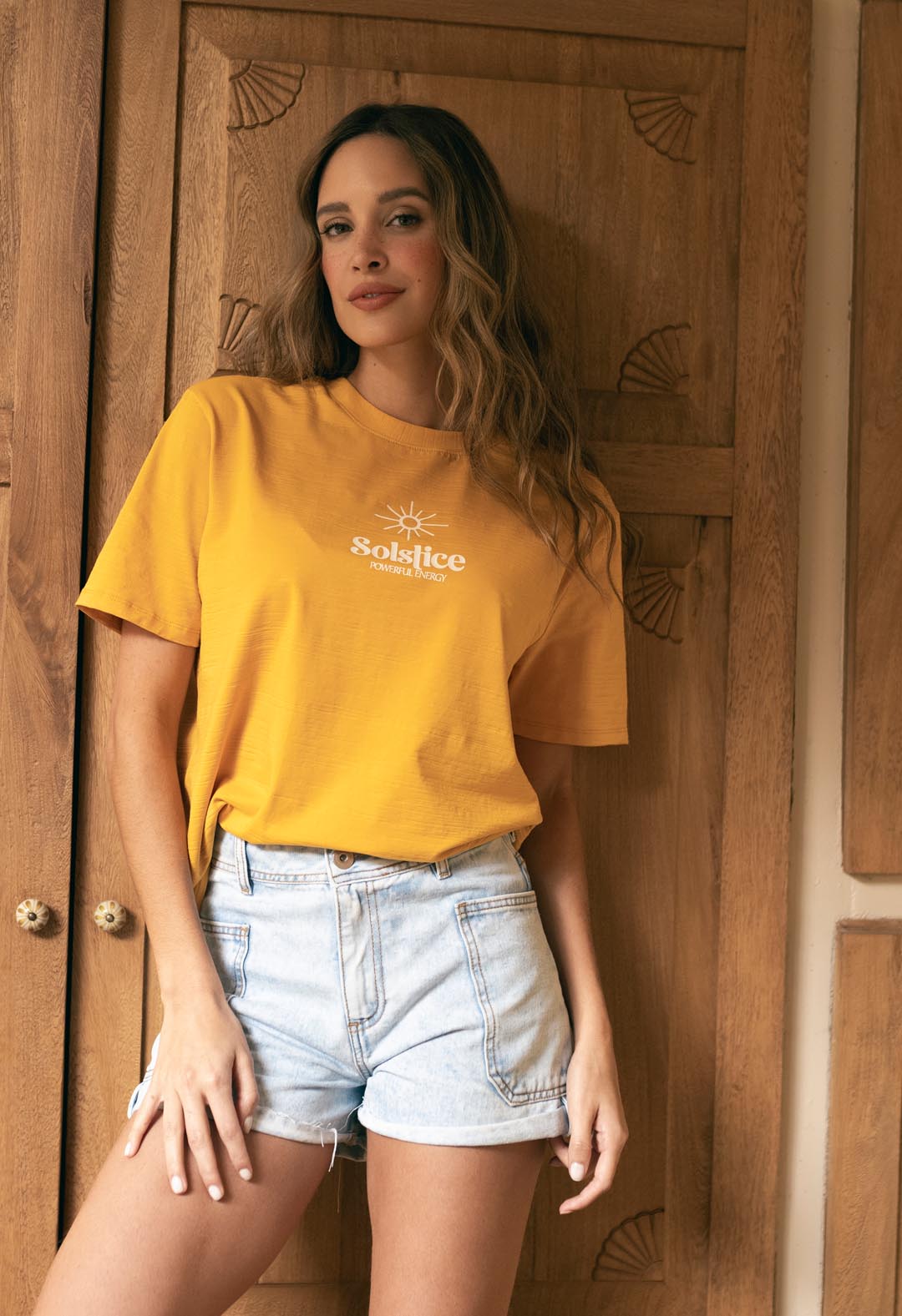 Short tiro alto, lavado claro, fondo entero, bolsillos en costados tipo parche y guardapolvo en ruedo para mujeres.