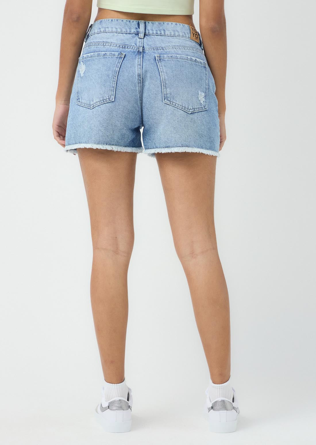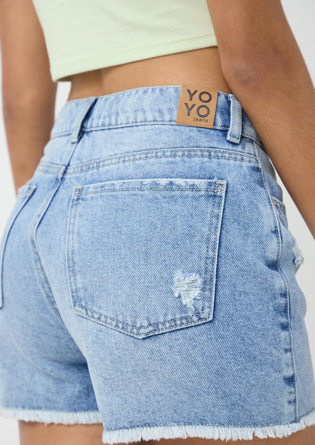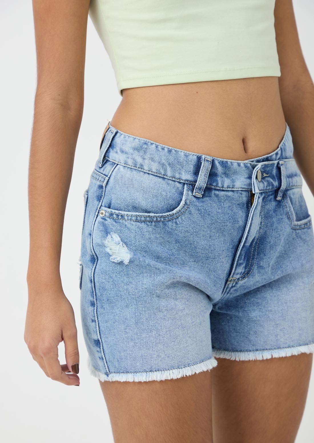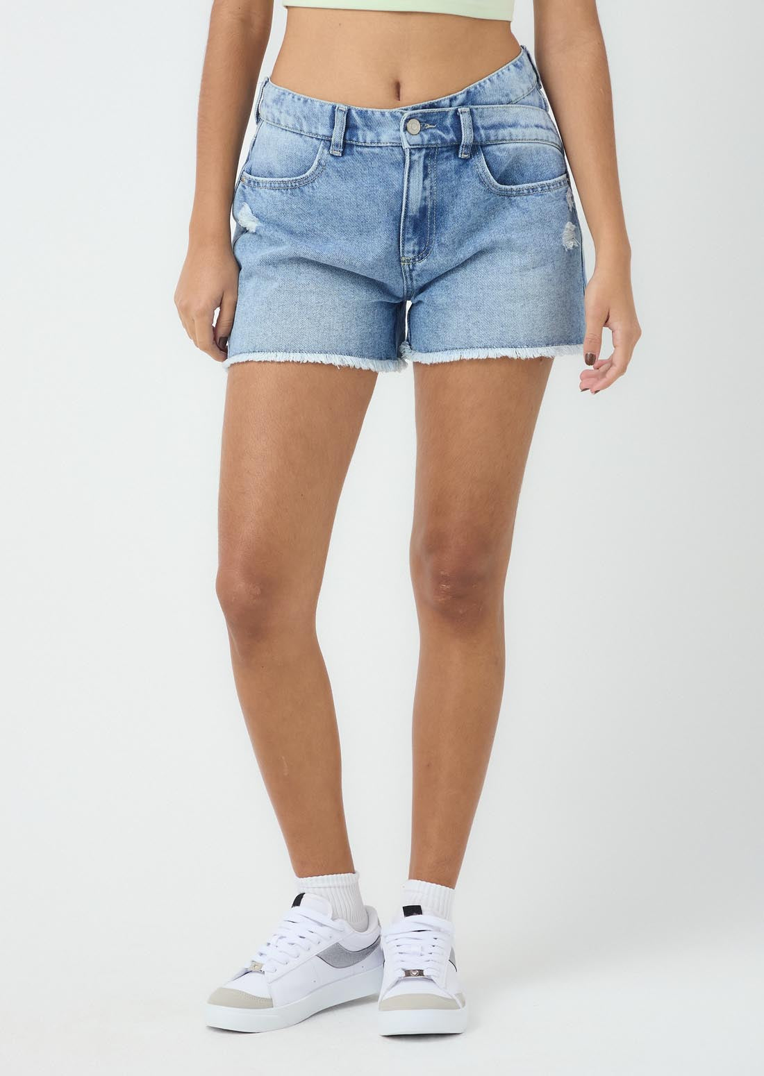 Short tiro alto, lavado claro, pretina asimetrica, en denim y fondo entero para jóvenes.