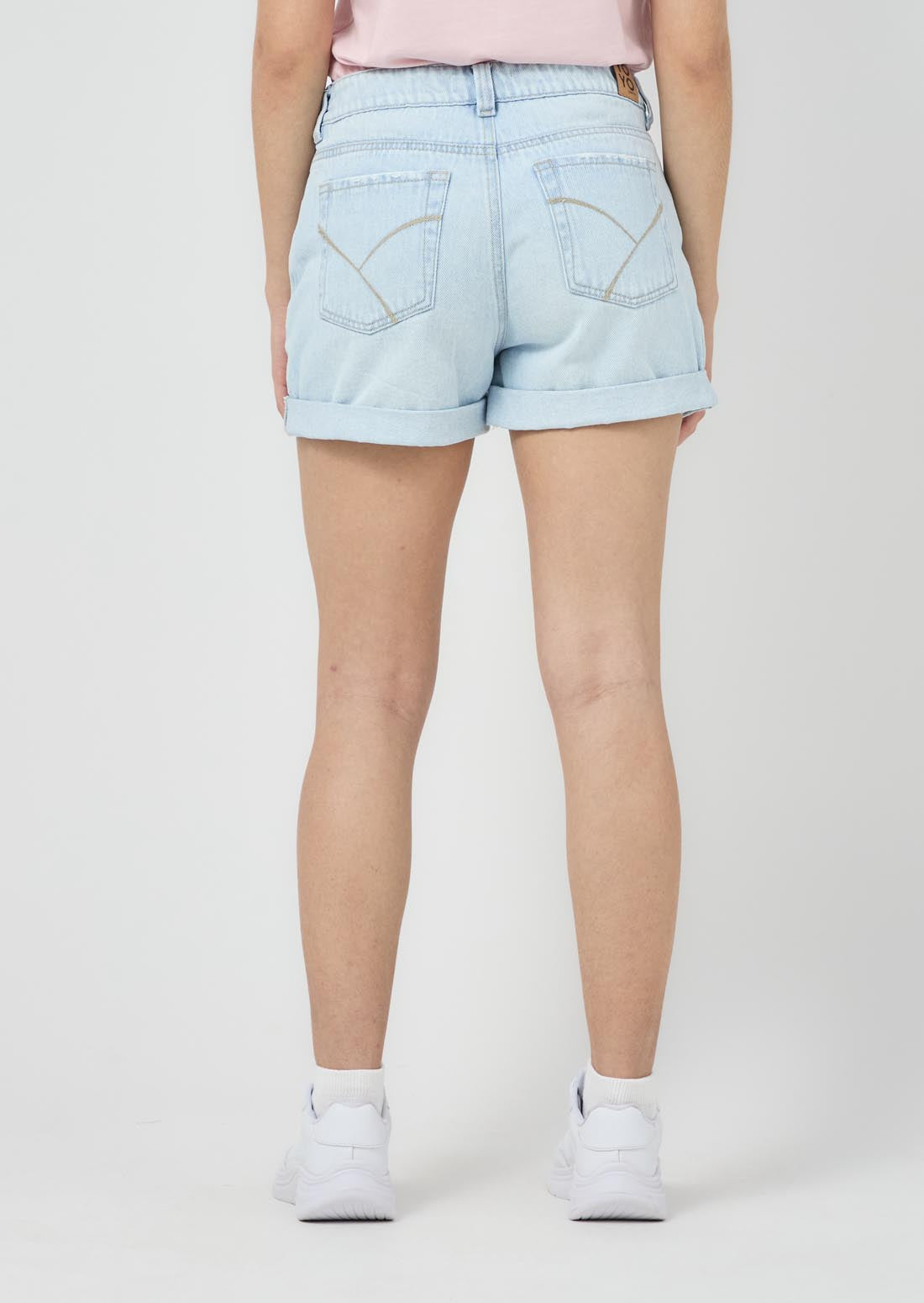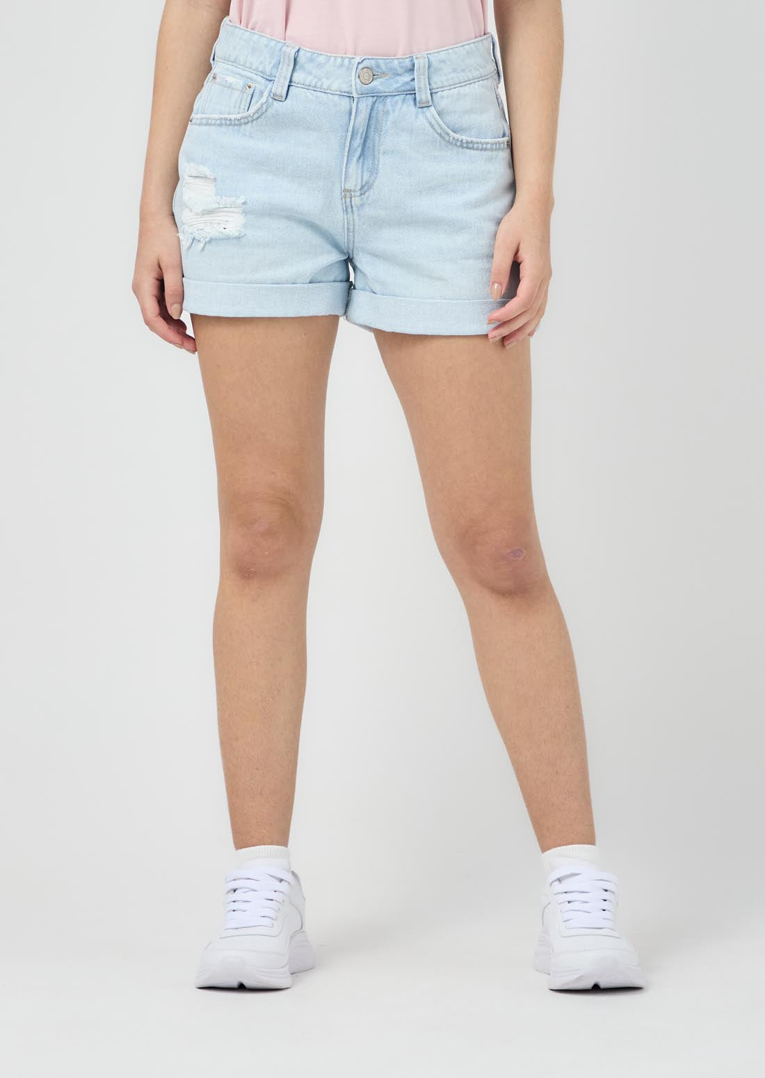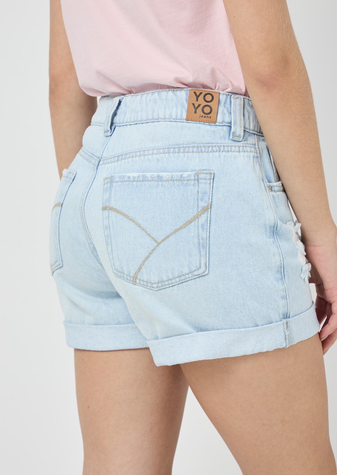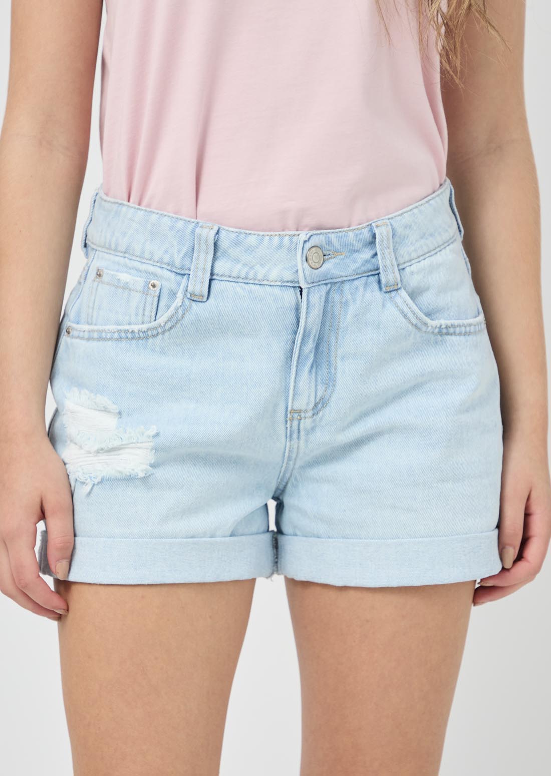 Short corto, tiro bajo, lavado claro, fondo entero y en denim claro para jóvenes.