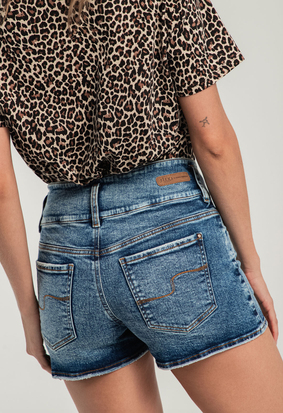 Short tiro alto, lavado medio, pretina ancha, bolsillos funcionales para mujeres.