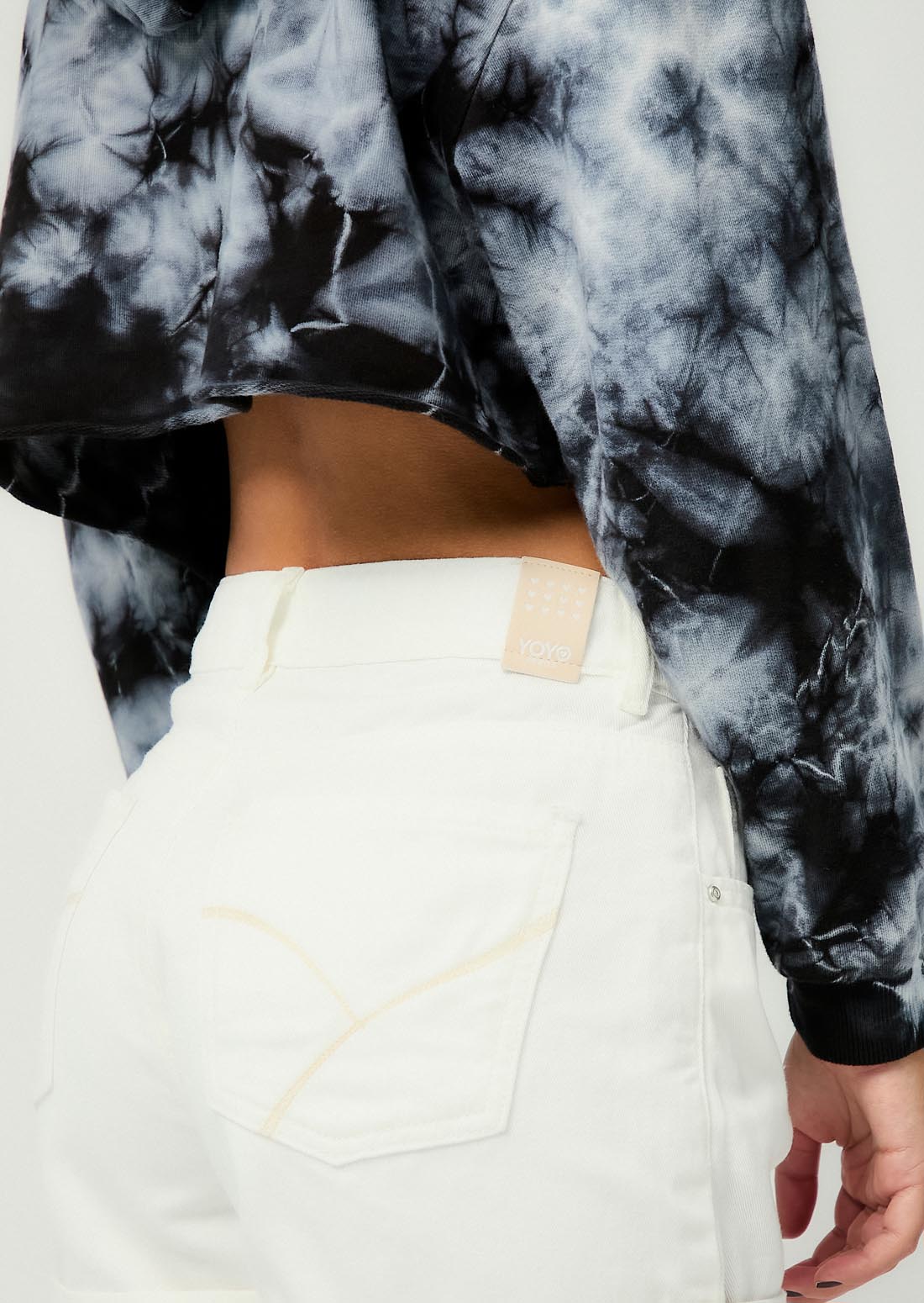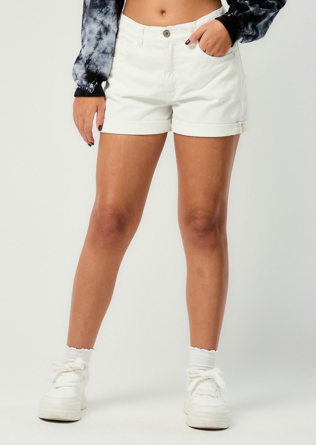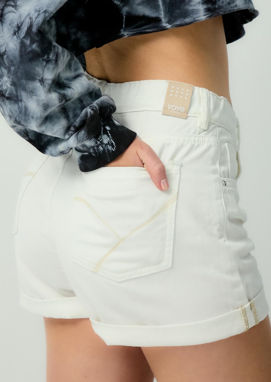 Short tiro alto, color marfil, fondo entero y bolsillos funcionales para jóvenes.