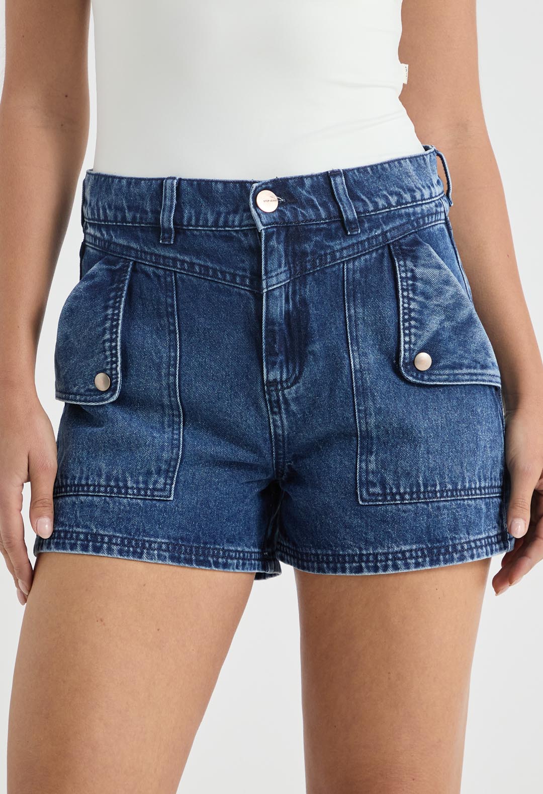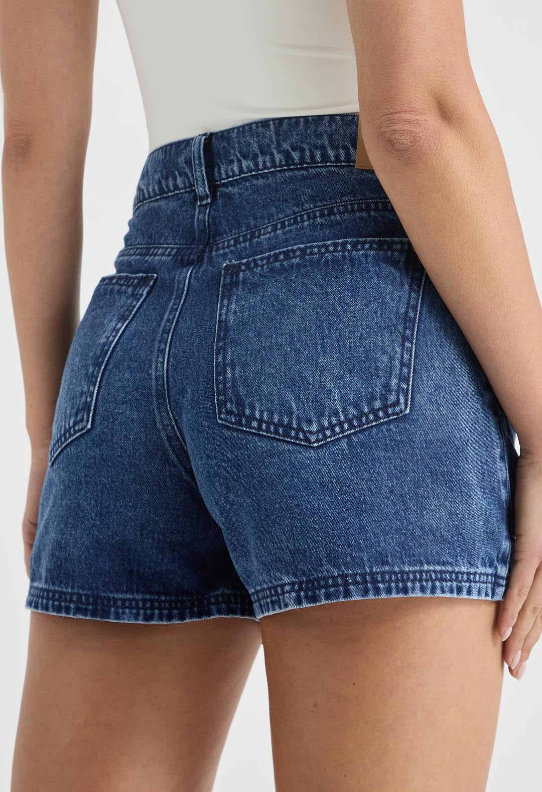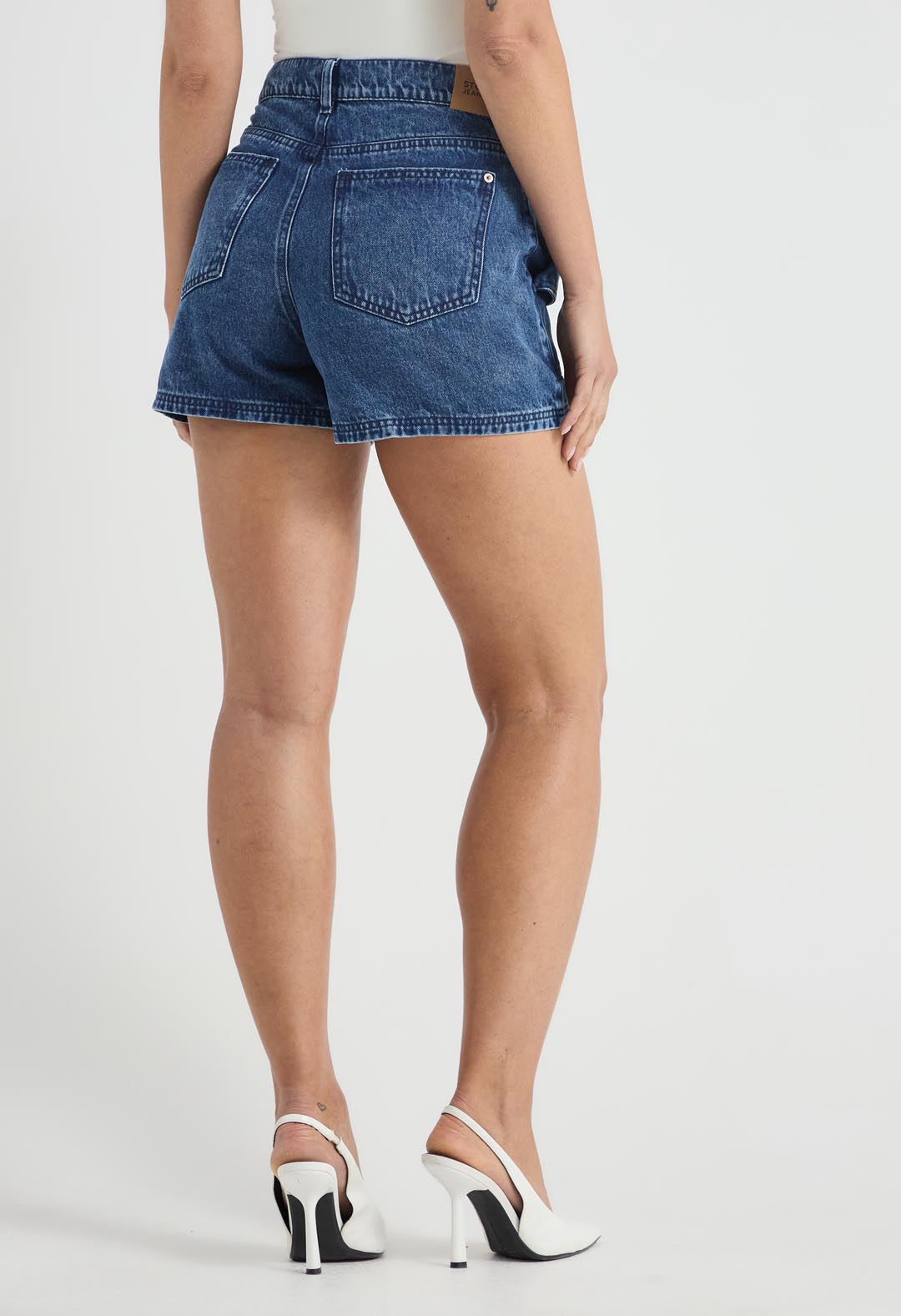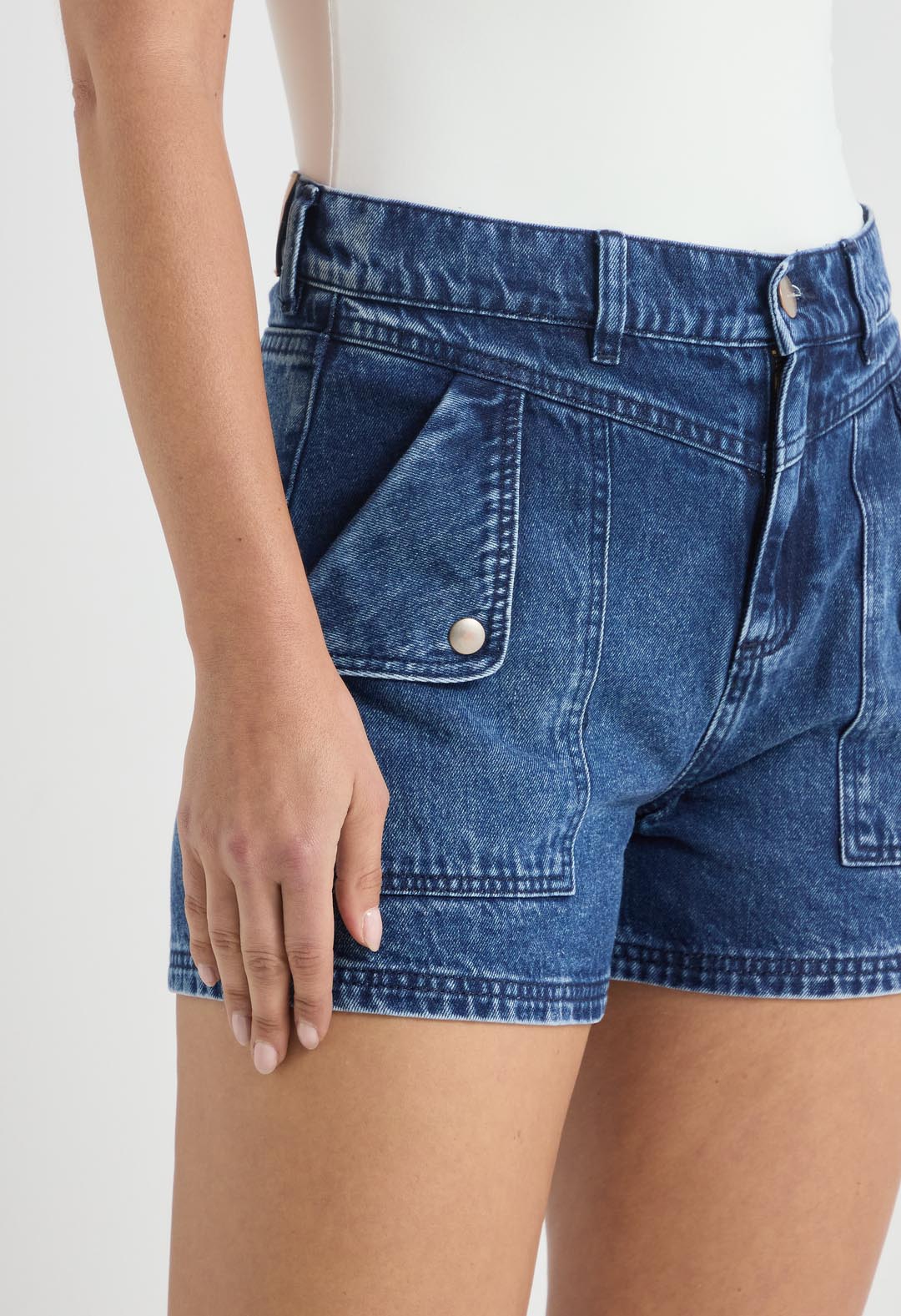 Short tiro alto, lavado medio, corto, con bolsillos y fondo entero para mujer.