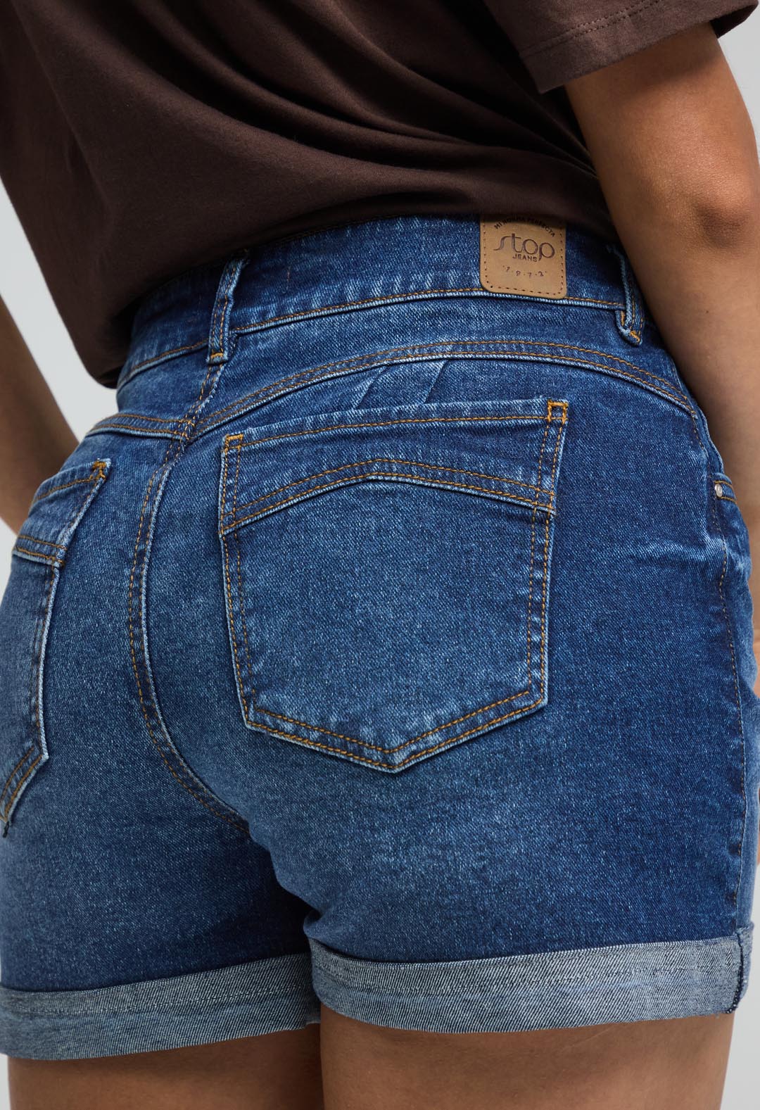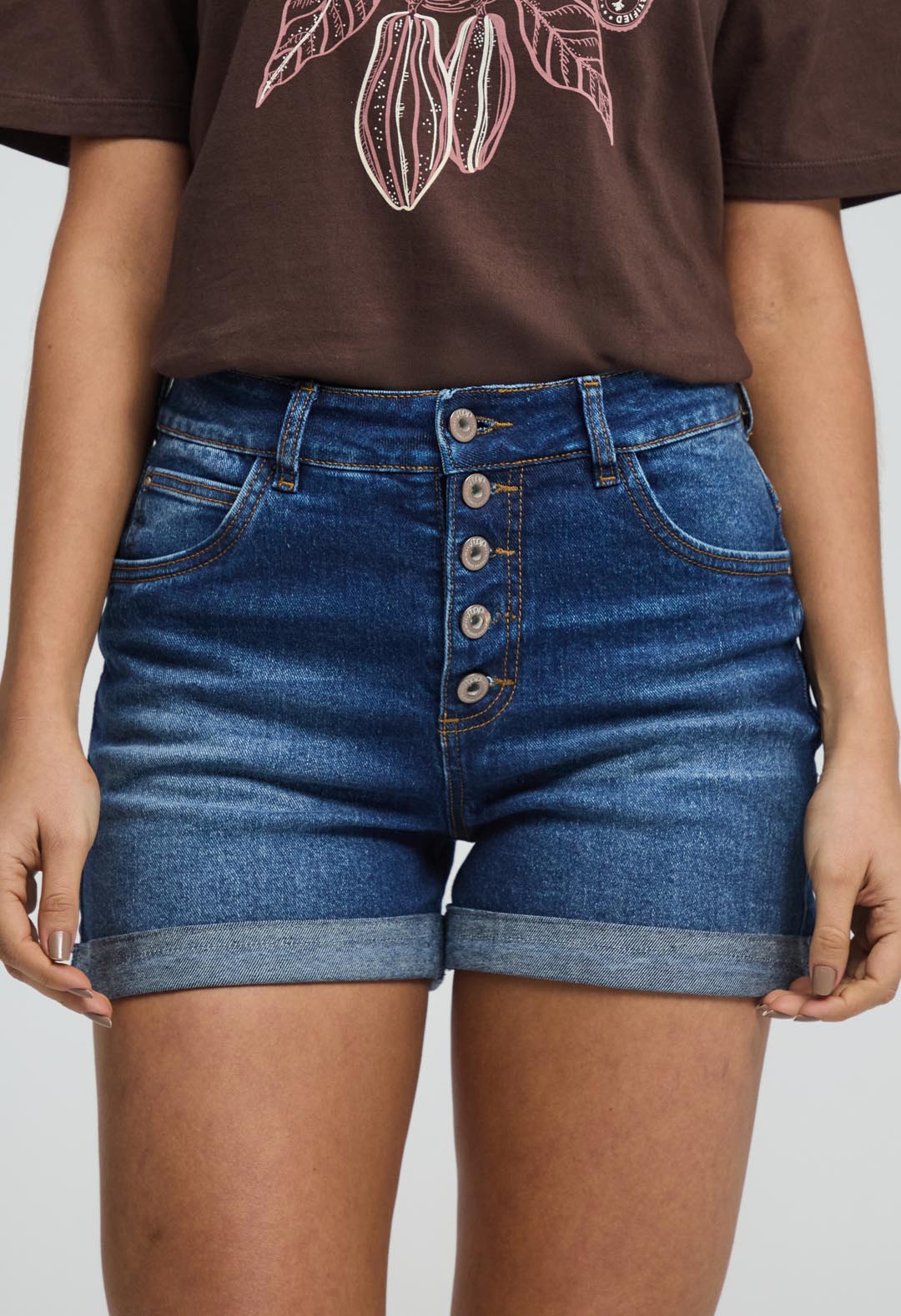 Short tiro medio, lavado medio oscuro, botones expuestos y fondo entero para mujeres.