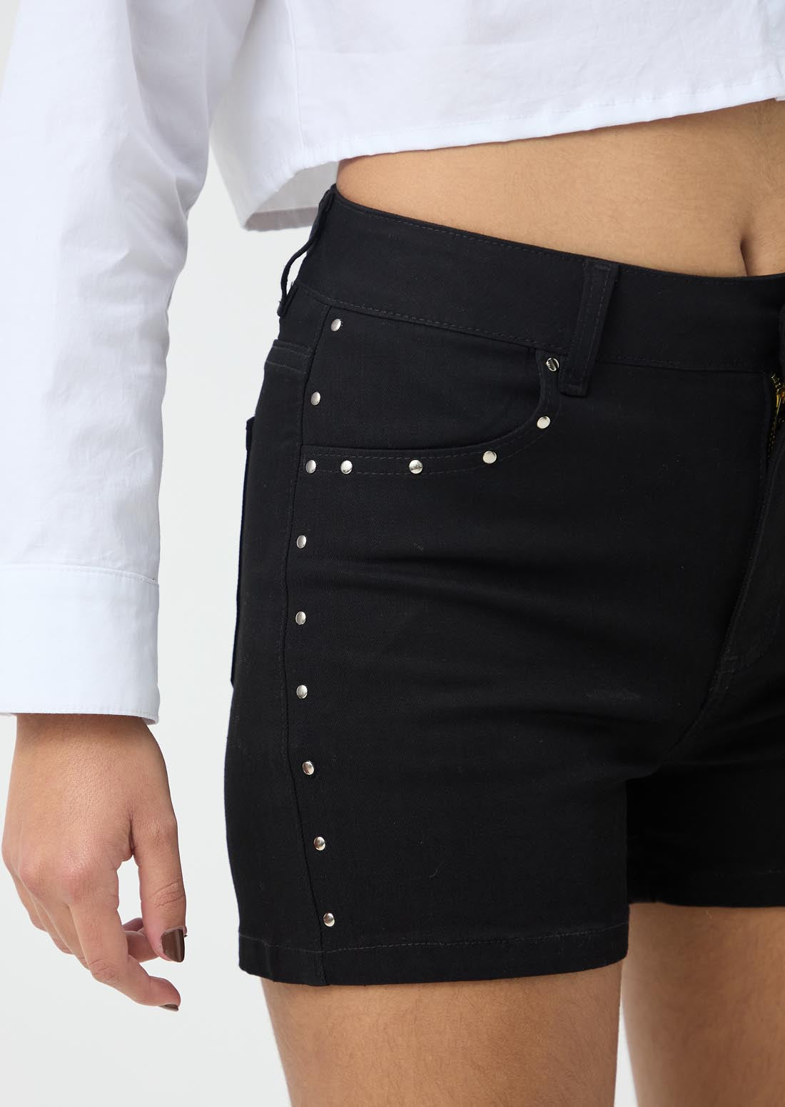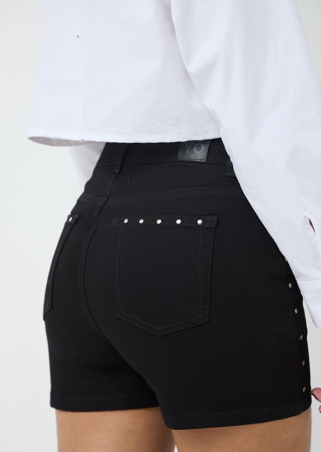 Short tiro alto, lavado negro, en denim y con apliques en los costados para jóvenes.