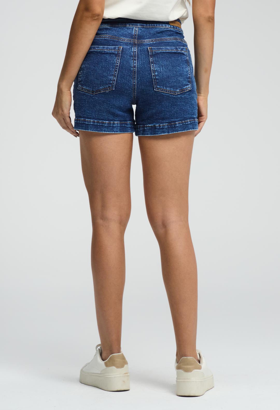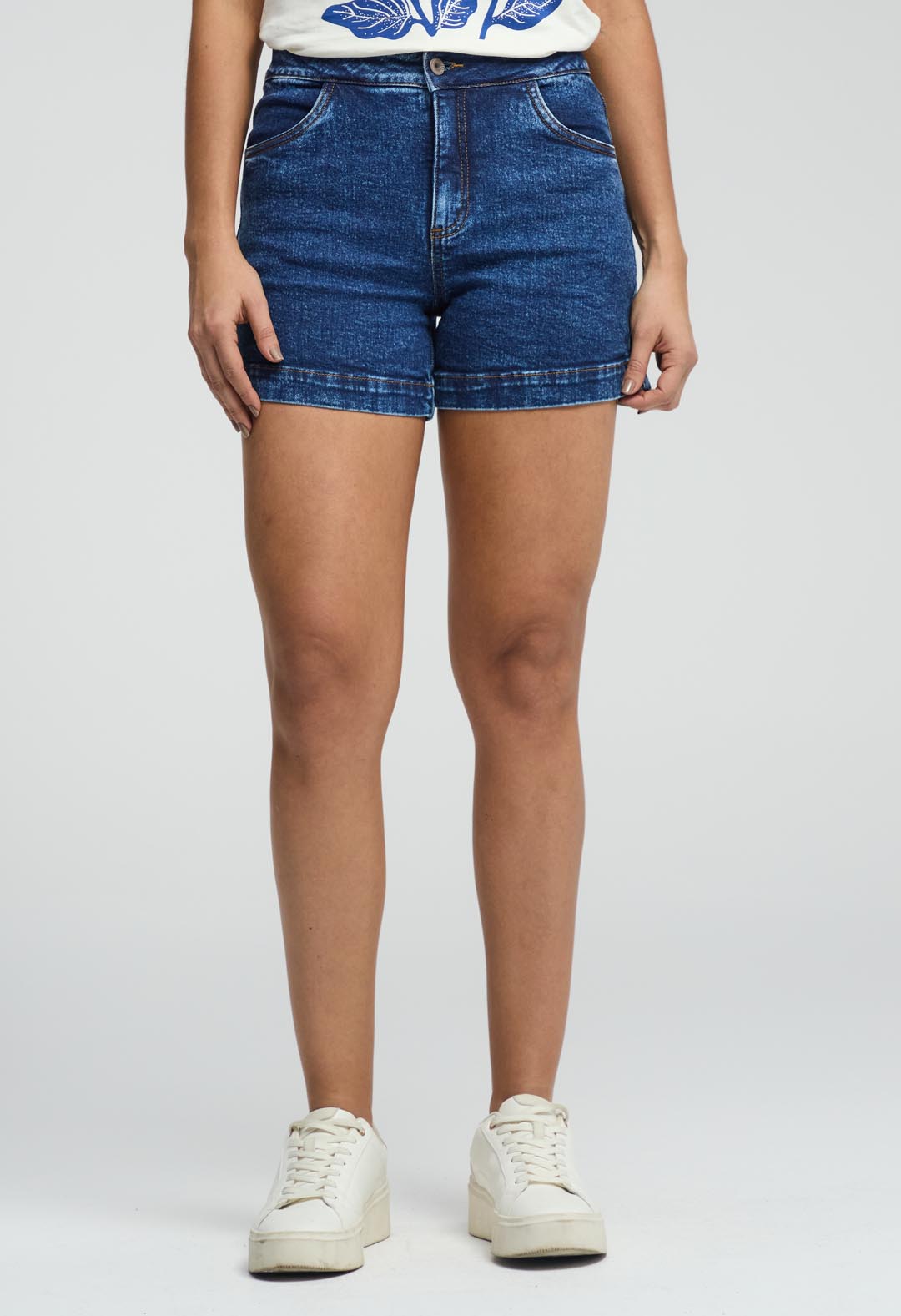 Short tiro alto, lavado oscuro, bolsillos, ruedo ancho y fondo entero para mujeres.