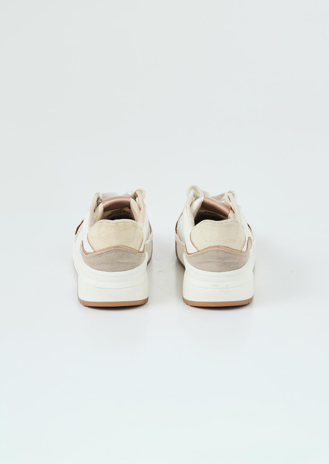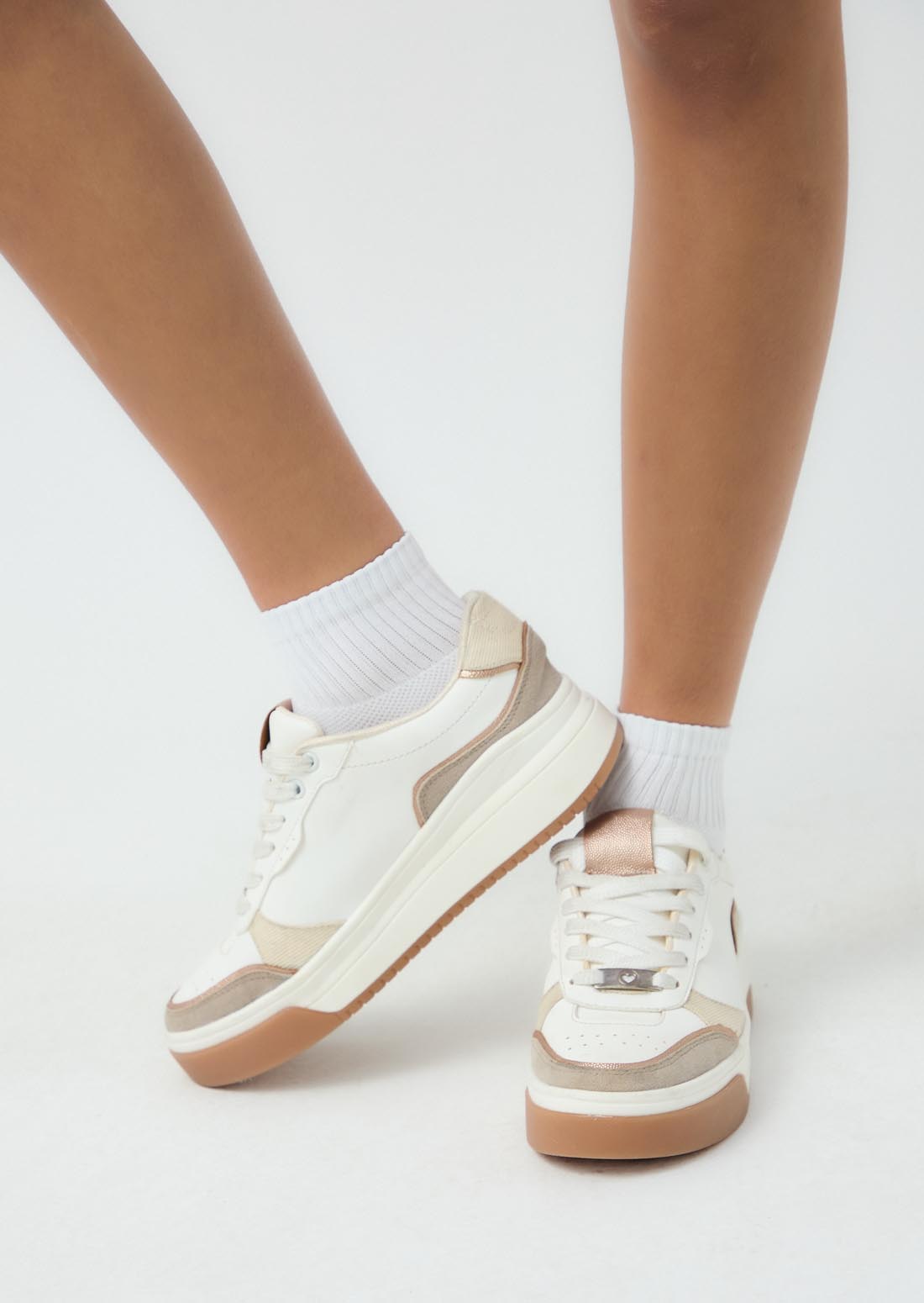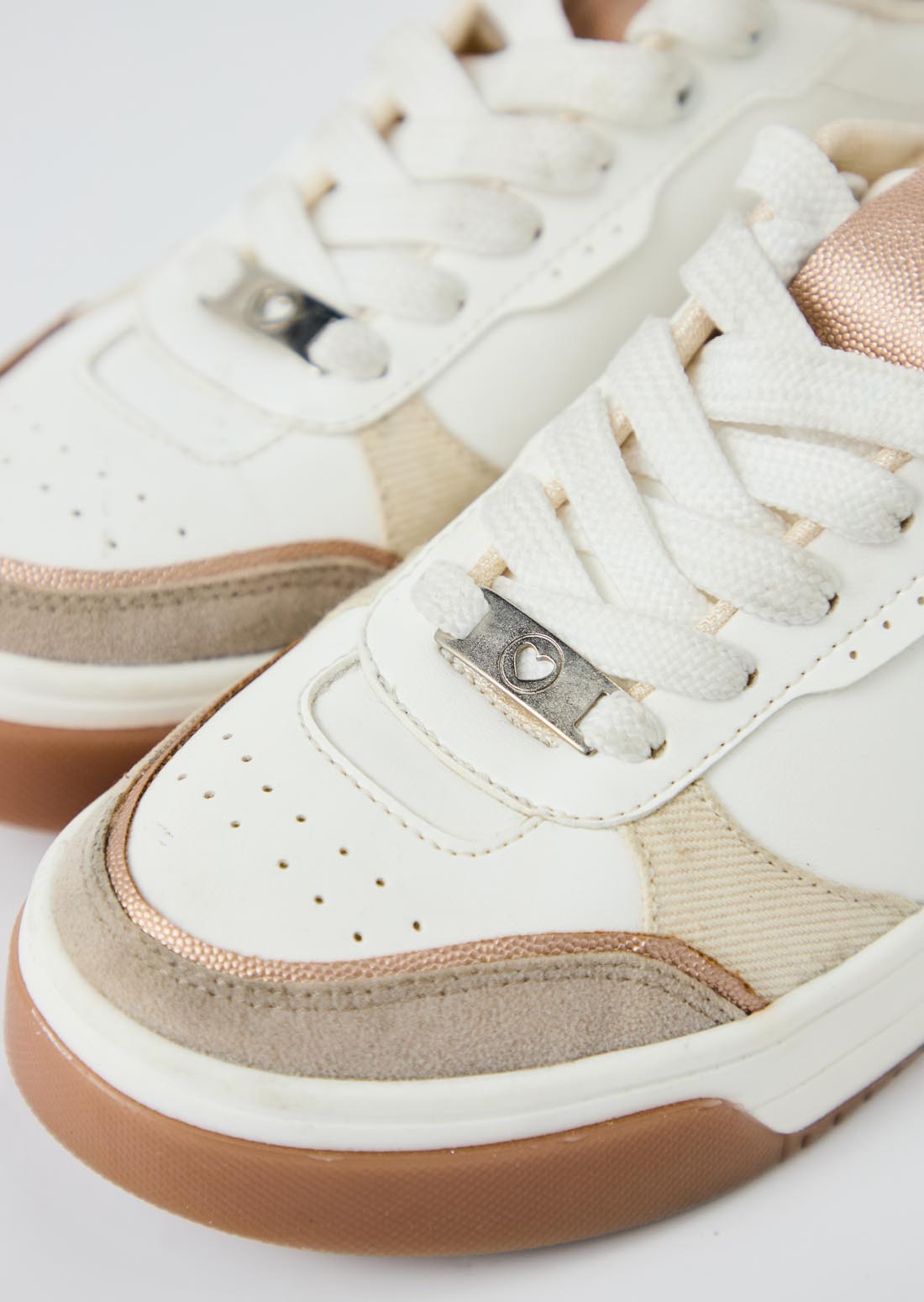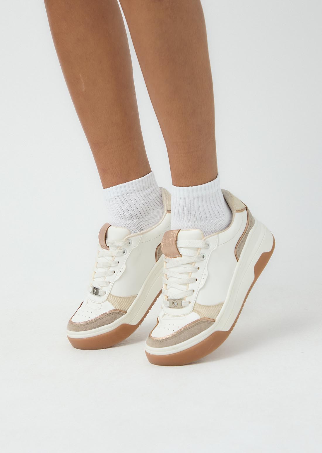 Tenis con pieza en contraste, color arena y detalles metalizados para adolescentes.
