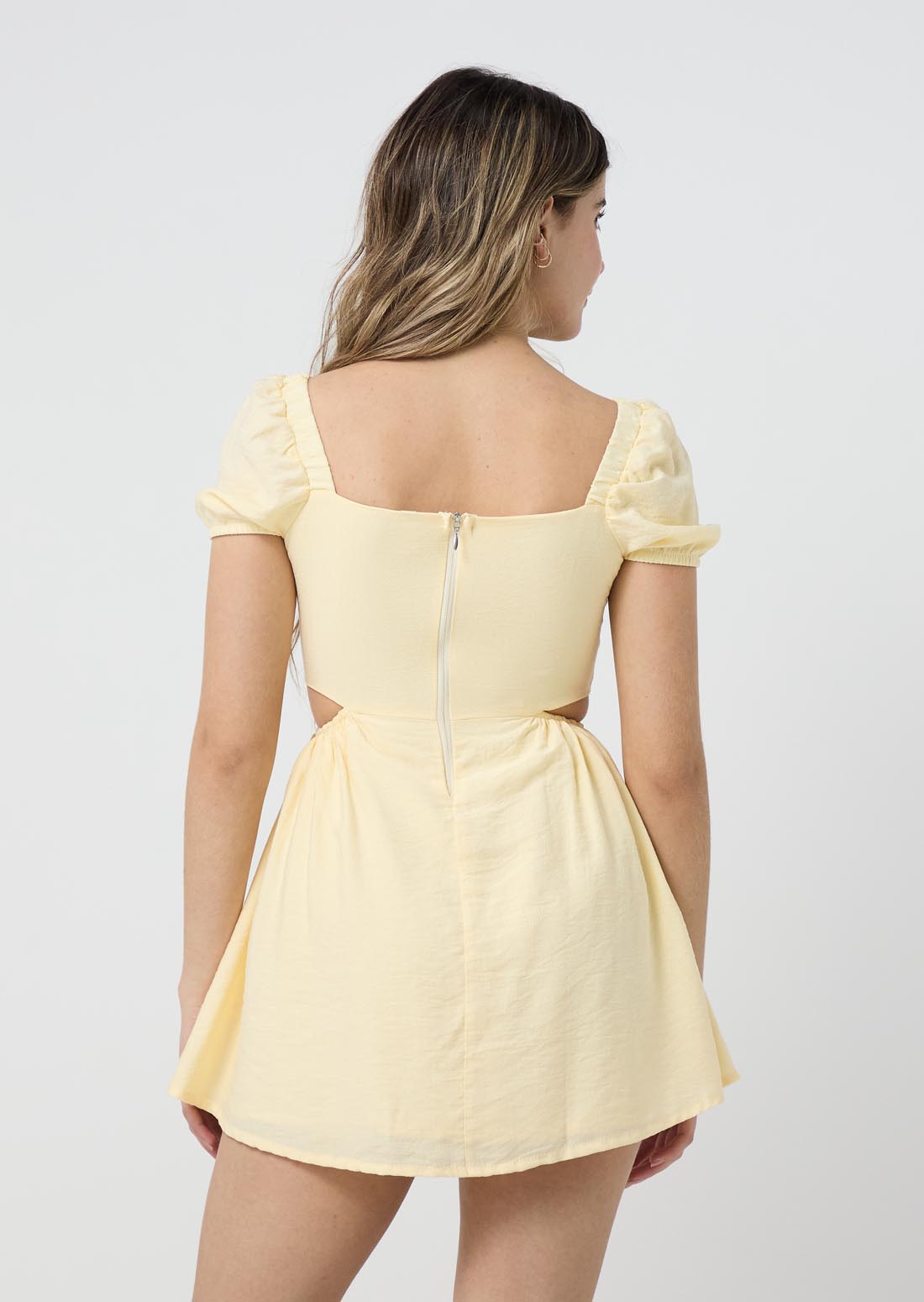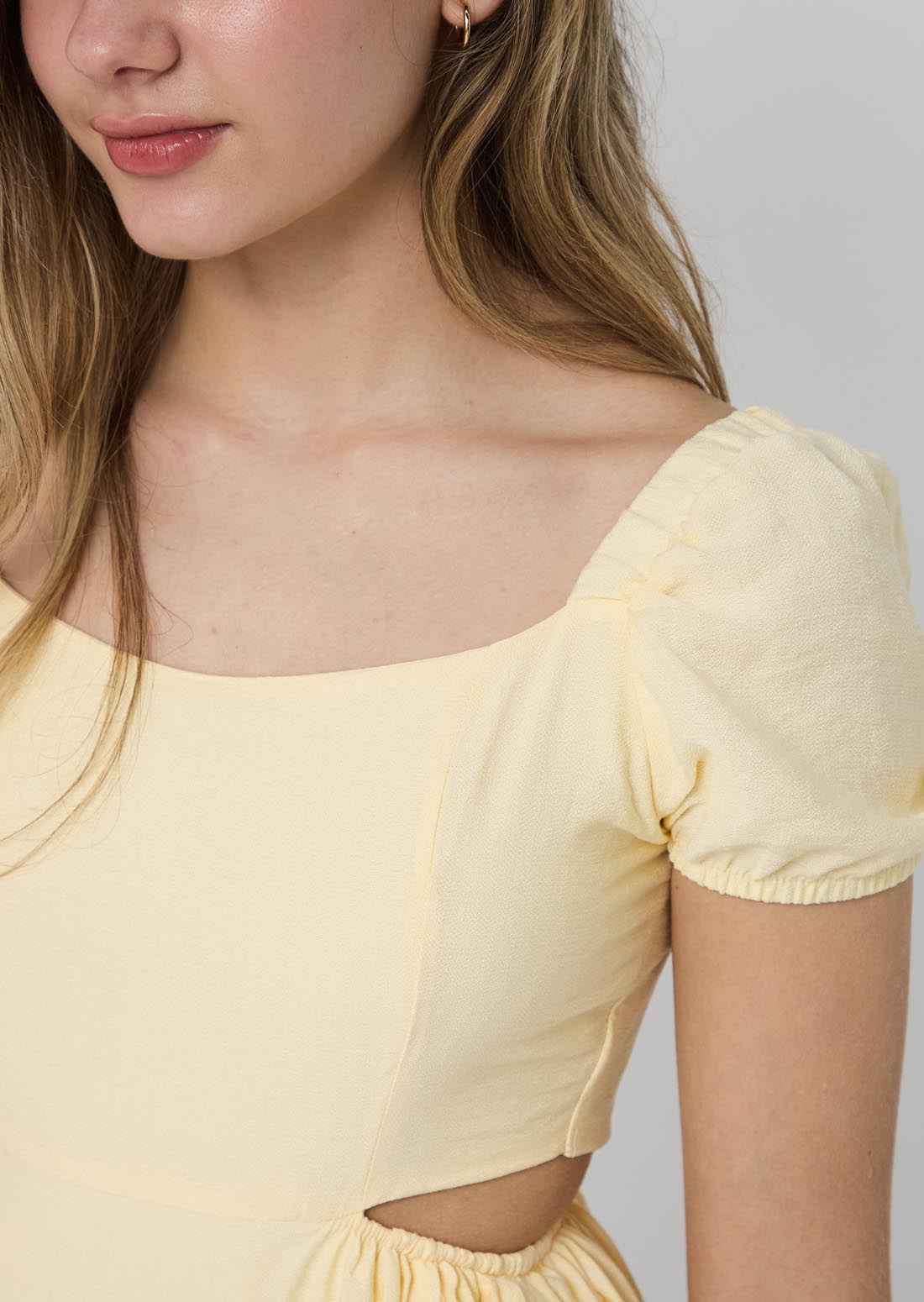 Vestido amarillo pastel con abertura en costados para jóvenes.