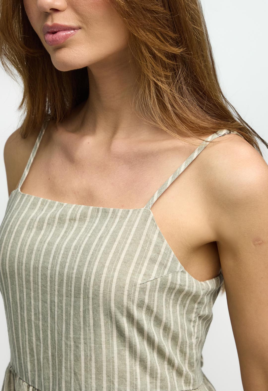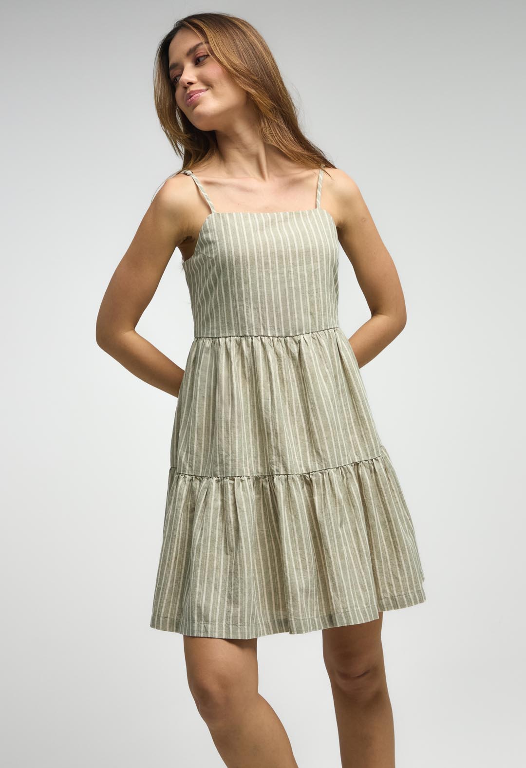 Vestido de tiras, color arena, corto y a rayas para mujeres.