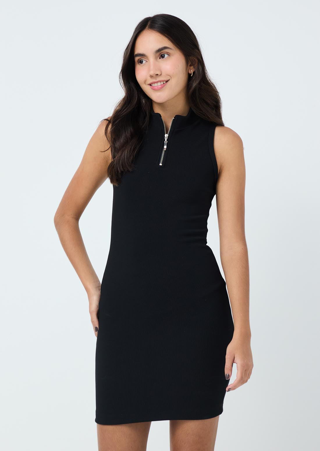 Vestido manga sisa, color negro, en rib, fit ajustado y cierre funcional para jóvenes.